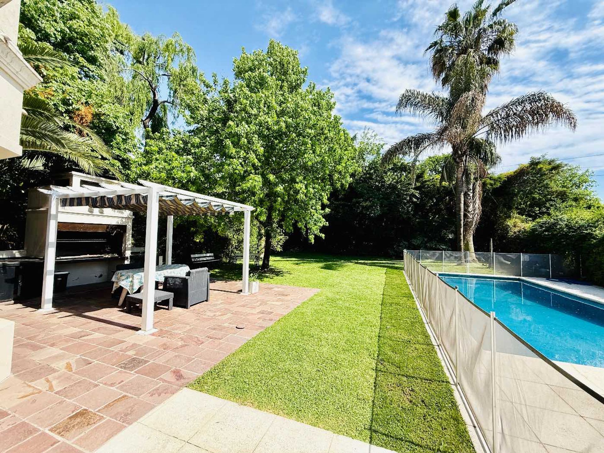 El terreno abarca 810 m² y cuenta con una piscina rodeada de cerco de protección para niños, además de un sector parrilla equipado con hacha de lavar. La zona está completamente parquizada con palmeras y luminaria ambiental.