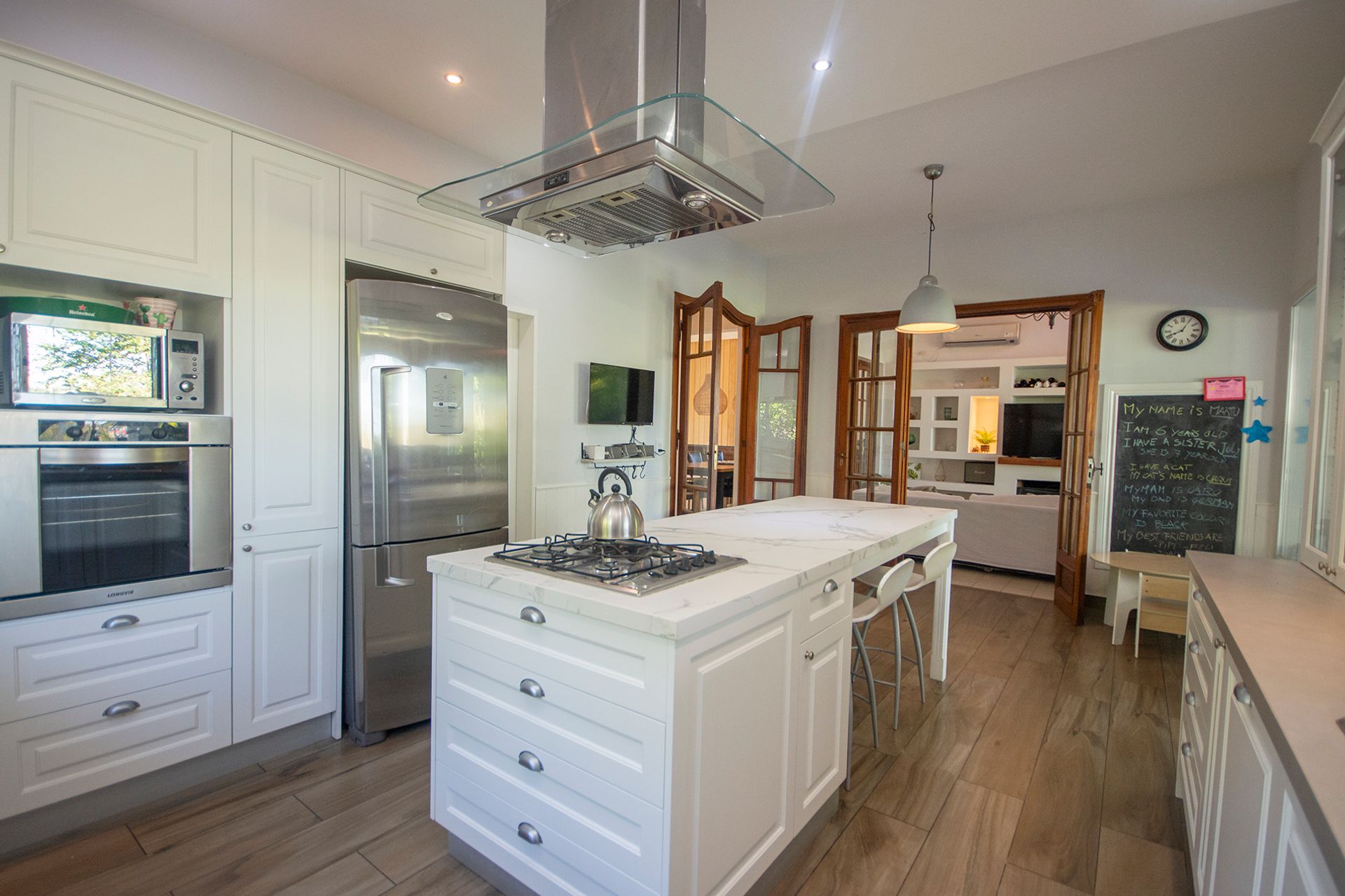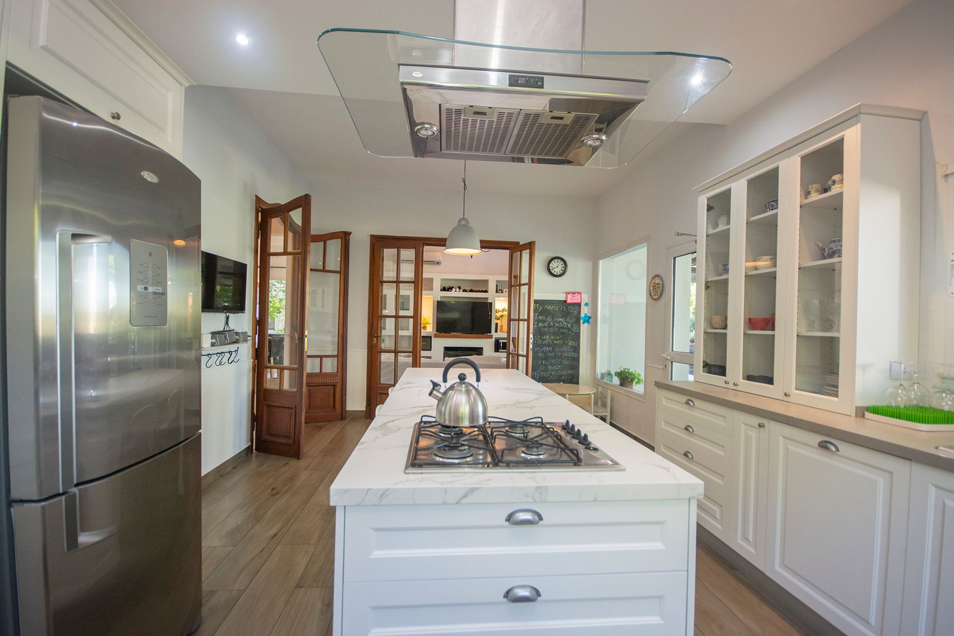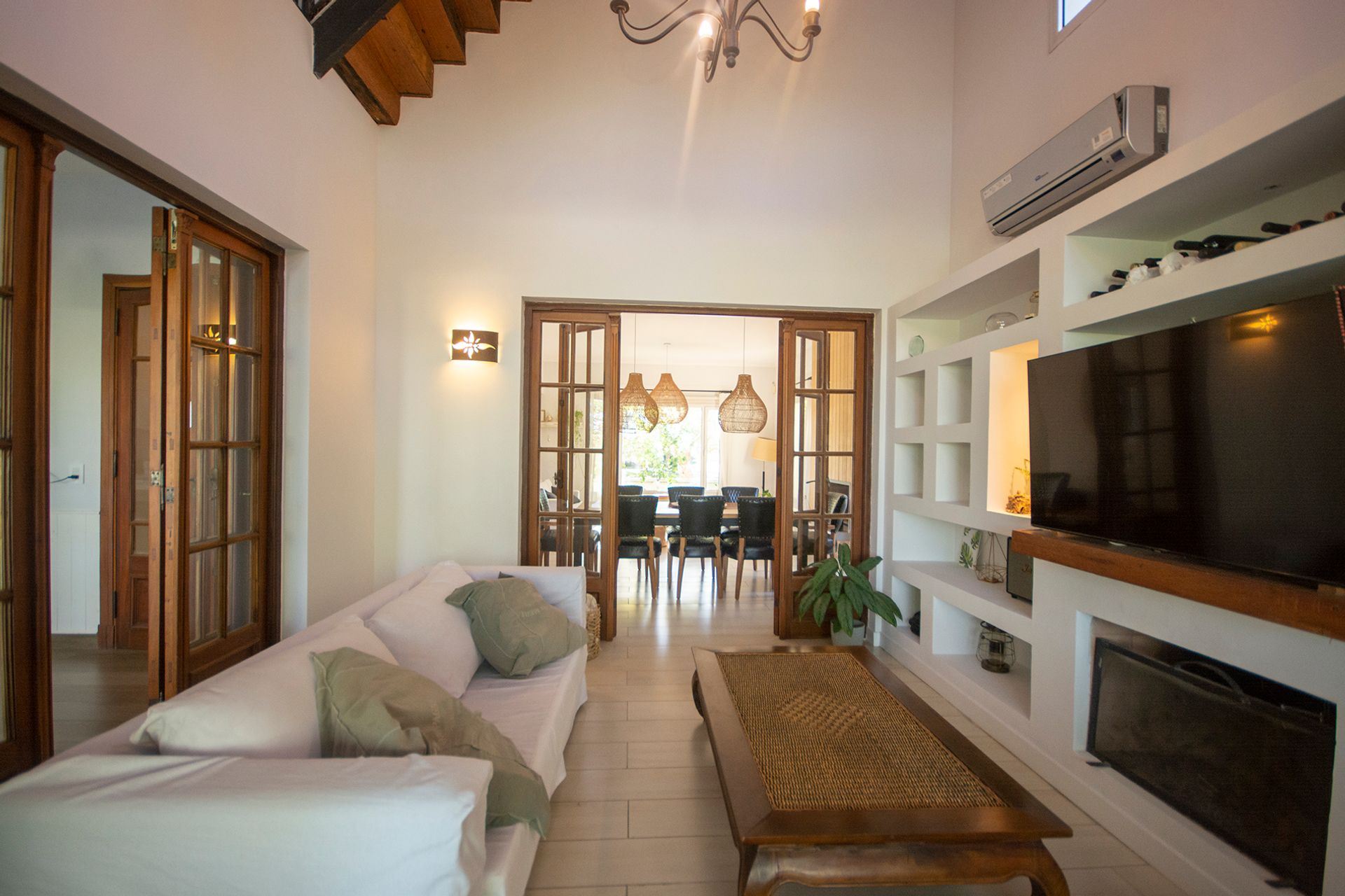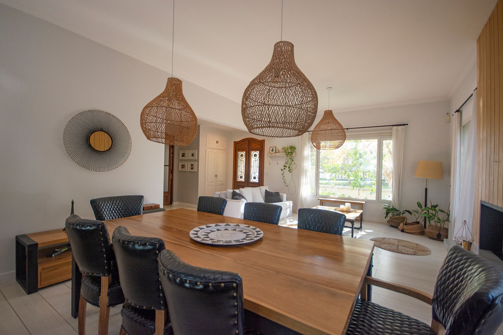 La casa, de dos plantas con altillo y amplios espacios, combina comodidad y elegancia. En la planta baja se encuentra un amplio living‑comedor muy luminoso, con gran ventanal, chimenea y placard de recepción. Un escritorio o dormitorio de huéspedes con entrada independiente brinda flexibilidad. Un espacio dedicado a la familia, con acceso a la galería y al jardín, sirve como playroom o sala de TV. La cocina, moderna y práctica, cuenta con isla central, está completamente equipada y ofrece vista y acceso directo al jardín. Dependencia de servicio con baño completo y lavadero complementan la zona de utilidades.