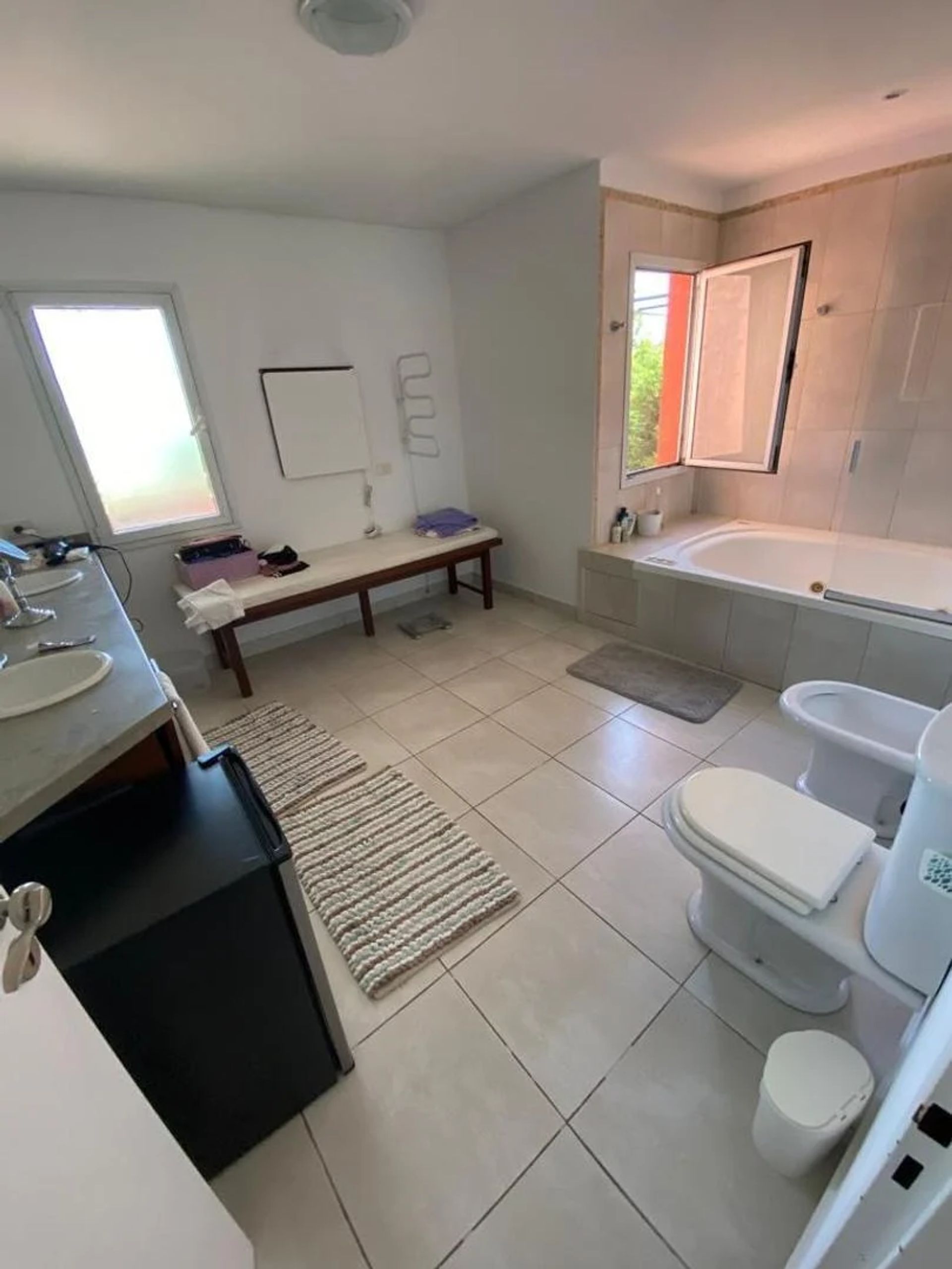 La casa, vacía de muebles, presenta cinco ambientes, una pileta y una parrilla. La planta baja cuenta con una recepción que conduce a un toilette de cortesía, un family room y un living‑comedor con salida a una galería que se abre a la zona de parrilla y al jardín con pileta y fogonero.