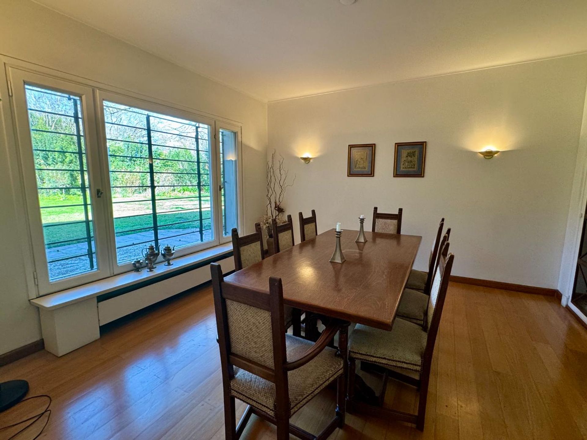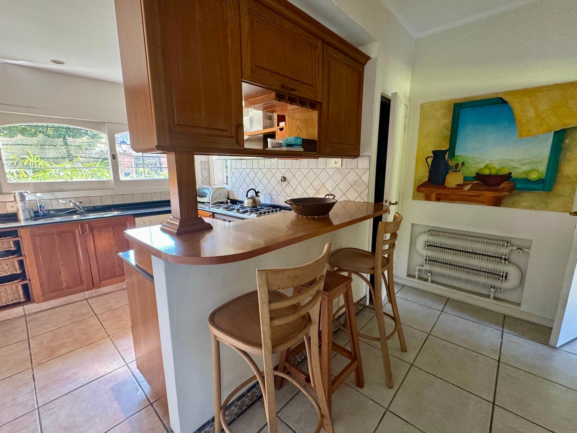 En la planta baja se encuentran tres dormitorios con amplios placards; dos de ellos son suites con baño individual. El dormitorio principal incluye aire acondicionado y un sector de escritorio, mientras que el dormitorio de servicio dispone de baño completo. El living es amplio, con vista al jardín, piso de madera y chimenea, y se conecta a una terraza exterior con toldo. El comedor formal acomoda hasta ocho personas, y también hay un comedor diario para ocho personas con un living pequeño integrado. La cocina cuenta con desayunador, espacio para dos heladeras y lavaplatos, despensa y alacena, además de un lavadero funcional.