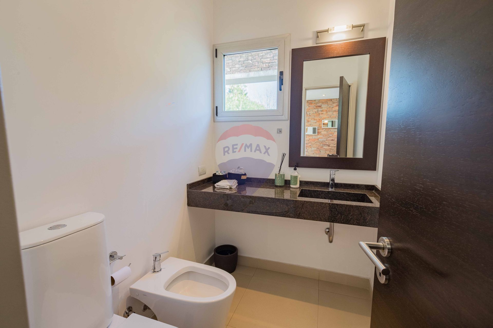 El exterior destaca por la galería con deck de lapacho, la parrilla, la piscina de 4 × 15 m con borde infinito y luces LED, el baño exterior de la pileta y el jardín de dos niveles con riego automático. El depósito exterior de guardado y la salida a la laguna completan la propuesta de vida al agua.