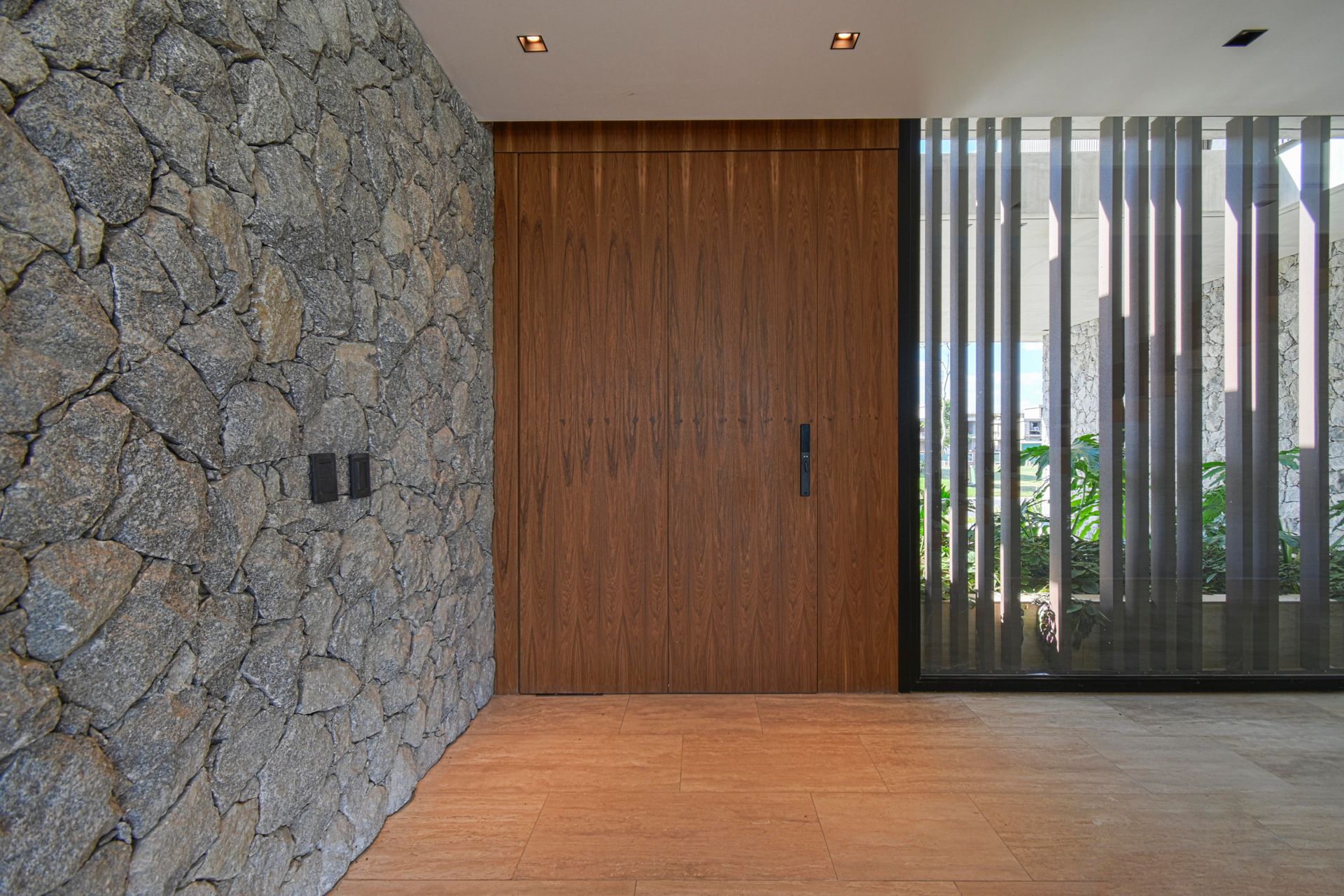 En la planta baja, la entrada abre a un hall de recepción con placard y toilette, seguido por un amplio living comedor con grandes ventanales que invitan a la luz natural y a una vista panorámica del río. El hogar, con pisos de mármol travertino a la veta, complementa la estancia con una chimenea que enmarca la escena acuática. La cocina integrada está equipada con mesada Dekton, muebles enchapados en incienso natural y electrodomésticos de gama alta, incluyendo heladeras panelables, freezer, lavaplatos y horno. El lavadero cuenta con lavarropas, secarropas y acceso independiente, mientras que la zona de servicio facilita la gestión del hogar. Las aberturas Rehau Black Brown de PVC con doble vidrio hermético garantizan eficiencia energética, y la calefacción por loza radiante, la caldera dual y el termotanque aseguran confort durante todo el año. Cuatro equipos de aire acondicionado central completan el sistema de climatización.