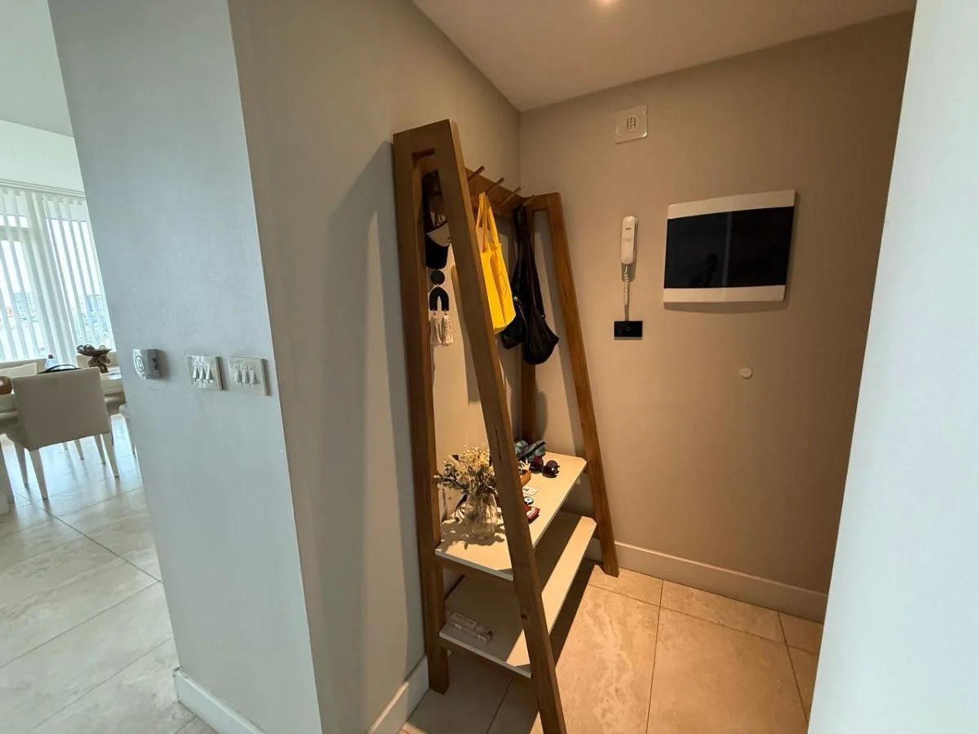El apartamento dispone de tres baños, dos completos con bañera y uno adaptado como toilette con lavadero oculto. Los dos dormitorios cuentan con placard, y uno de ellos incluye un vestidor amplio para vestirse cómodamente. Cada ambiente abre al balcón corrido de 12 x 1,40, con doble vidrio que garantiza aislamiento térmico y acústico.