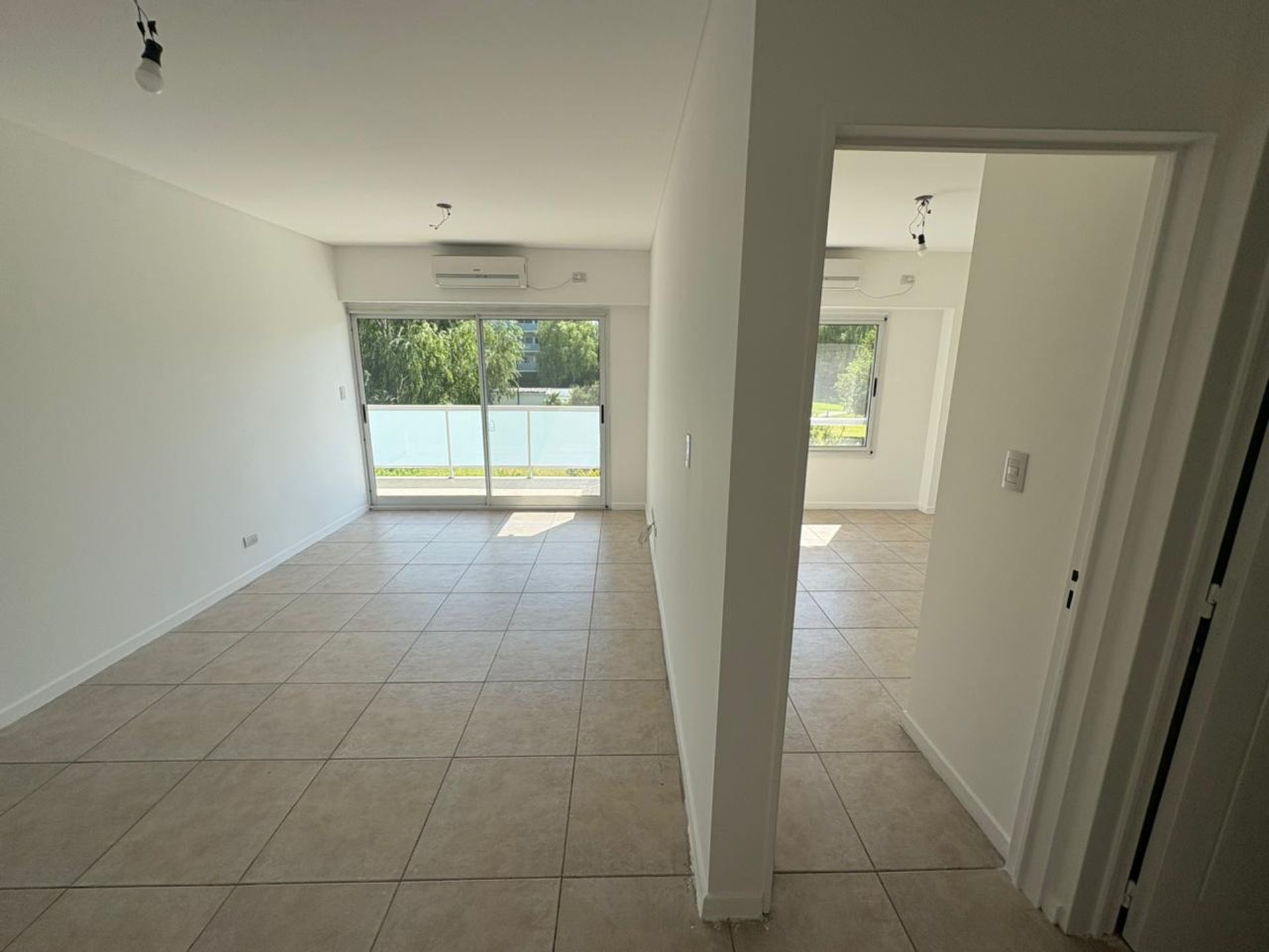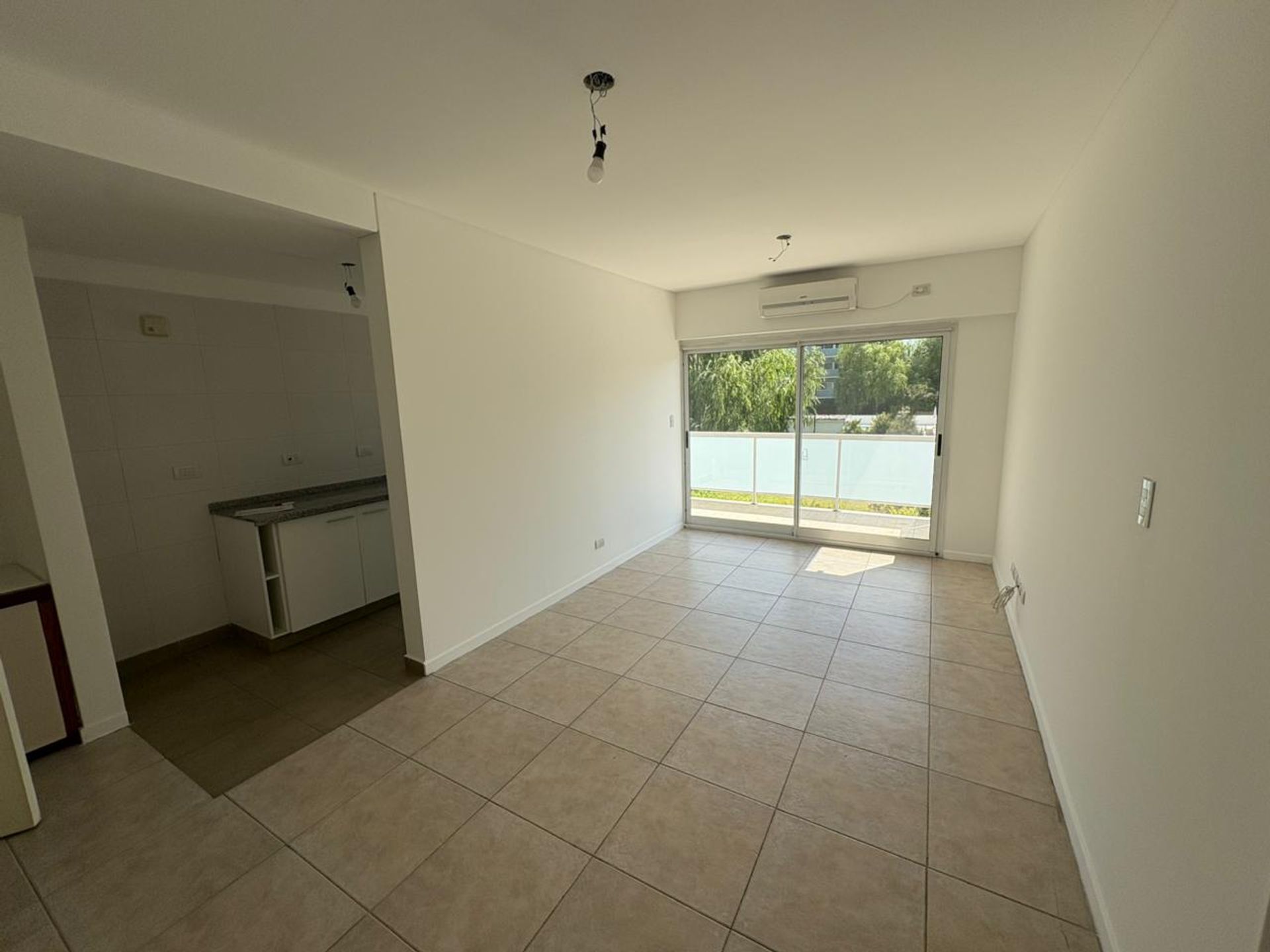 La unidad, situada en primer piso con acceso por ascensor, combina un amplio living comedor con salida a un balcón de grandes dimensiones que ofrece una vista abierta al centro del complejo.