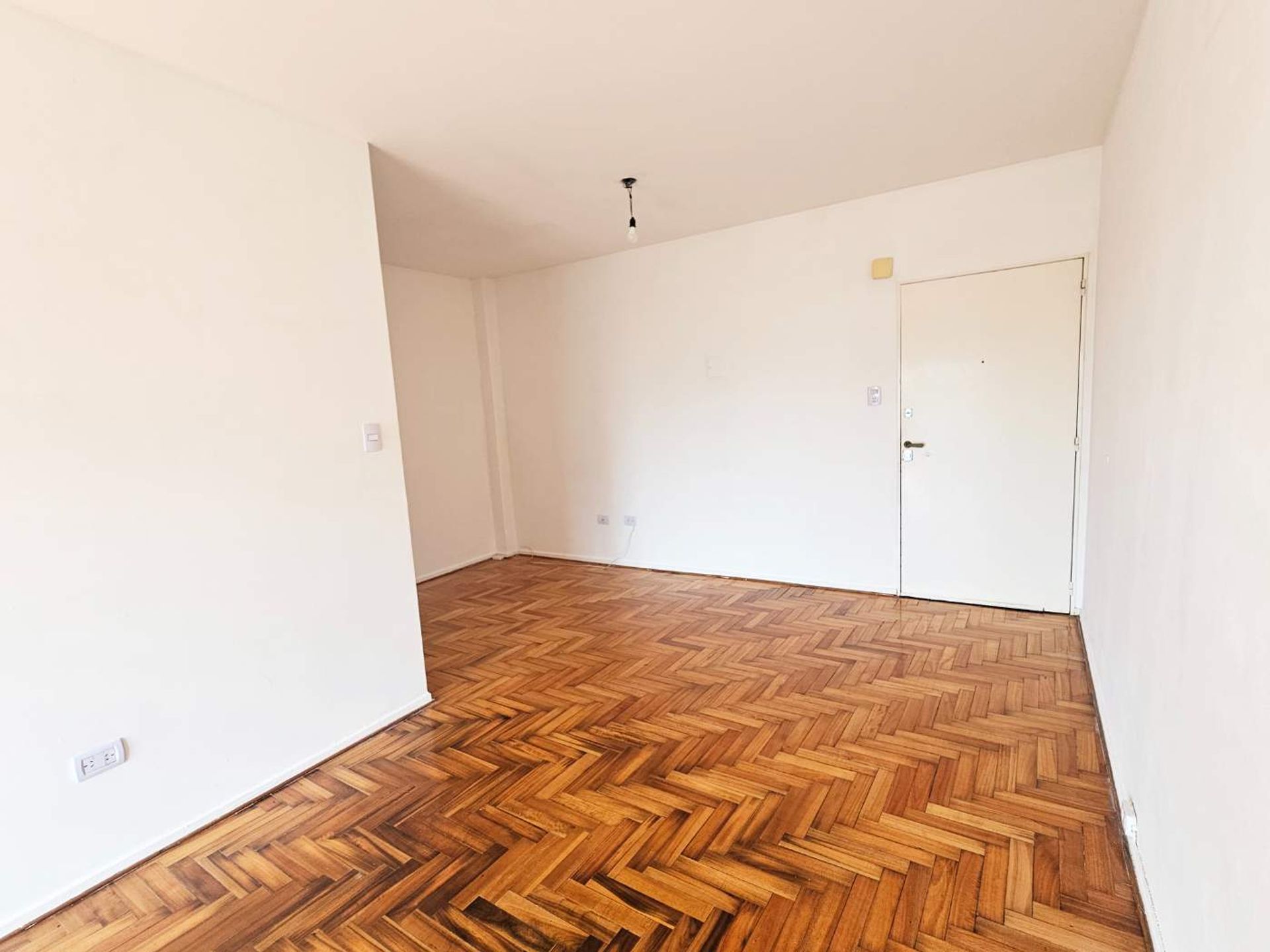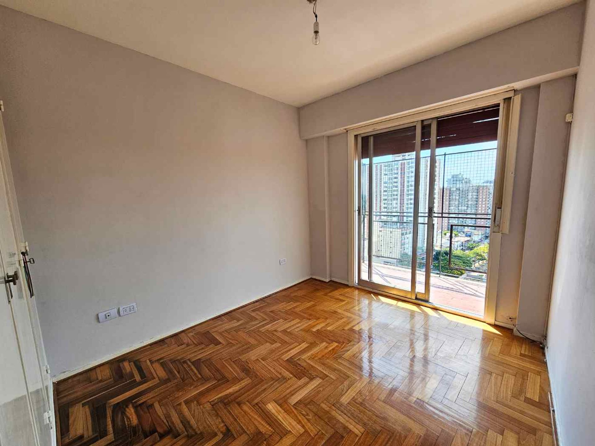El interior cuenta con dos dormitorios equipados con persianas y placares empotrados, un amplio living/comedor que se abre a la ventana-portal del balcón, y una cocina funcional con muebles bajo mesada, alacenas y cocina a gas. Se dispone de espacio suficiente para heladera y lavarropas. El baño completo incluye bañera. La vivienda dispone de calefón y dos ascensores que facilitan el acceso.