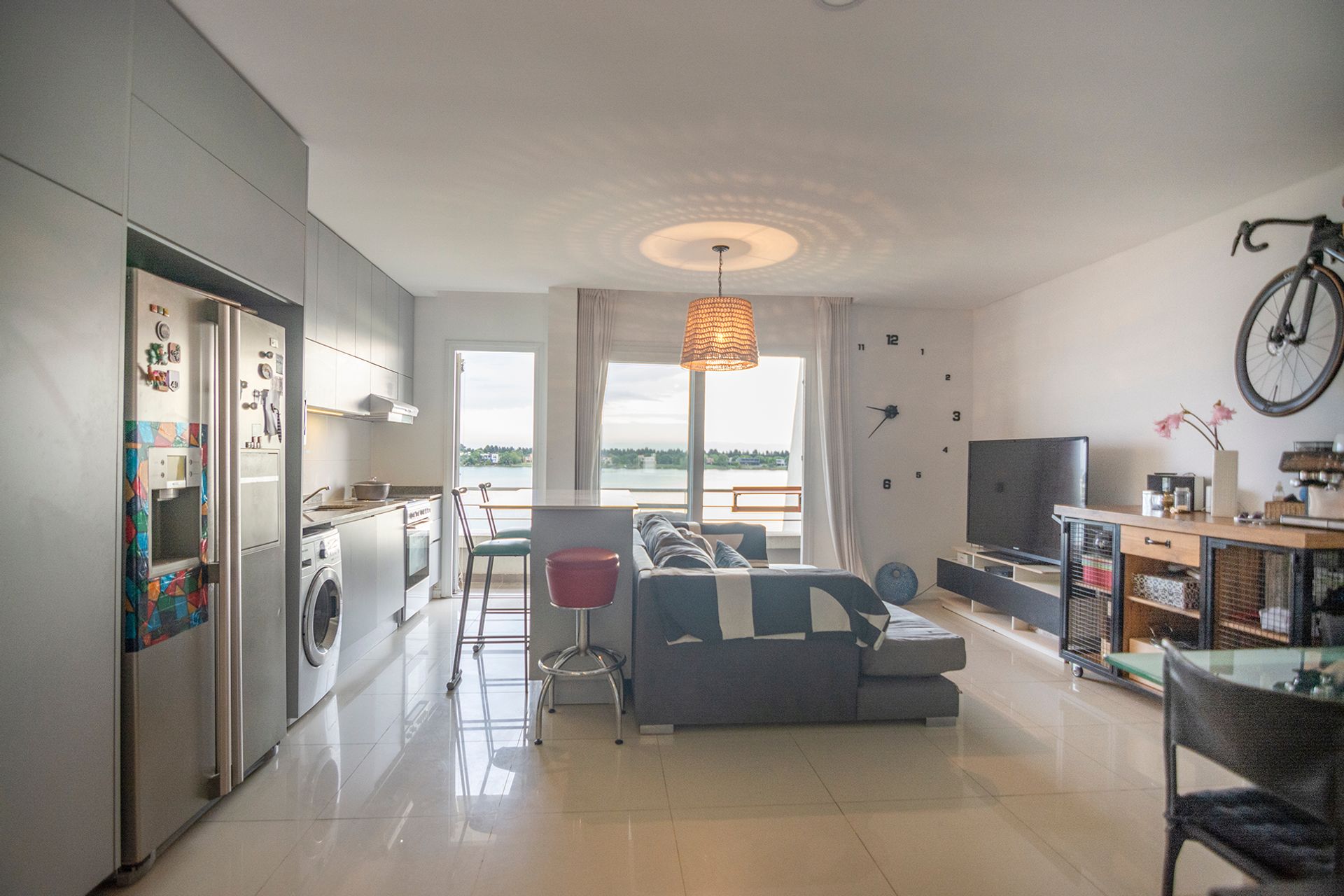 Departamento de 3 ambientes, ubicado en el segundo piso del complejo Vila Vela, con una superficie aproximada de 90 m². Al ingresar se abre una pequeña recepción que conduce al amplio living comedor, con cocina integrada y un espacio pensado para lavarropas; los muebles de alto y bajo están acompañados de una mesada funcional. Desde la zona de comidas se accede al balcón a través de tres paneles de apertura, donde se puede disfrutar de una espectacular vista a la laguna de Santa Clara