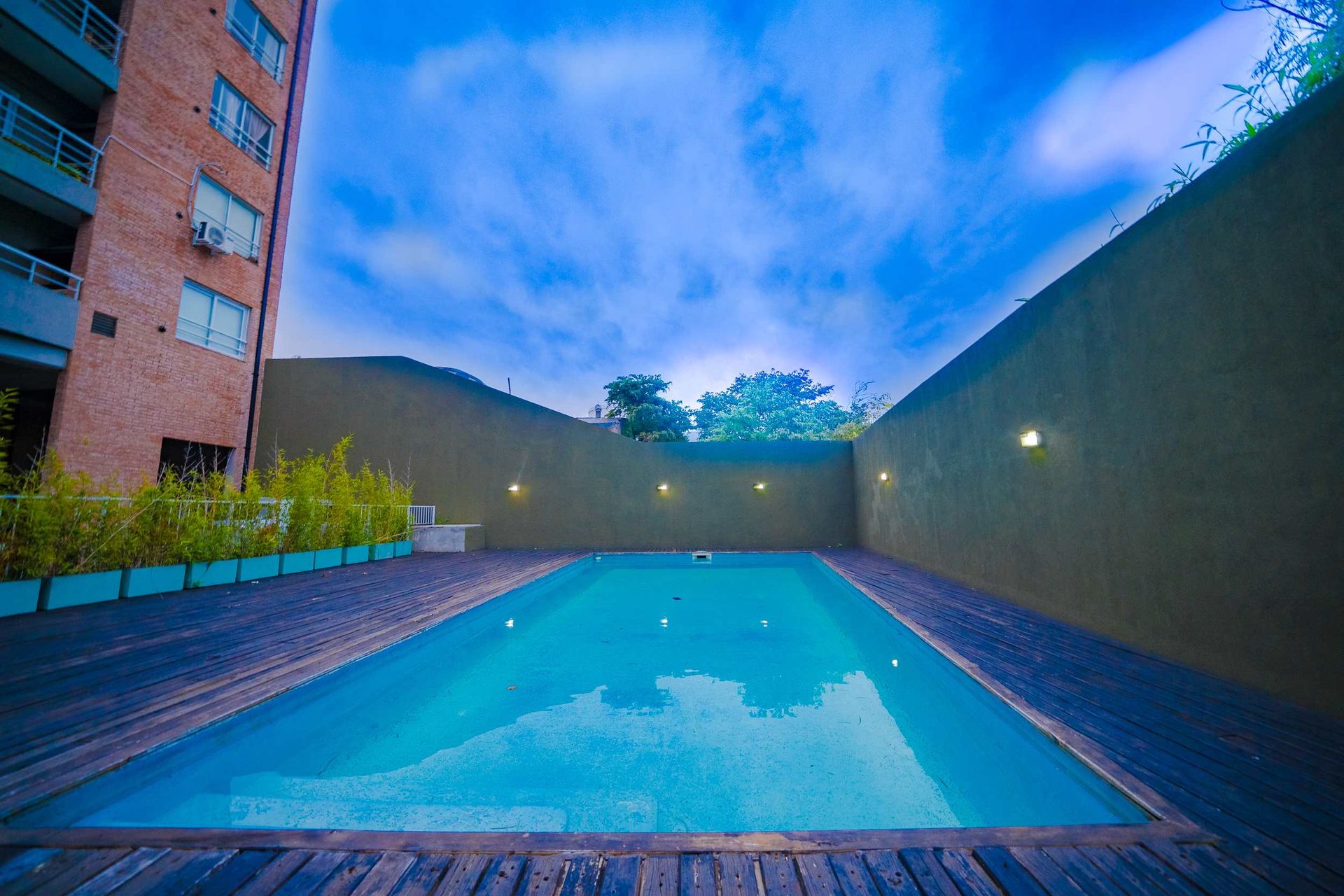 El complejo, desarrollado en dos cuerpos, sitúa el departamento frente al segundo bloque, con vista abierta gracias a la gran separación entre ambos módulos.