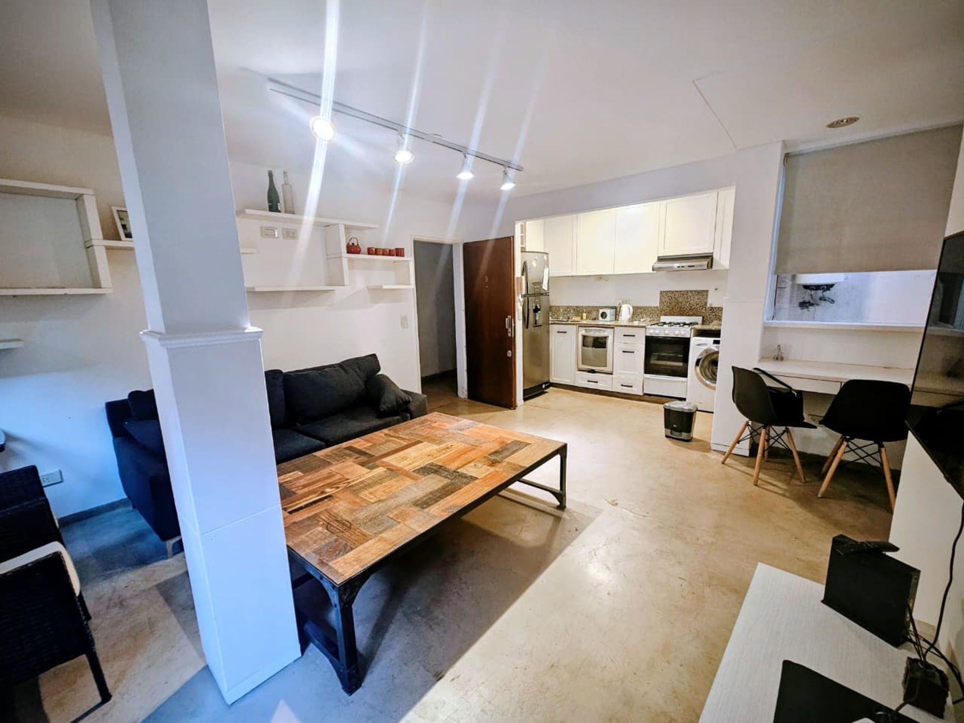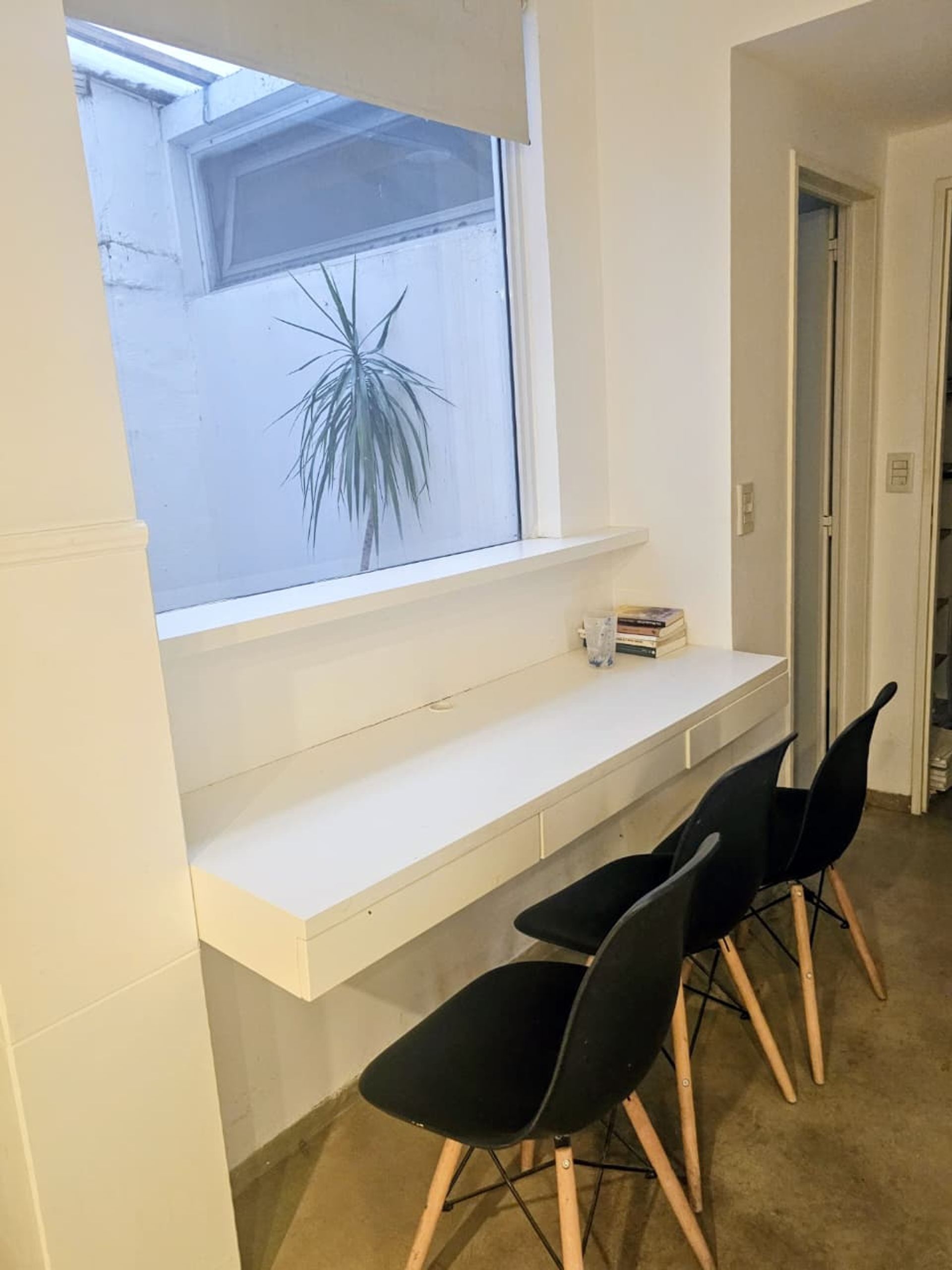El salón, con aire acondicionado, cuenta con televisión, sillas, mesa ratona y un ambiente acogedor. Además, dispone de un espacio de trabajo con escritorio y sillas, ideal para quienes necesitan un lugar dedicado al estudio o al trabajo remoto.