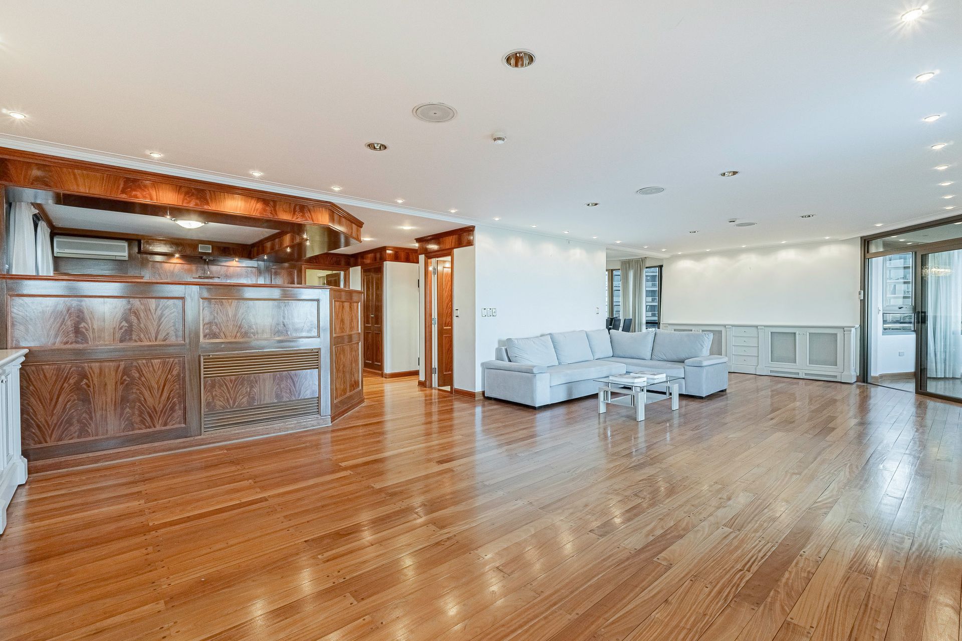 El edificio de categoría alta presenta un hall de entrada que conduce a un amplio living comedor y a un escritorio de trabajo. La vivienda cuenta con cuatro dormitorios, dos de ellos en suite; el dormitorio principal incluye sauna, ducha escocesa y jacuzzi. Además dispone de tres baños completos y un toilette adicional. La cocina está equipada con artefactos modernos, mientras que el comedor diario y la dependencia de servicio ofrecen comodidad y funcionalidad. Un lavadero y un family completan el espacio de servicio.
