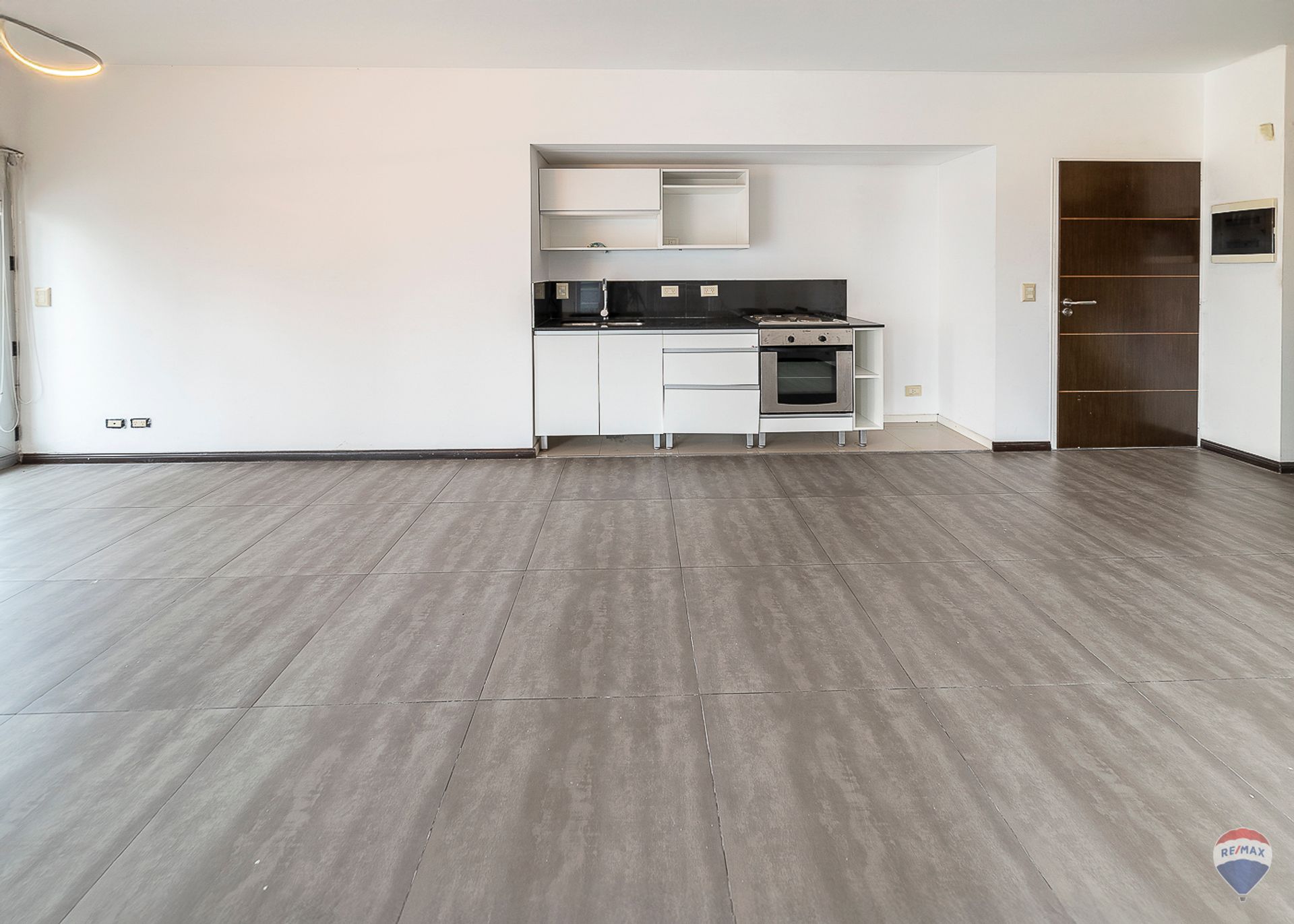 Departamento de una sola habitación con ventanales que ofrecen una vista abierta y luminosa. La cocina está integrada y cuenta con anafe eléctrico, horno empotrado, muebles altos y bajos y una mesada de diseño. El espacio dispone de aire acondicionado y cortinas roller blackout a medida para controlar la luminosidad y el confort térmico. Un placard interior con puerta espejo añade funcionalidad y estilo.