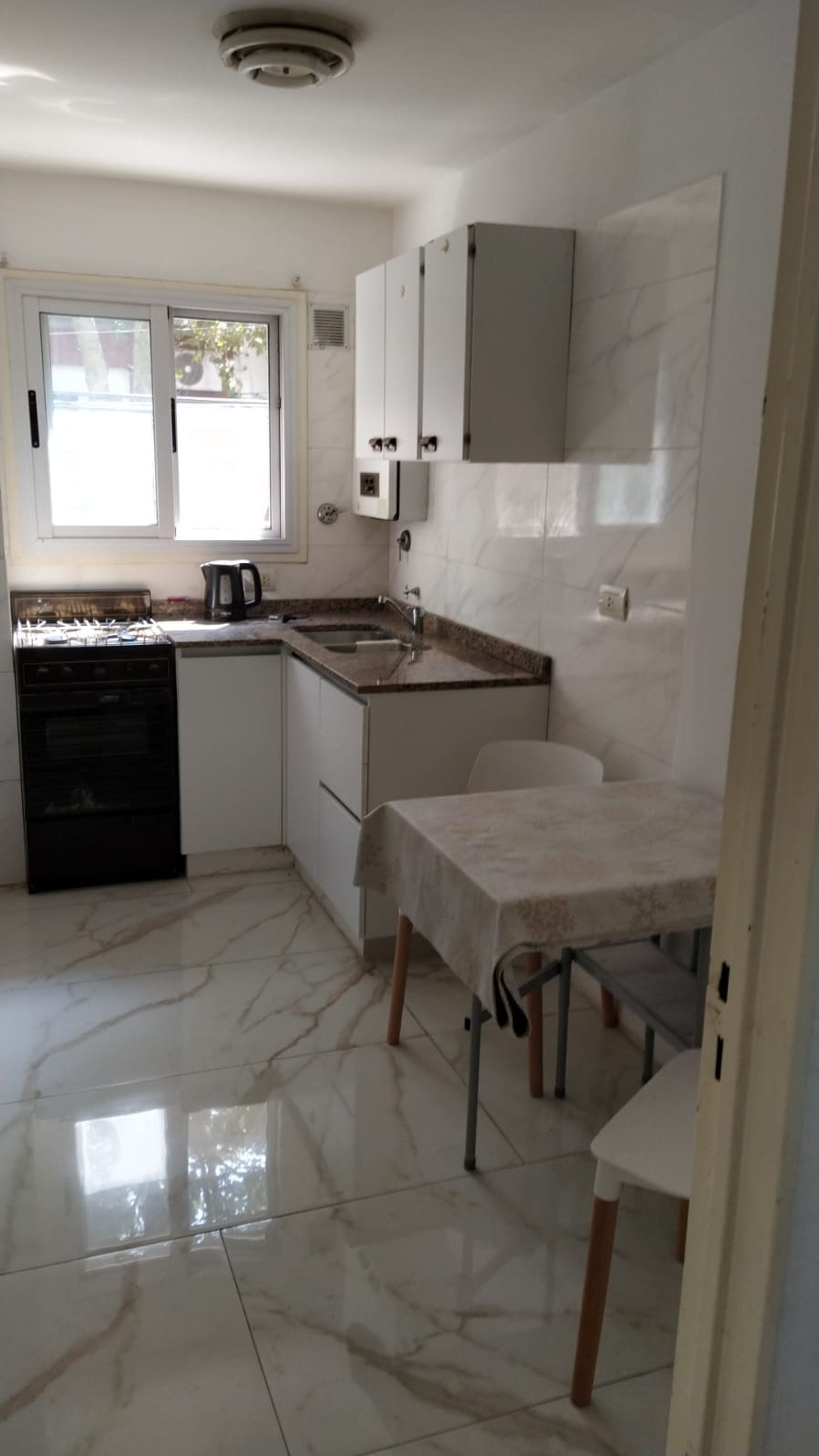 El inmueble ha sido completamente renovado, presentando un elegante piso de porcelanato que realza la luminosidad del espacio. La habitación principal, amplia y con vistas a la calle Sarmiento, brinda un ambiente sereno y privado. El living, igualmente amplio, se beneficia de abundante luz natural, creando un espacio acogedor para la vida cotidiana y la hospitalidad. Cocina y baño completos están equipados con acabados modernos y funcionales, asegurando comodidad y estilo.