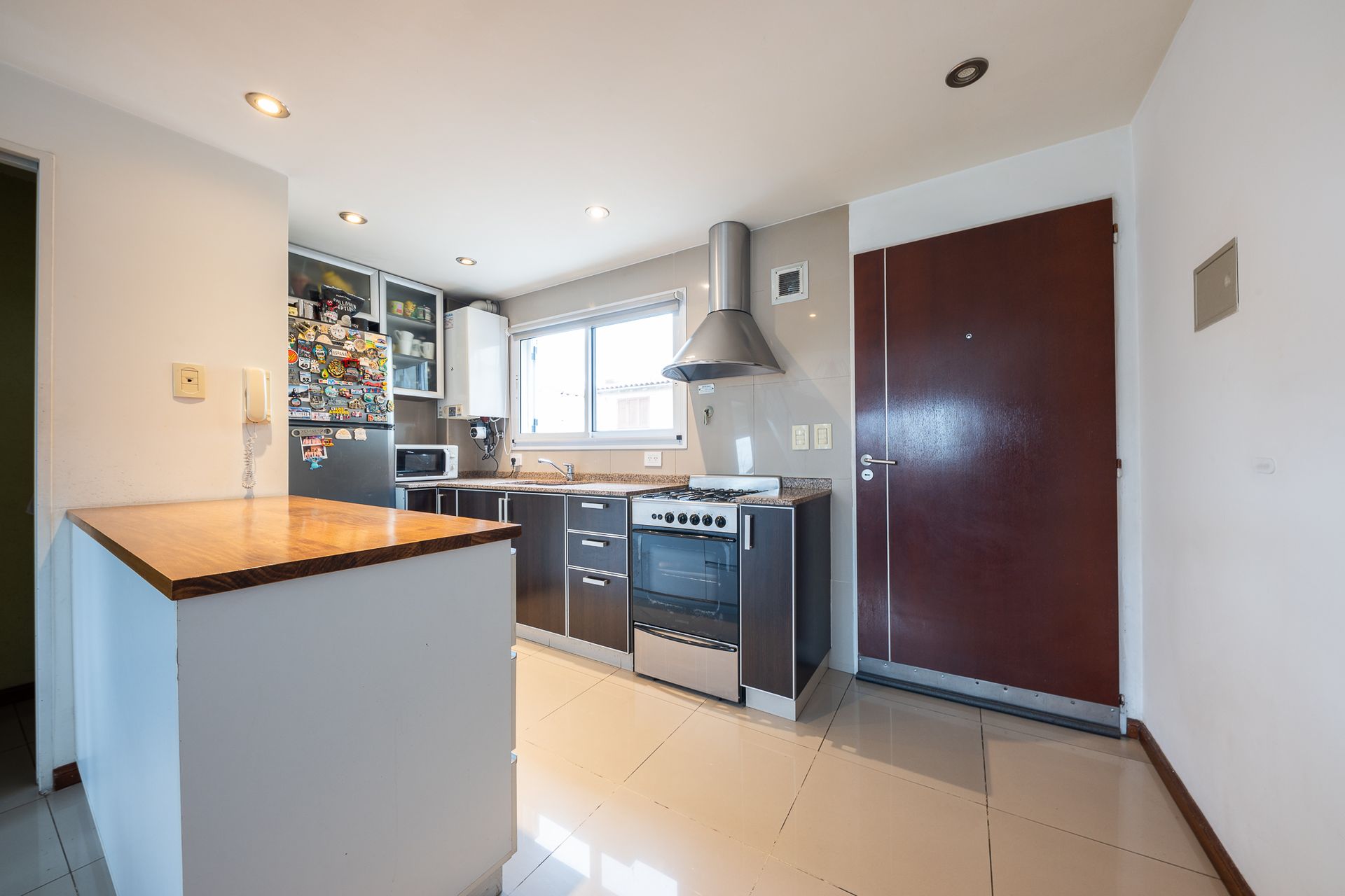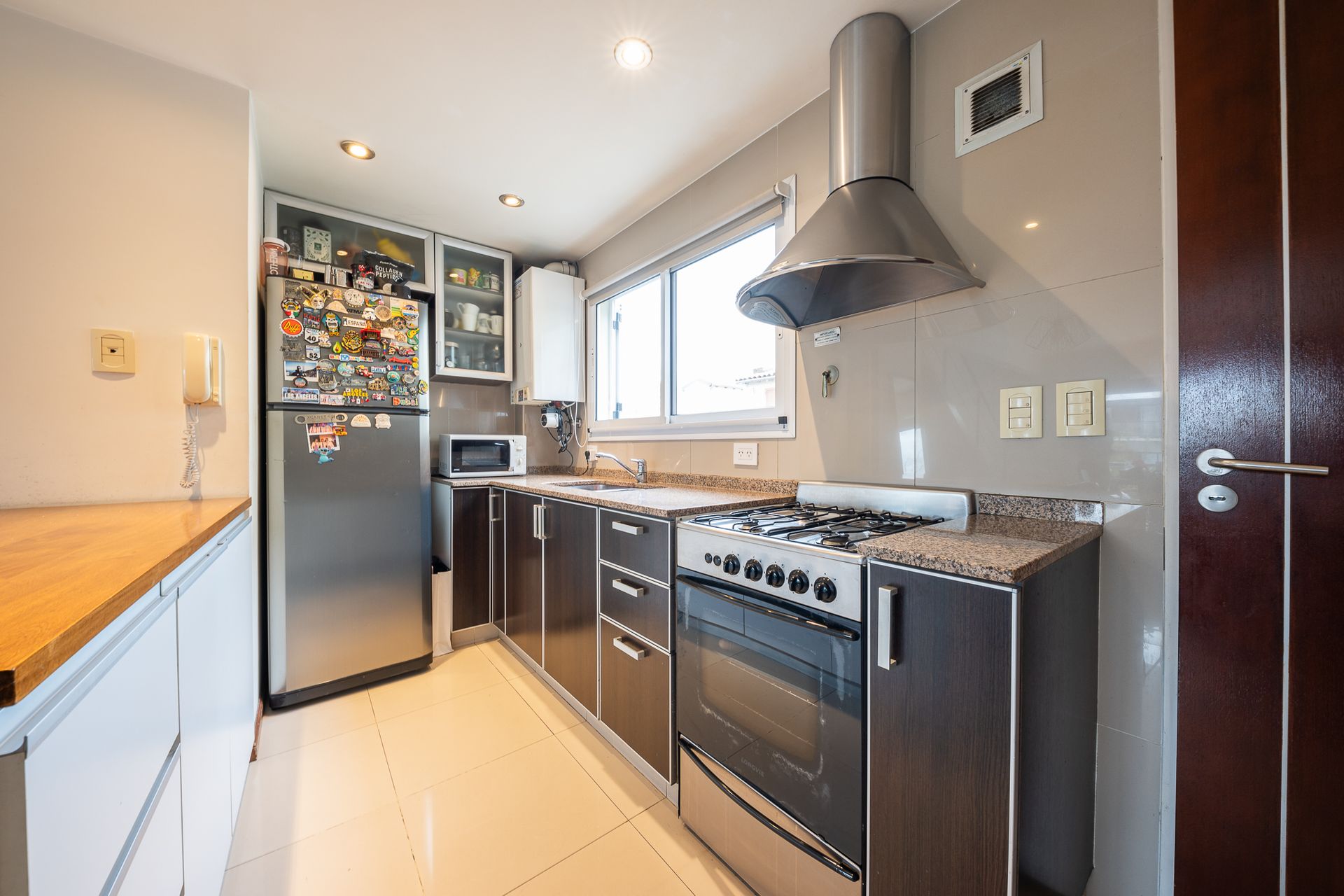 La primera planta alberga una cocina integrada, un amplio living-comedor y un balcón. En el mismo nivel se encuentra un toilette.