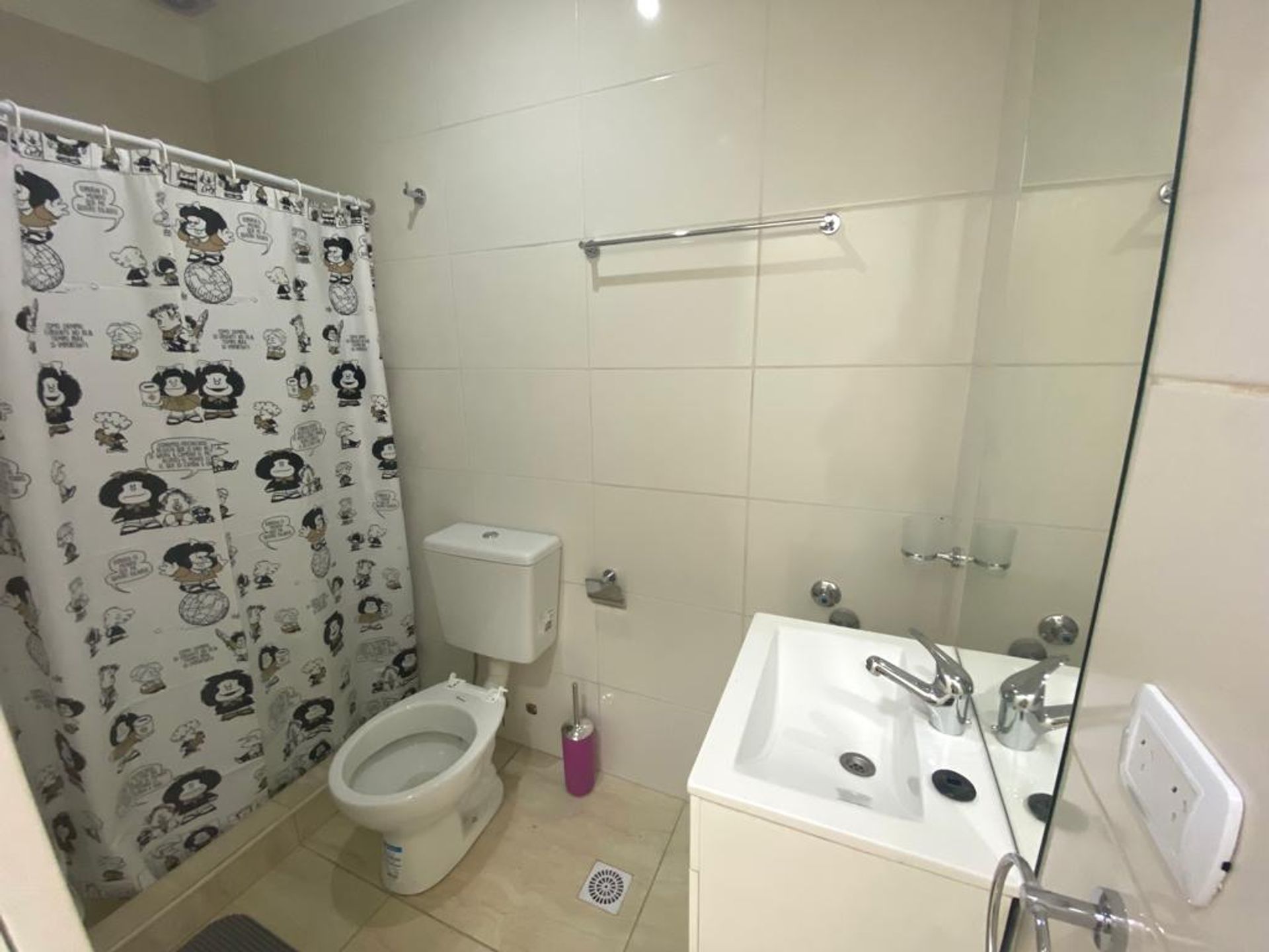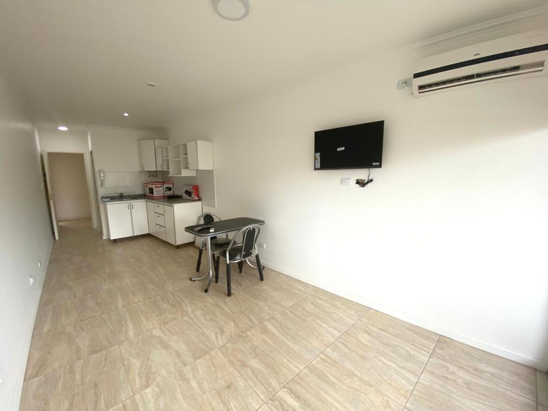 La vivienda dispone de cocina equipada con anafe y horno eléctrico, baño con ducha, aire acondicionado con funciones de frío y calor, y una salida a balcón con ventana corrediza y cortina blackout. Se incluyen mesa con cuatro sillas, soporte de TV y vajilla.