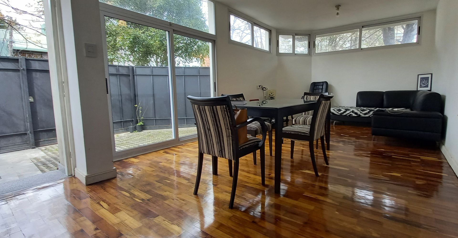 El amplio living comedor, con pisos de parquet y doble ventanal de piso a techo, se abre a un patio interior y a la terraza superior. La cocina, de 2,7 m × 2,5 m, cuenta con doble mesada, alacenas superiores e inferiores, extractor de aire y doble pileta de acero. Un toilette de recepción complementa la zona social. El garaje descubierto, con capacidad para dos autos y portón eléctrico, brinda acceso por ambas calles.