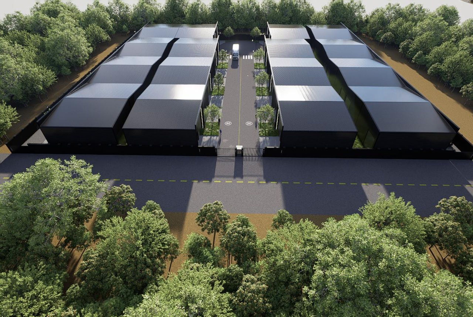 La estructura cuenta con una platea entoscada de 30/40 cm de espesor y aislamiento de polietileno de 200 micrones. La base de hormigón H30 de 15 cm garantiza estabilidad, mientras que las paredes y revestimientos de chapa negra calibre 25 mm ofrecen robustez y estética contemporánea. La aislación interna combina aluminio con espuma de 10 mm, y las columnas, ancladas a la base de hormigón, se complementan con cerchas de hierro ADN 10/16 de 200 × 220 mm. El techo, de perfilería en hierro galvanizado, incluye aislamiento con doble aluminio, canaletas de desagüe y cenefas de vista. La cortina principal enrollable motorizada eléctrica mide 6,00 × 4,50 m de altura, controlada a distancia, y la puerta ciega de acceso peatonal de 1 m de ancho facilita la entrada de personal y equipos.