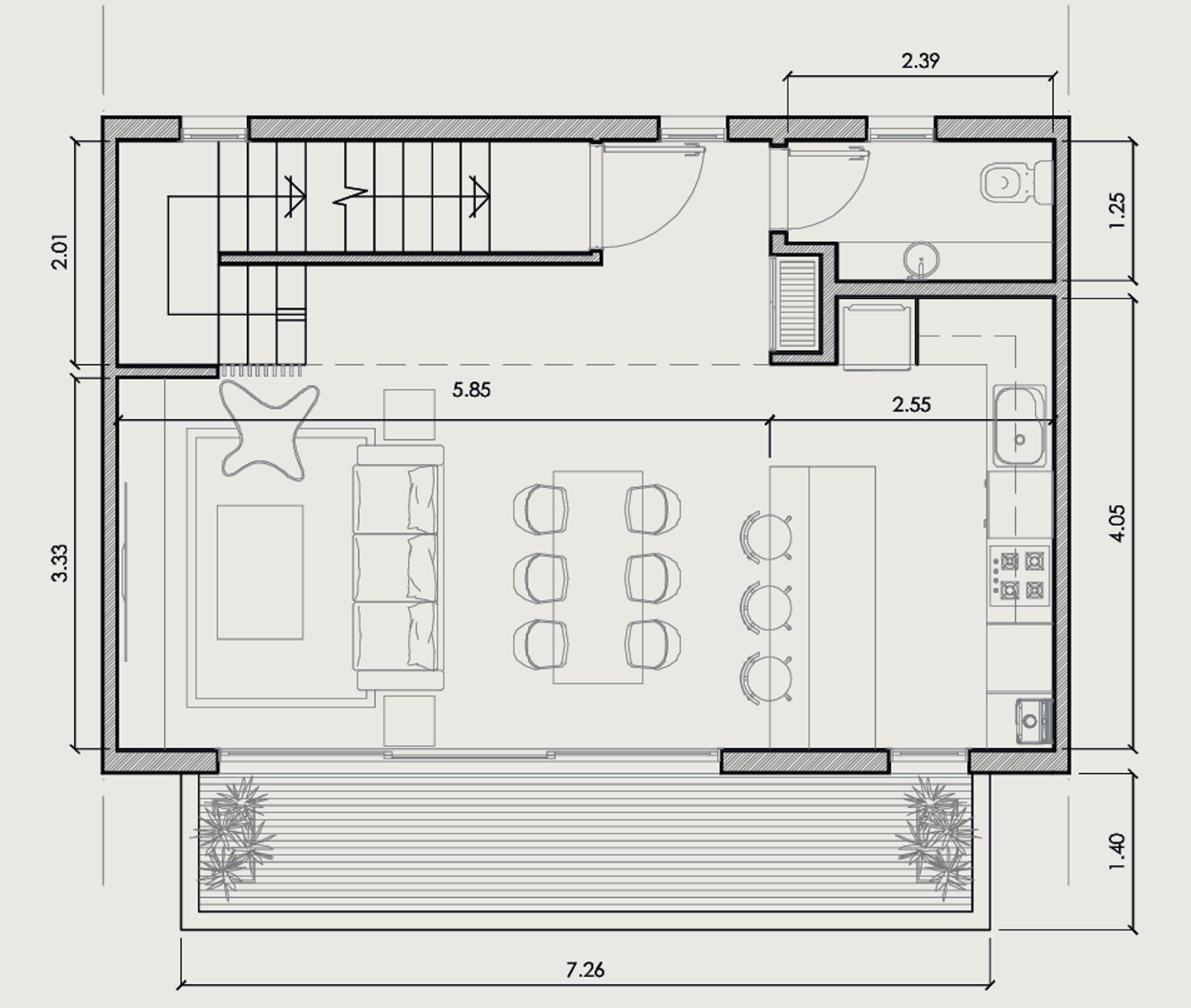 La primera planta cuenta con toilette, cocina y living comedor integrados.