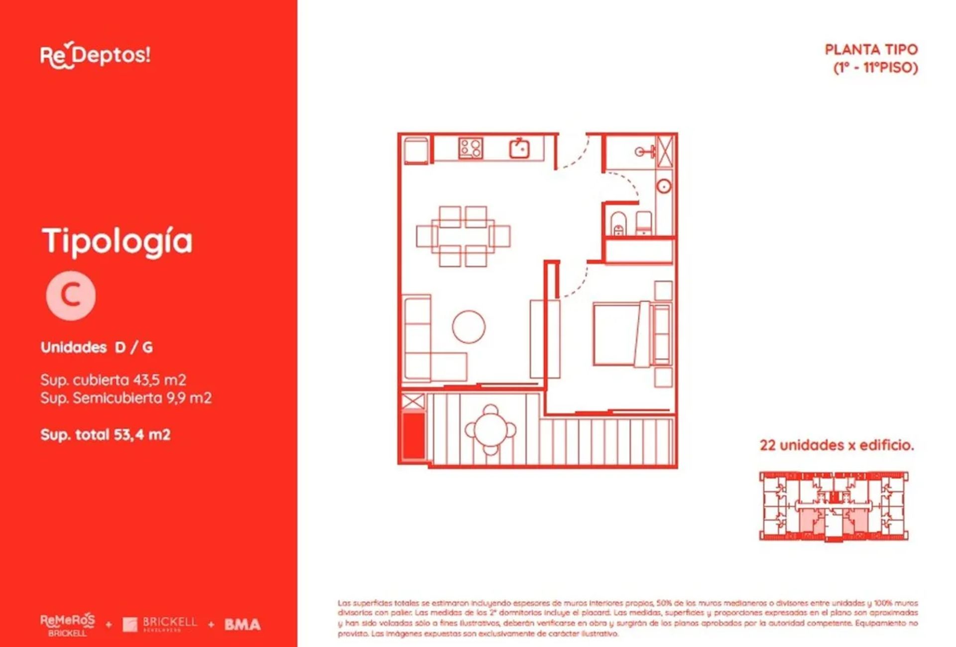 La unidad C cuenta con una superficie cubierta de 47,9 m² y una zona semicubierta de 12,4 m², sumando un total de 60,3 m². Se encuentra disponible en los pisos 1 a 11 de las torres Ibiza y Miconos, con distintas opciones de altura y vistas. Los departamentos están diseñados en tres ambientes, con balcón y jardín propio, y cuentan con parrilla. Además, el desarrollo incluye casitas de dos y tres ambientes con jardín privado, así como departamentos de uno, dos y tres ambientes con balcón.