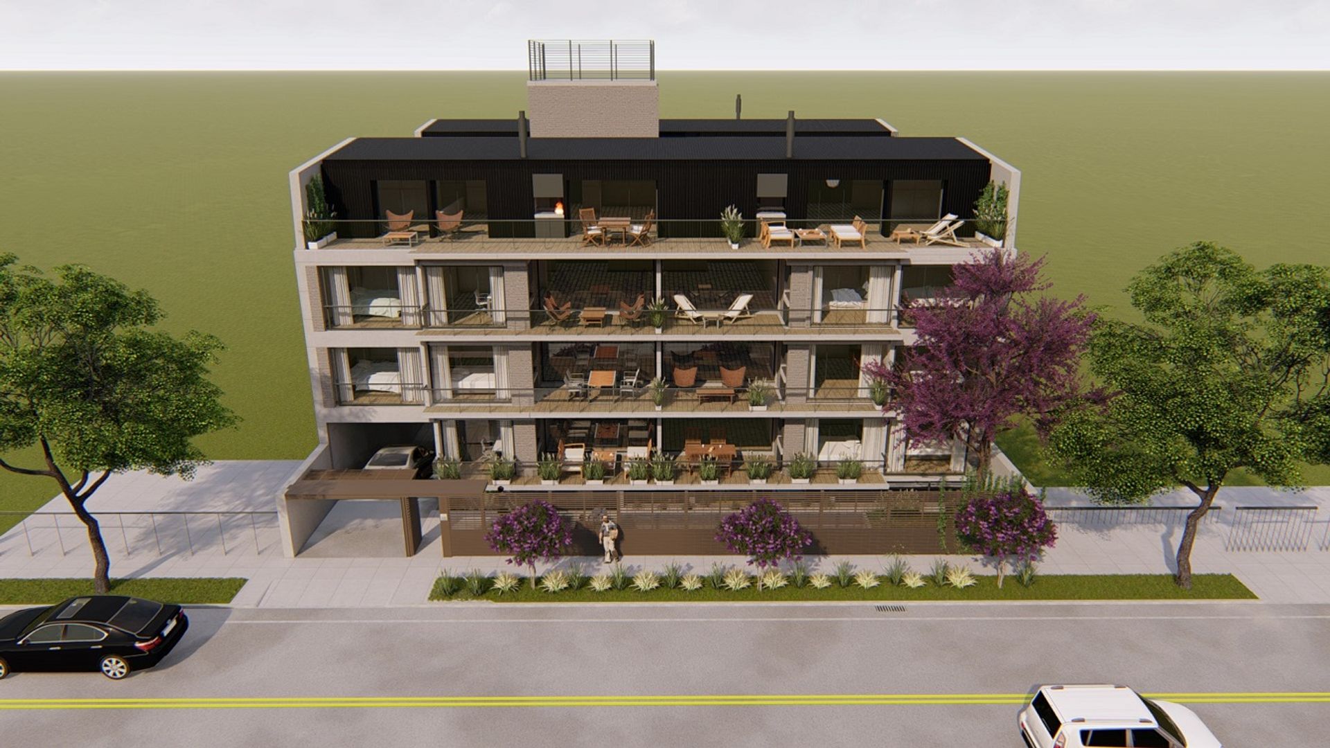 El departamento de 3 ambientes cuenta con un toilette de recepción, un dormitorio en suite y un amplio balcón‑terraza de 16 m² con vista a la avenida. La entrada directa al jardín y a la piscina permite disfrutar de espacios verdes y de relax sin salir de casa. Situado en el primer piso, el inmueble dispone de una parrilla propia para momentos de convivencia al aire libre.