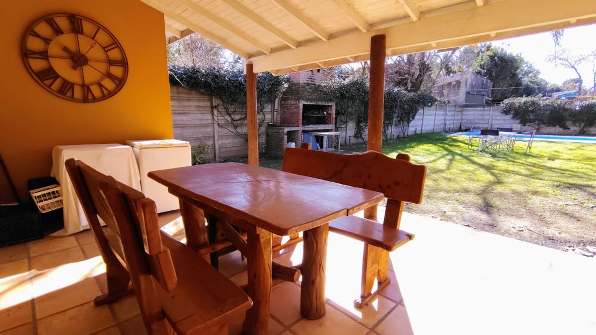 Los espacios verdes se extienden tanto al frente como al fondo de la casa, con un sistema de riego eficiente. En el patio trasero se encuentra una piscina de 7 × 3,5 m, con un desnivel de 2,20 m a 1,60 m, perfecta para refrescarse en los días calurosos. Además, hay un área destinada a la parrilla y un sector de descanso al aire libre, ideal para disfrutar de momentos conviviales.