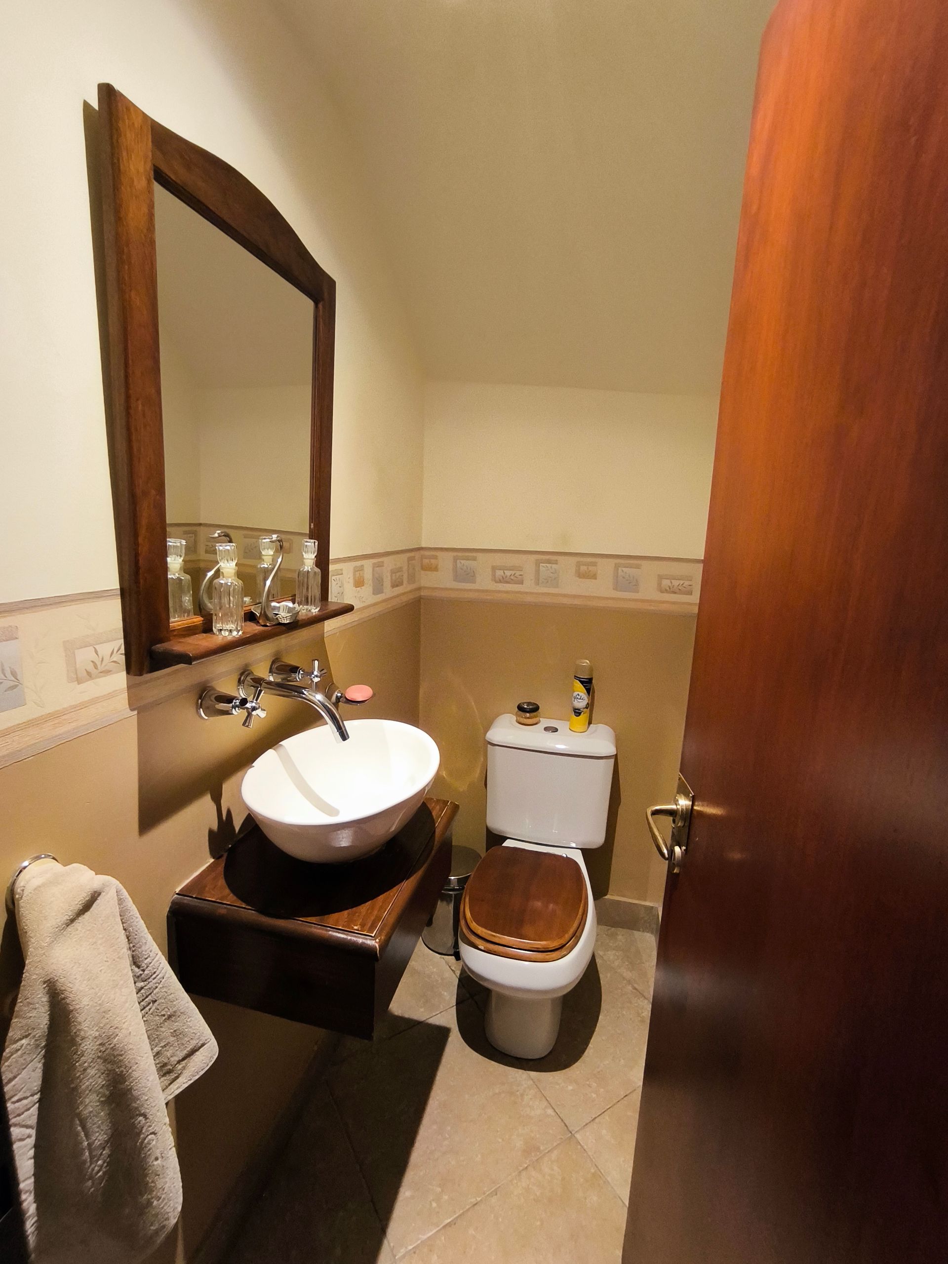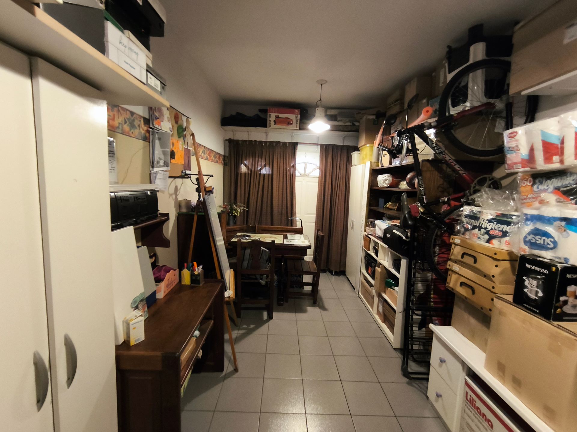 A la derecha se ubica un práctico toilette, mientras que a la izquierda se encuentra la cochera cubierta, actualmente utilizada como área de almacenaje, optimizando el espacio disponible.