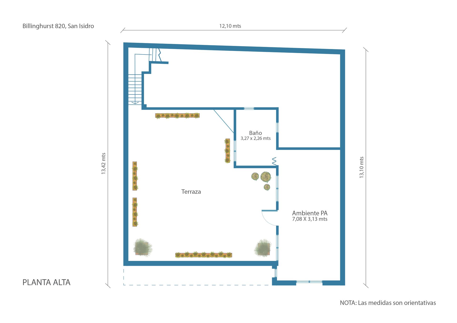 La planta alta, accesible desde el patio, ofrece un dormitorio con baño propio de grandes dimensiones y una terraza privada.