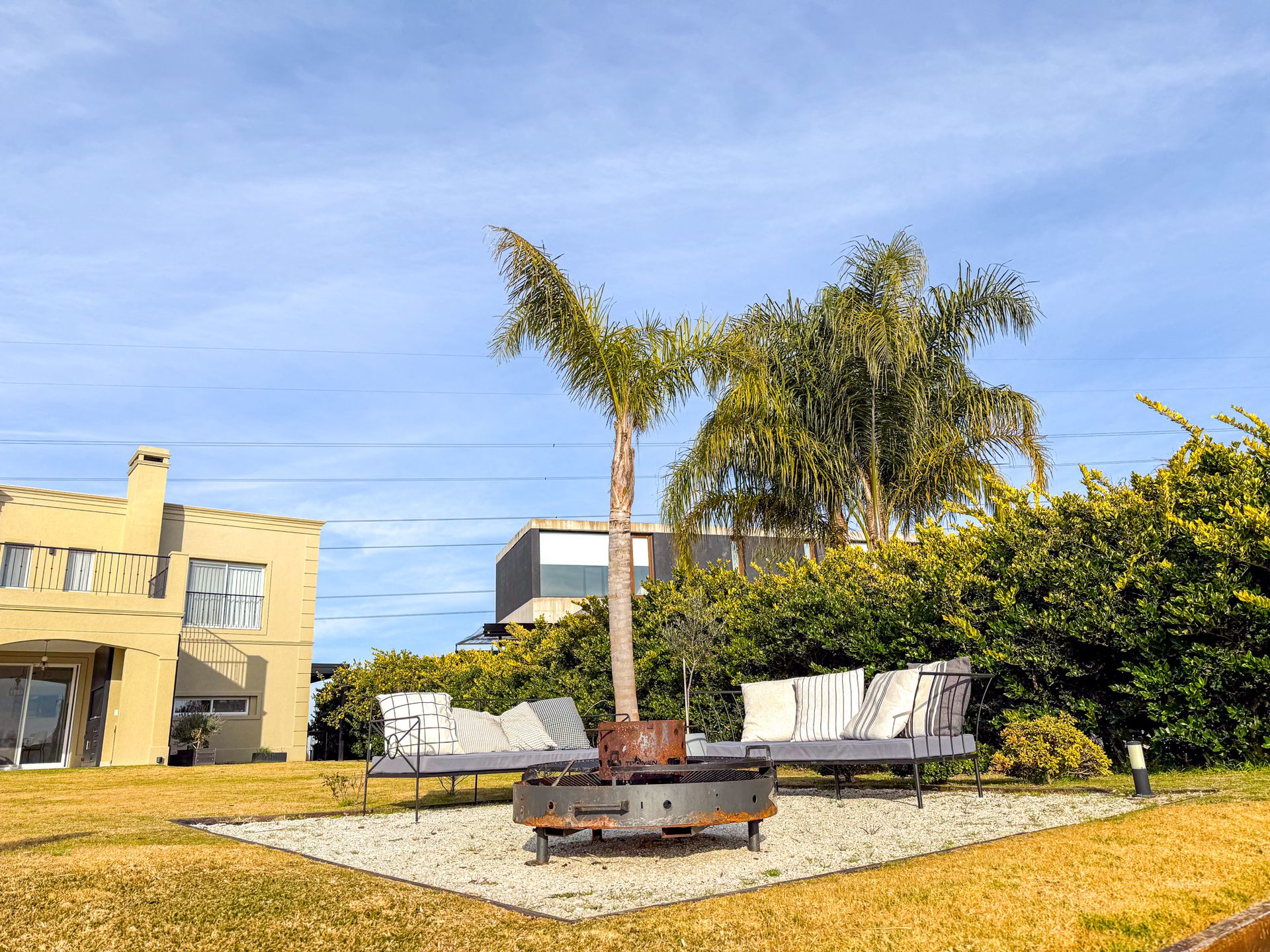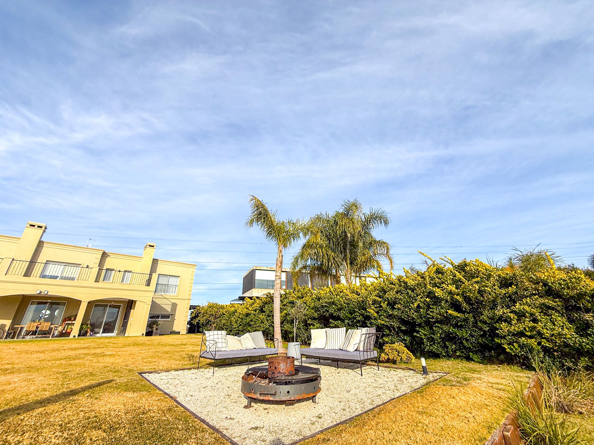 El exterior cuenta con una piscina de vista infinita a la laguna, un muelle privado y un sector fogonero para reuniones al aire libre. Una parrilla con cerramiento semicubierto y un sistema de riego automático completan las comodidades al aire libre.