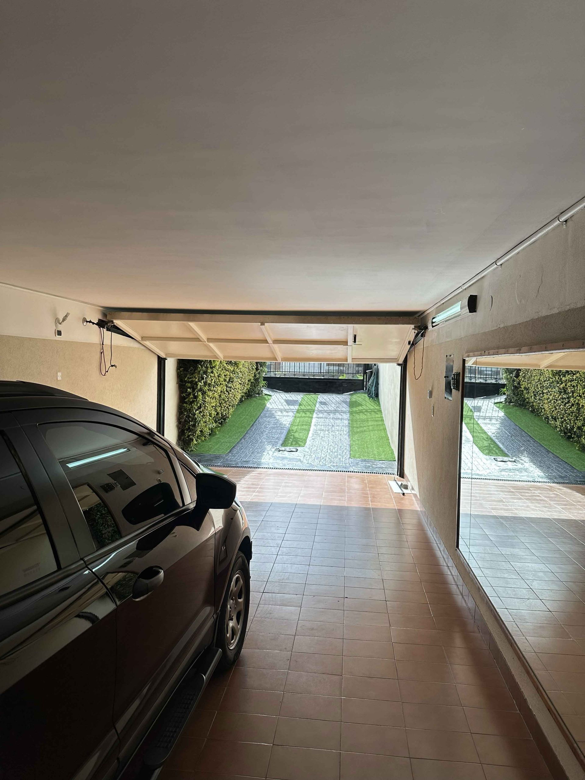 El garaje, cubierto, permite la acomodación de hasta seis vehículos y un espacio adicional al frente del jardín con posibilidad de añadir un segundo nivel. Equipado con espejos para clases de baile o gimnasio, sensores de luz automáticos y una zona de máquinas y almacenamiento, el garaje facilita el acceso a la zona de jardín y quincho mediante una puerta con rejas de seguridad y barreras de protección. Una reja interna conecta el garaje con la planta superior, garantizando un flujo de circulación seguro y ordenado.