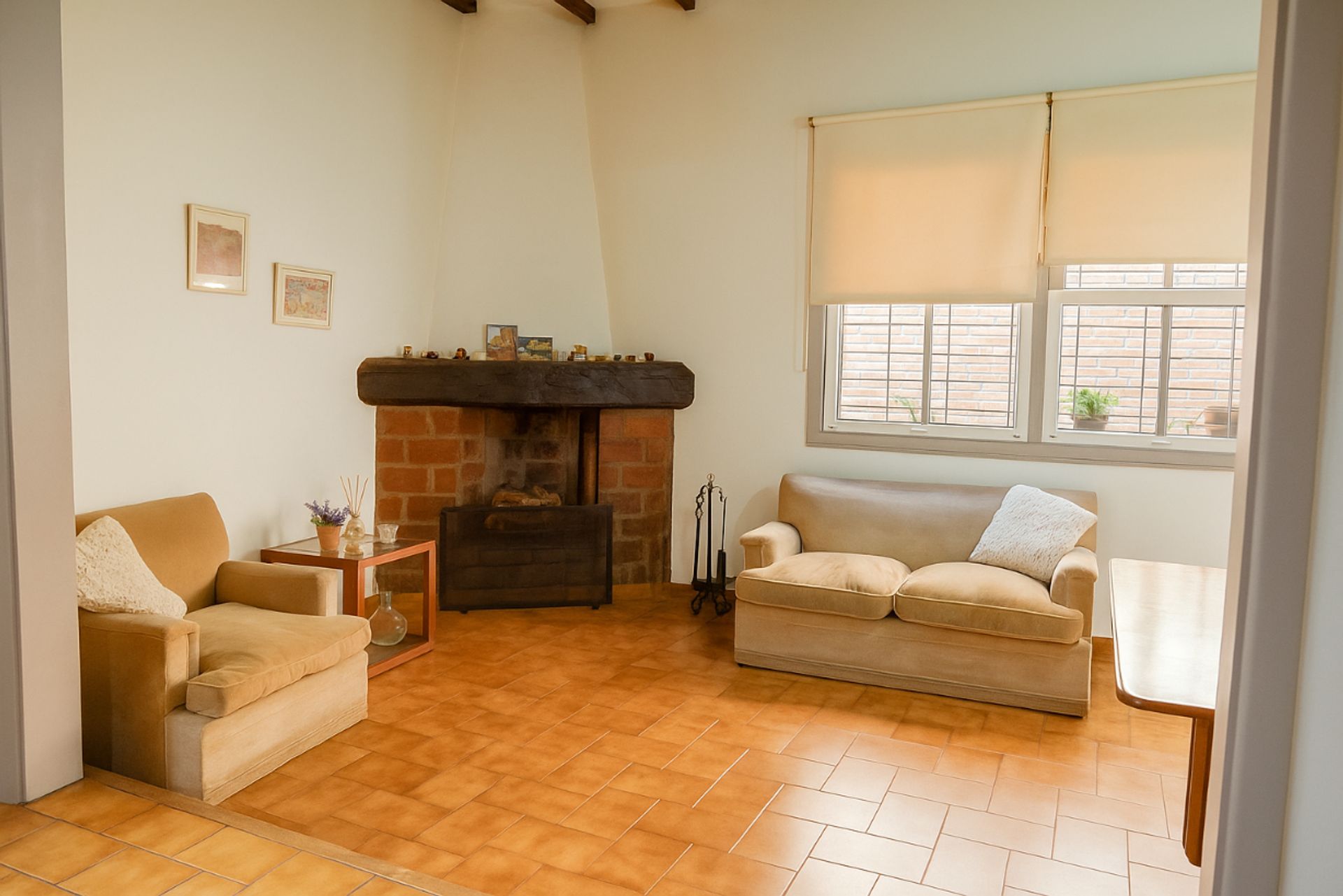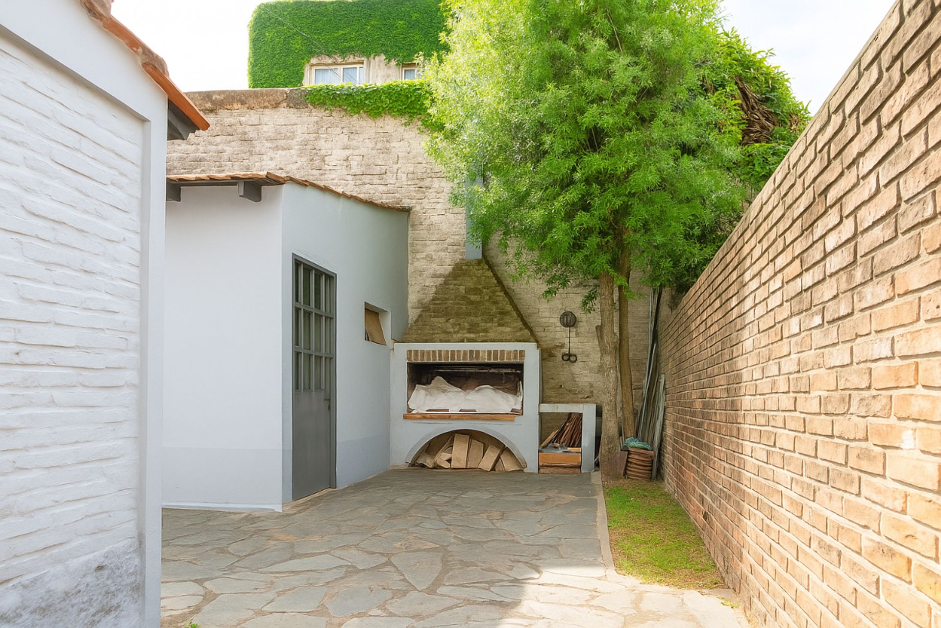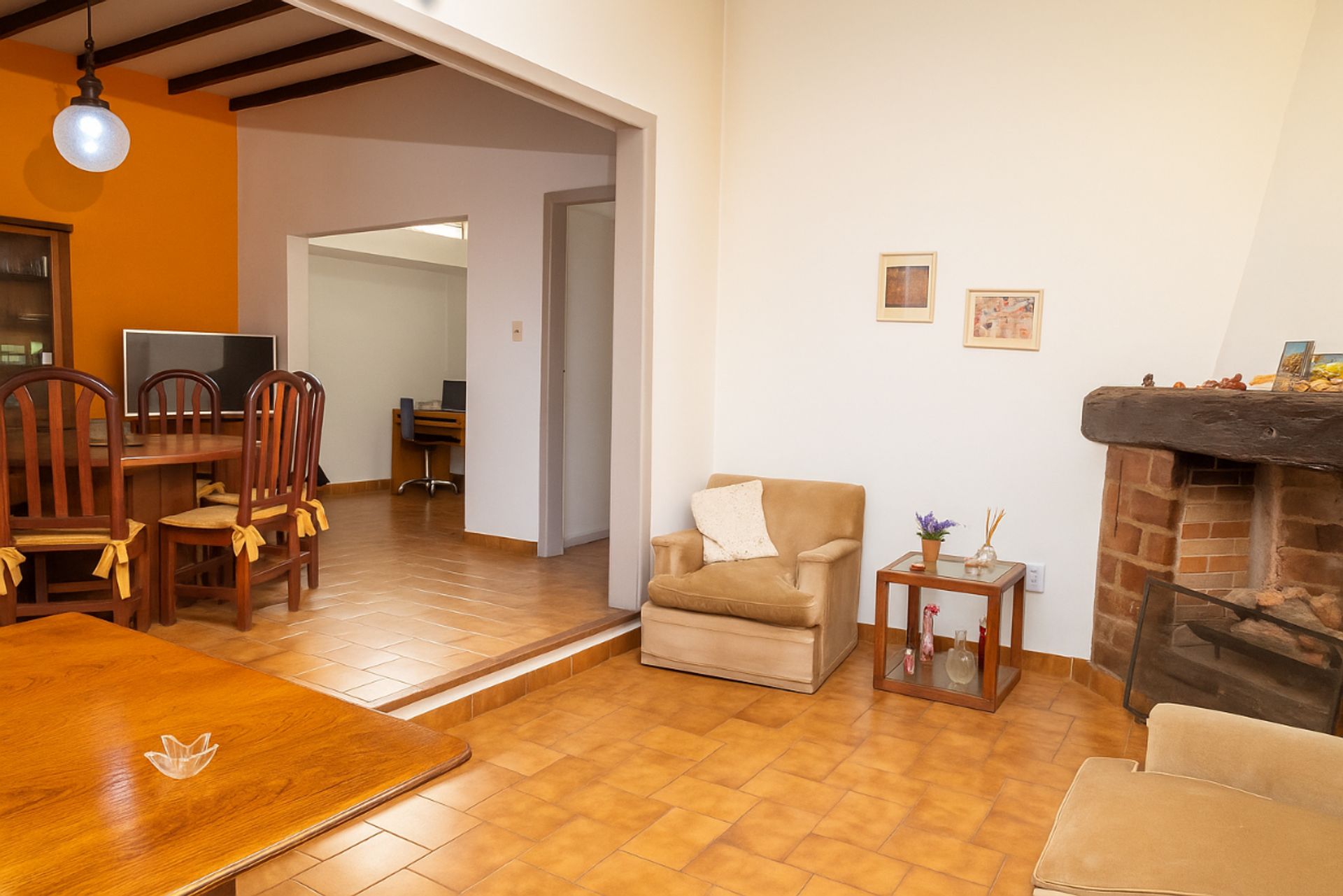 La vivienda cuenta con entrada de garaje, jardín frontal, patio, parrilla y quincho, además de lavadero independiente con toilette. En el interior se ubican living con chimenea, comedor, cocina, escritorio y tres dormitorios. El baño principal es completo y hay un toilette adicional.