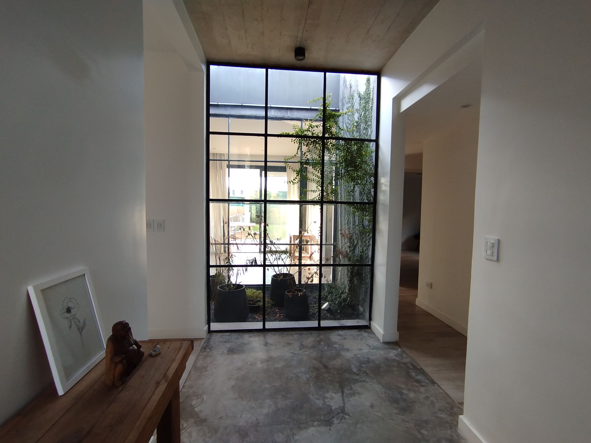 El living comedor se distingue por su abundante luz natural y su jardín de invierno, cerrado con paneles de vidrio que crean un ambiente amplio y confortable. Desde este espacio se accede al quincho, con una vista encantadora al jardín, ideal para reuniones familiares y sociales.