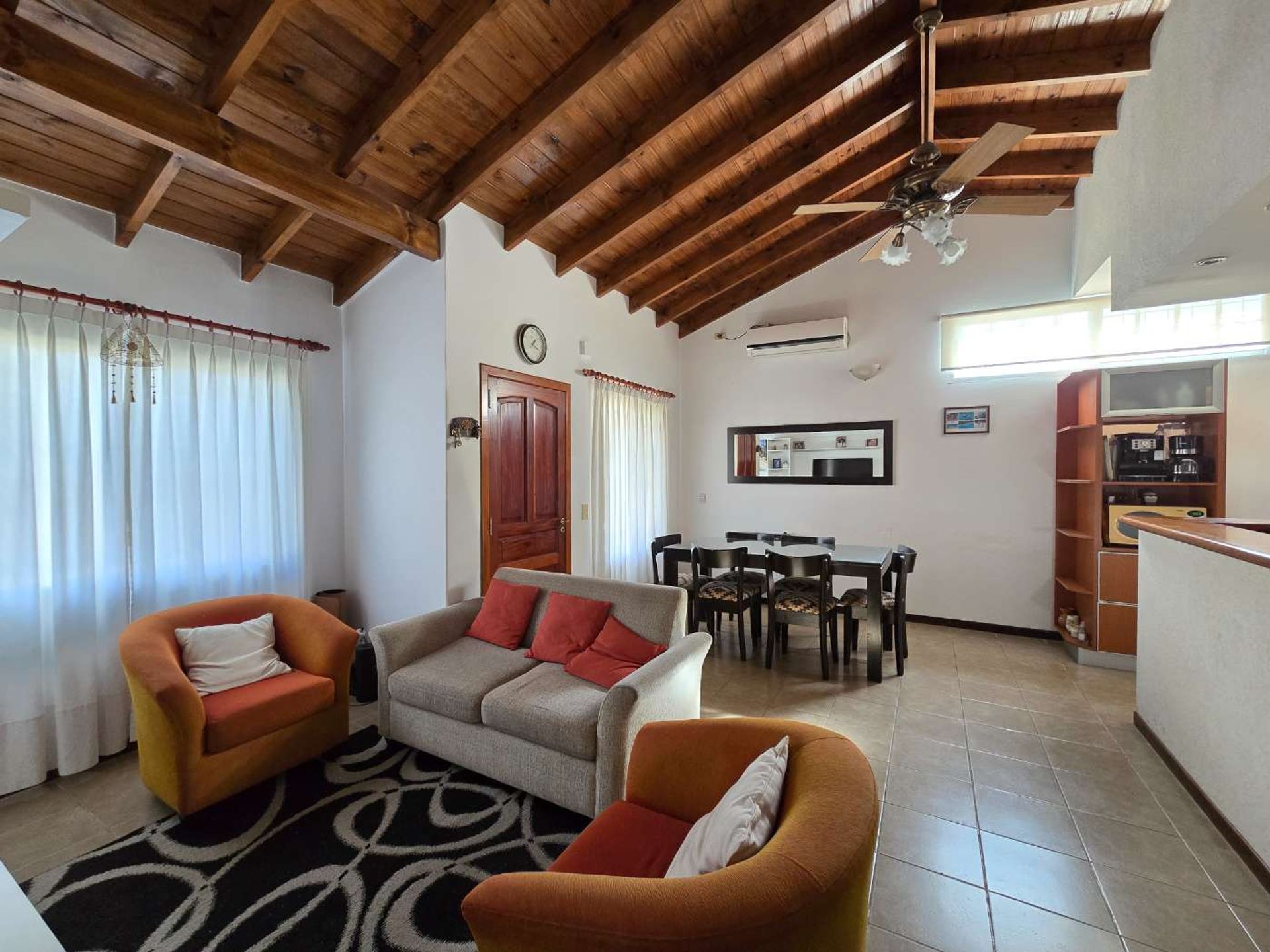 Al ingresar, se abre un amplio living comedor, iluminado y con techos altos de madera expuesta que aportan calidez y estilo. La cocina, integrada con una barra desayunadora, cuenta con muebles de guardado y ventilación natural, creando un espacio práctico y acogedor.
