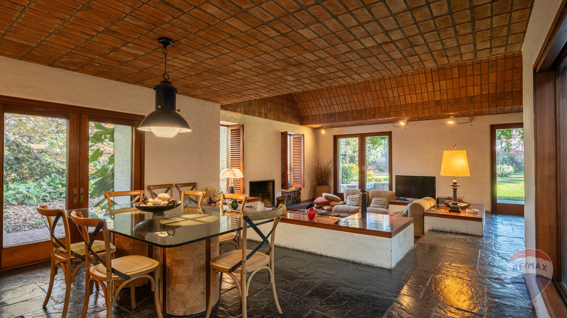 Al entrar, un hall de recepción con jardín de invierno conduce a un amplio living comedor adornado con chimenea, ofreciendo una vista panorámica al jardín parquizado. La cocina, completamente equipada, incluye un cómodo comedor diario y un práctico lavadero, ideal para la vida cotidiana y el entretenimiento. La vivienda cuenta con tres dormitorios, uno de ellos en suite con vestidor, y tres baños completos, garantizando confort y privacidad.