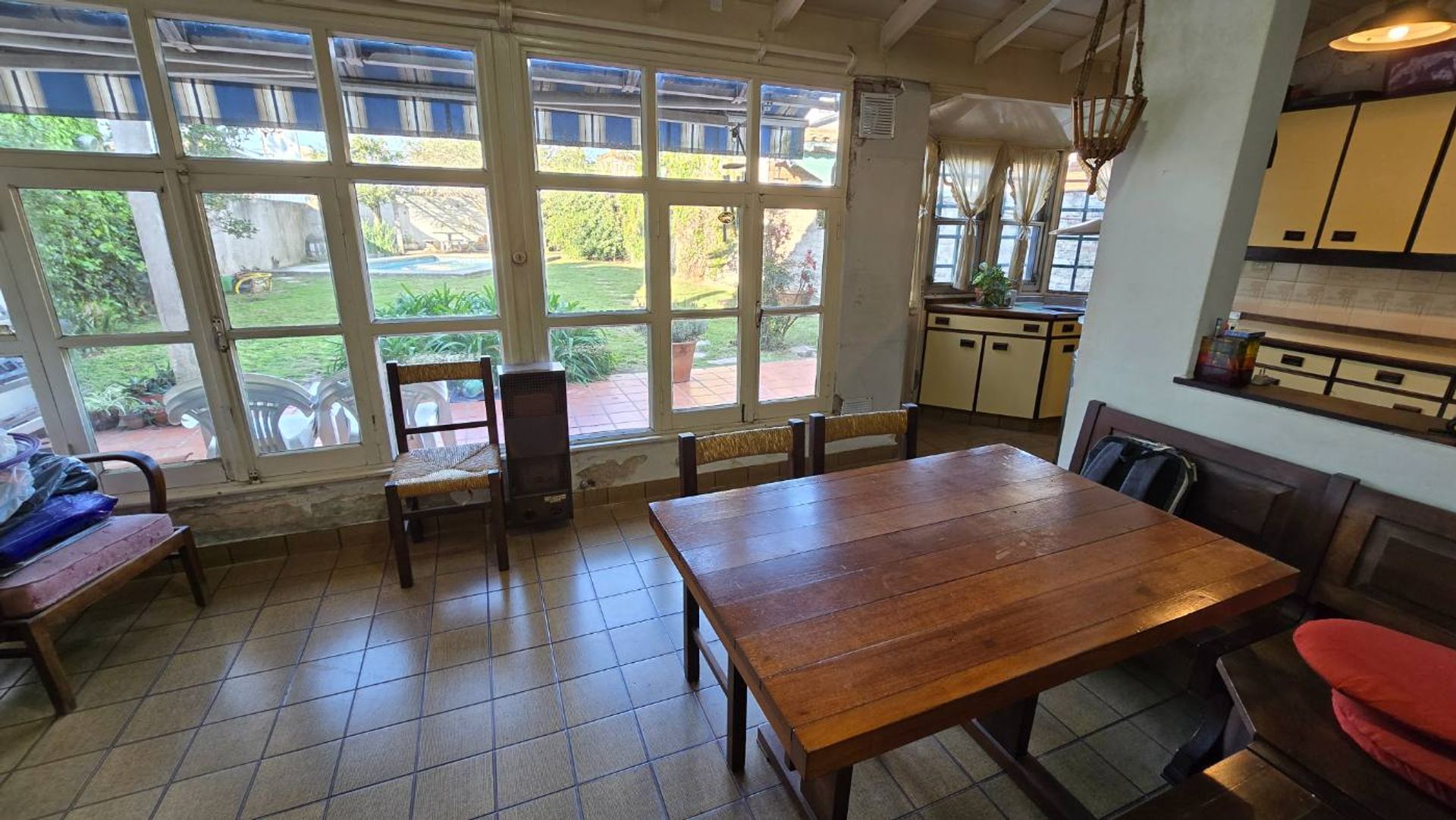 En la planta baja se encuentran un luminoso living-comedor, una cocina con gran comedor que ofrece vistas al jardín, un espacio de trabajo o estudio, un baño completo y un toilette. Además, la zona de la piscina, construida con material de alta calidad y equipada con bomba, se extiende hacia el exterior. Al fondo de la planta baja se ubica un cuarto de guardado. La propiedad dispone de una cochera cubierta y otra descubierta.