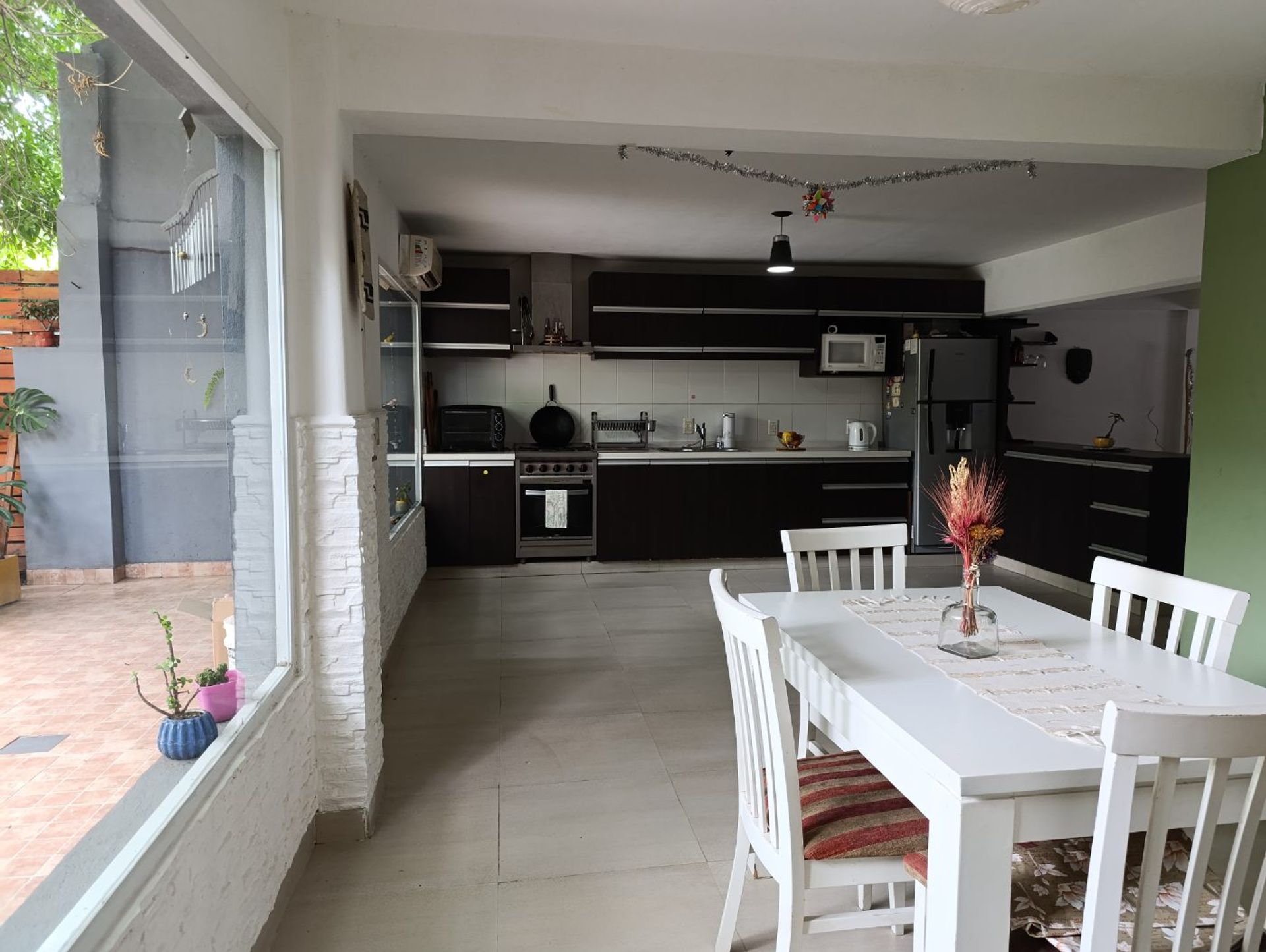 El patio y el jardín, con quincho y pileta de material, son ideales para recibir visitas y disfrutar de momentos en familia y con amigos. El entorno residencial, salpicado de árboles y palmeras, añade un toque de tranquilidad y naturalidad tanto desde el interior como desde el exterior de la casa.