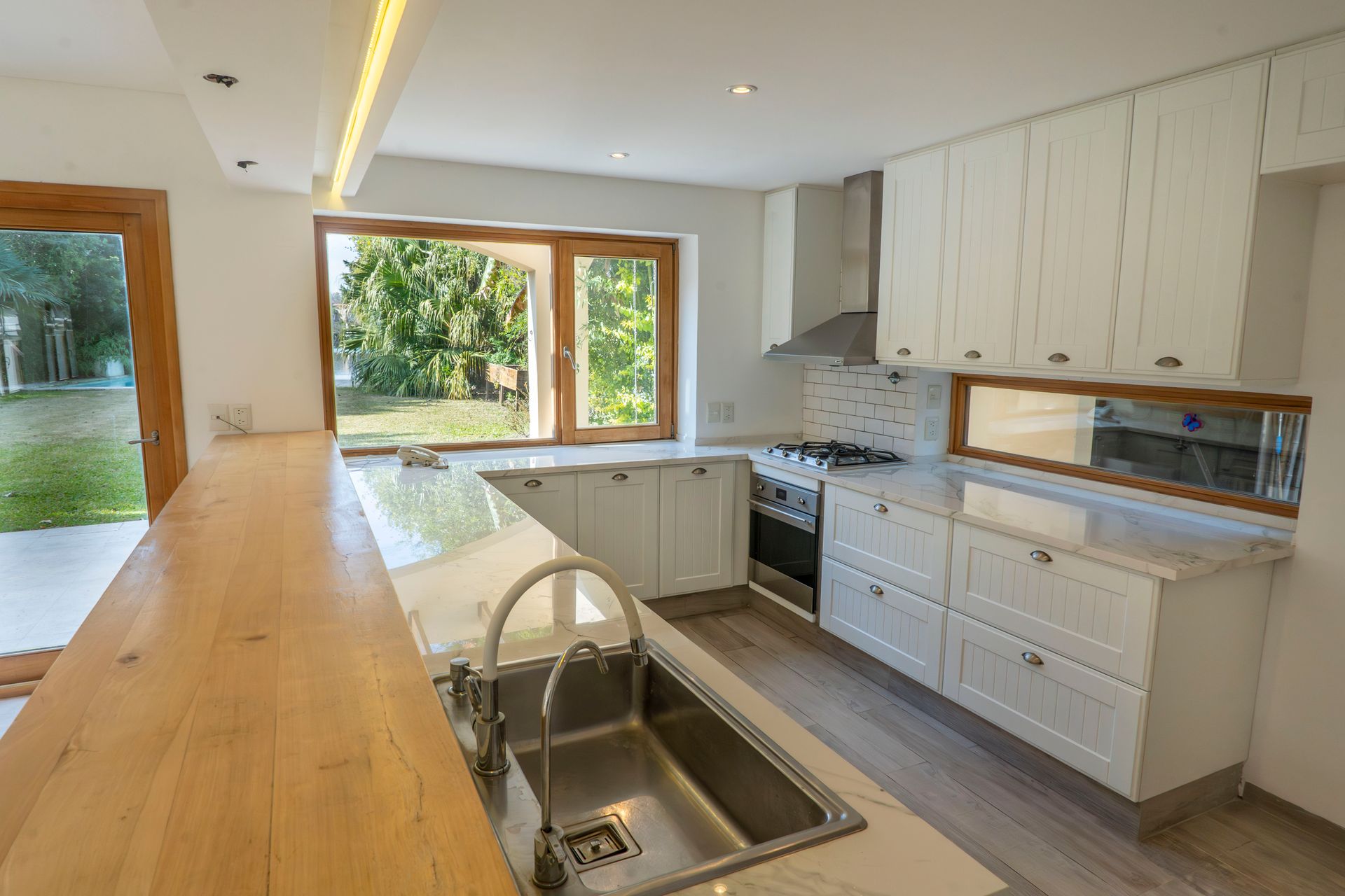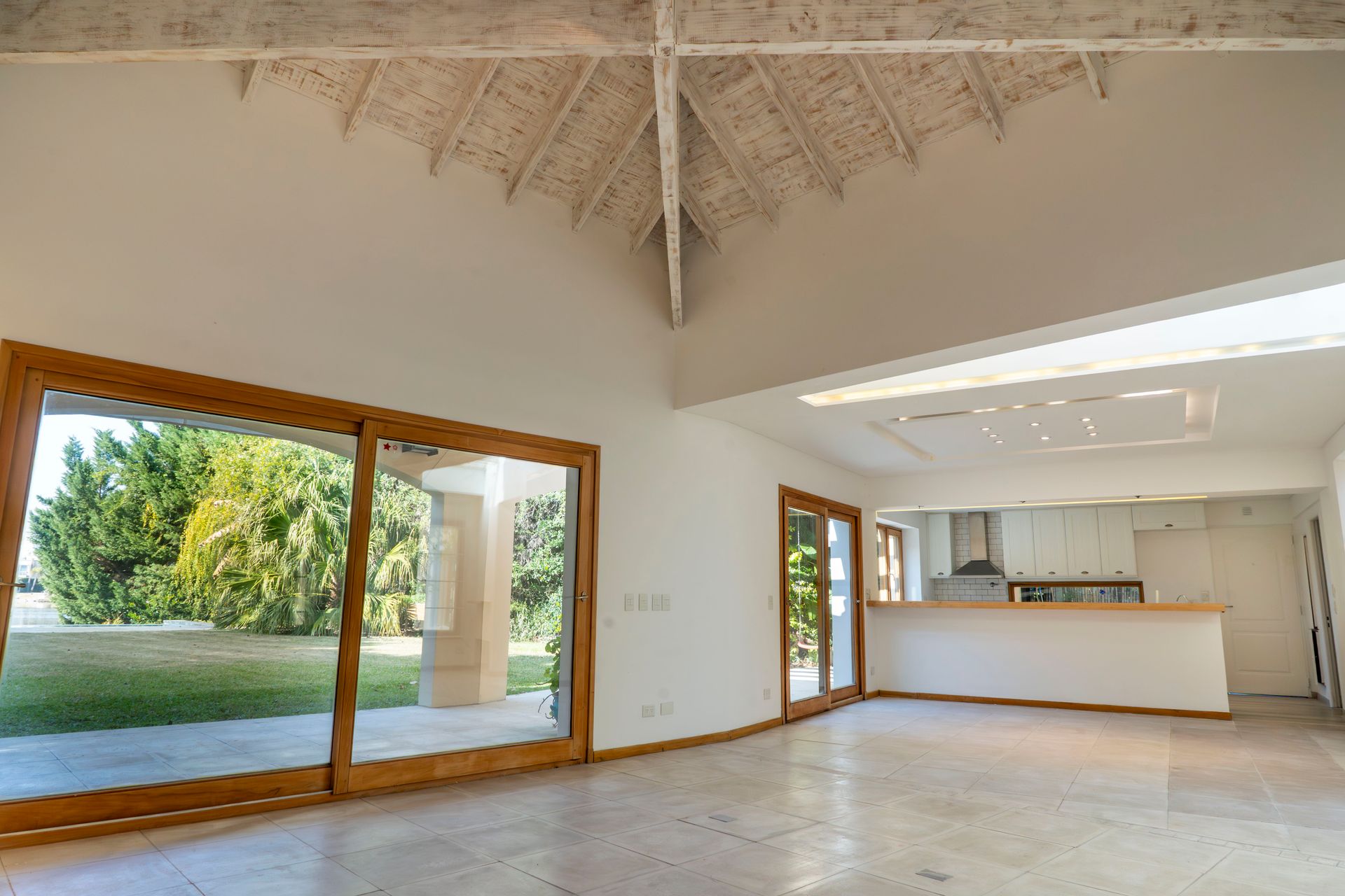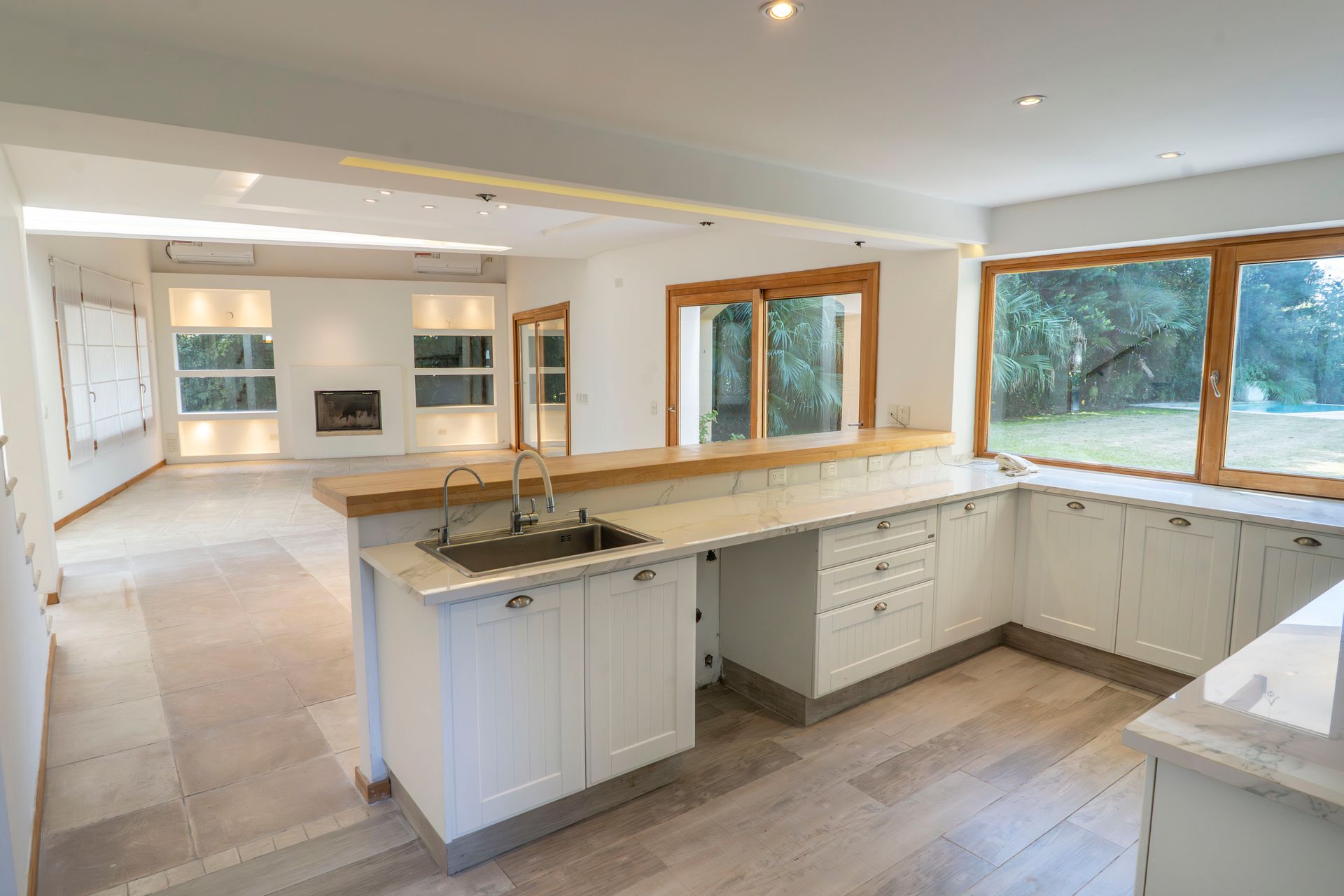El interior, de 282 m², combina funcionalidad y luminosidad. En planta baja se abre un amplio living‑comedor con techos de doble altura y hogar a leña, que se integra con una cocina de diseño con acabados de alta calidad. También dispone de un toilette, un amplio playroom, un escritorio, un lavadero independiente y una dependencia con baño completo.