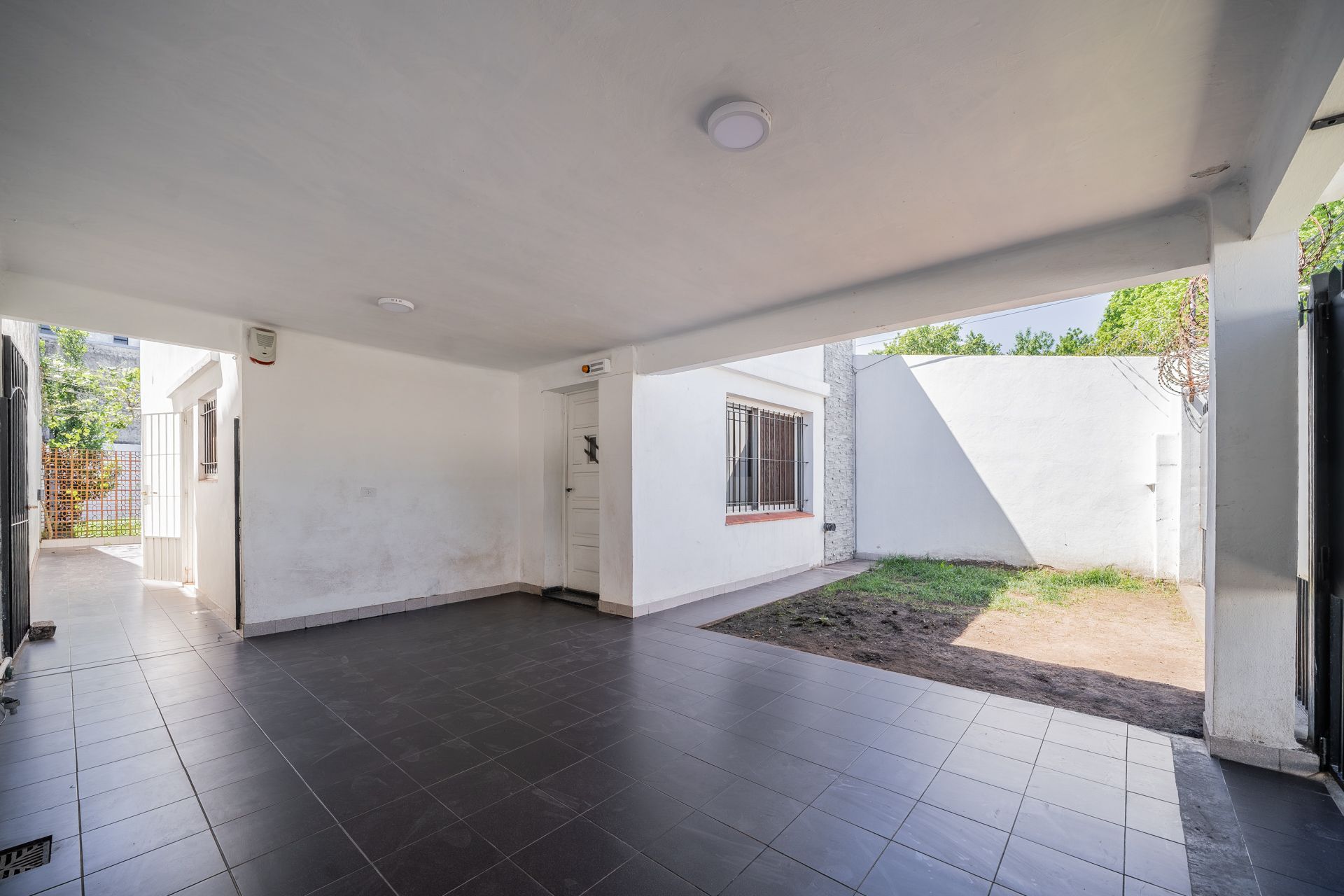 El frente de la propiedad cuenta con un retiro que incluye un jardín orientado al noreste y una entrada de auto techada, creando un espacio privado y protegido. En la parte trasera se mantiene un jardín de amplio tamaño, ideal para disfrutar de la luz natural y la tranquilidad del entorno. Una galería con una parra aporta un toque de verdor y elegancia al conjunto.