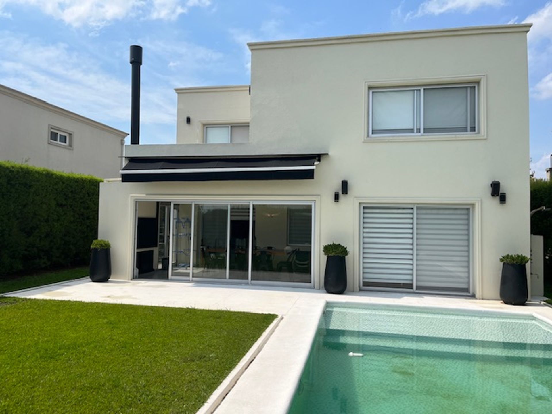 La vivienda incluye cochera cubierta, aire acondicionado en todos los ambientes y calefacción por piso radiante. Los acabados incluyen blindex esmerilado y un sistema de riego cronometrado que garantiza el mantenimiento del paisaje sin esfuerzo.