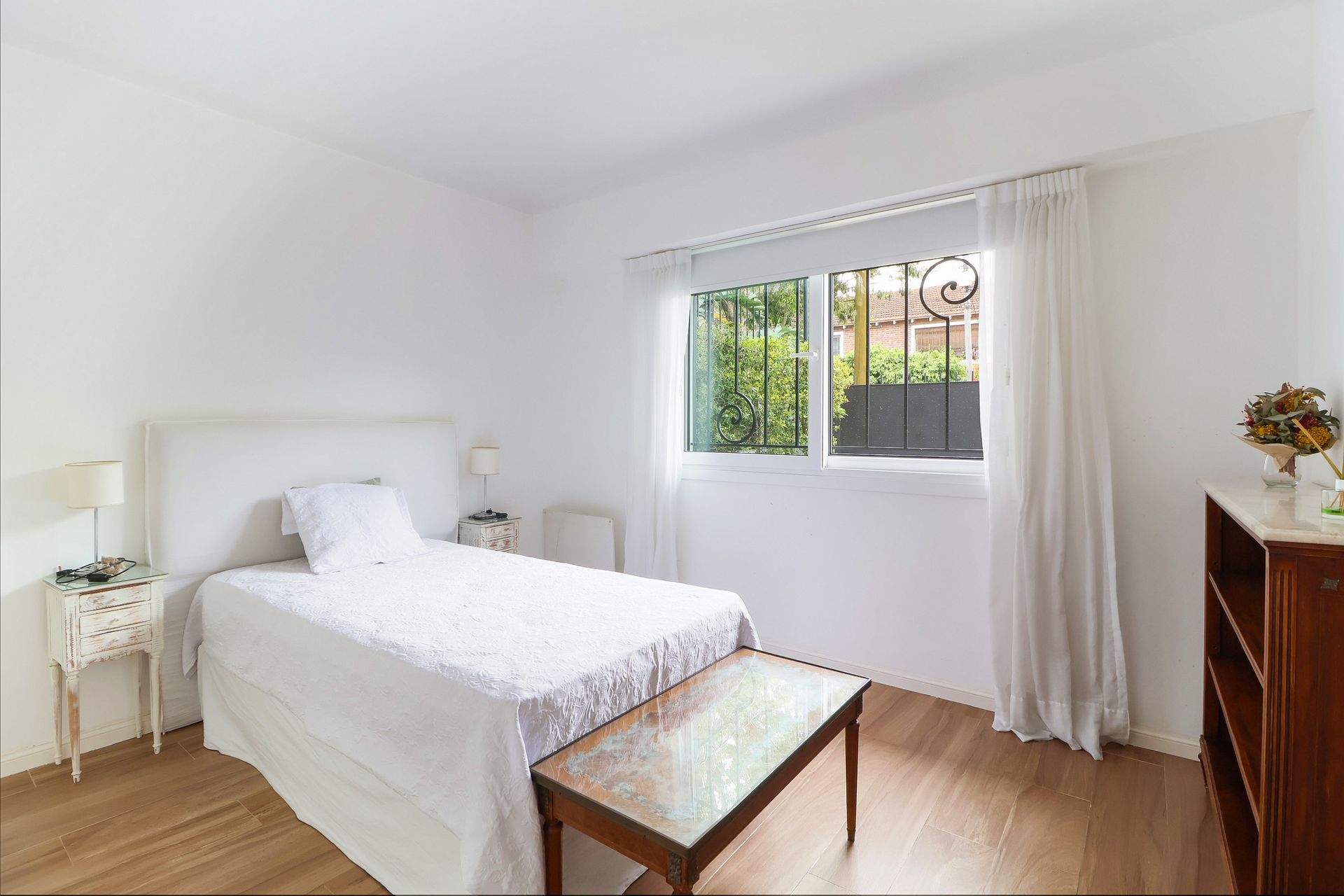 En planta alta se encuentra un lavadero independiente y un dormitorio/estudio de menor tamaño con salida a balcón y vista al jardín. El dormitorio principal dispone de un amplio vestidor, casi equivalente a un cuarto adicional, equipado con muebles de almacenamiento. Un baño completo sirve tanto al dormitorio principal como a la zona exterior.