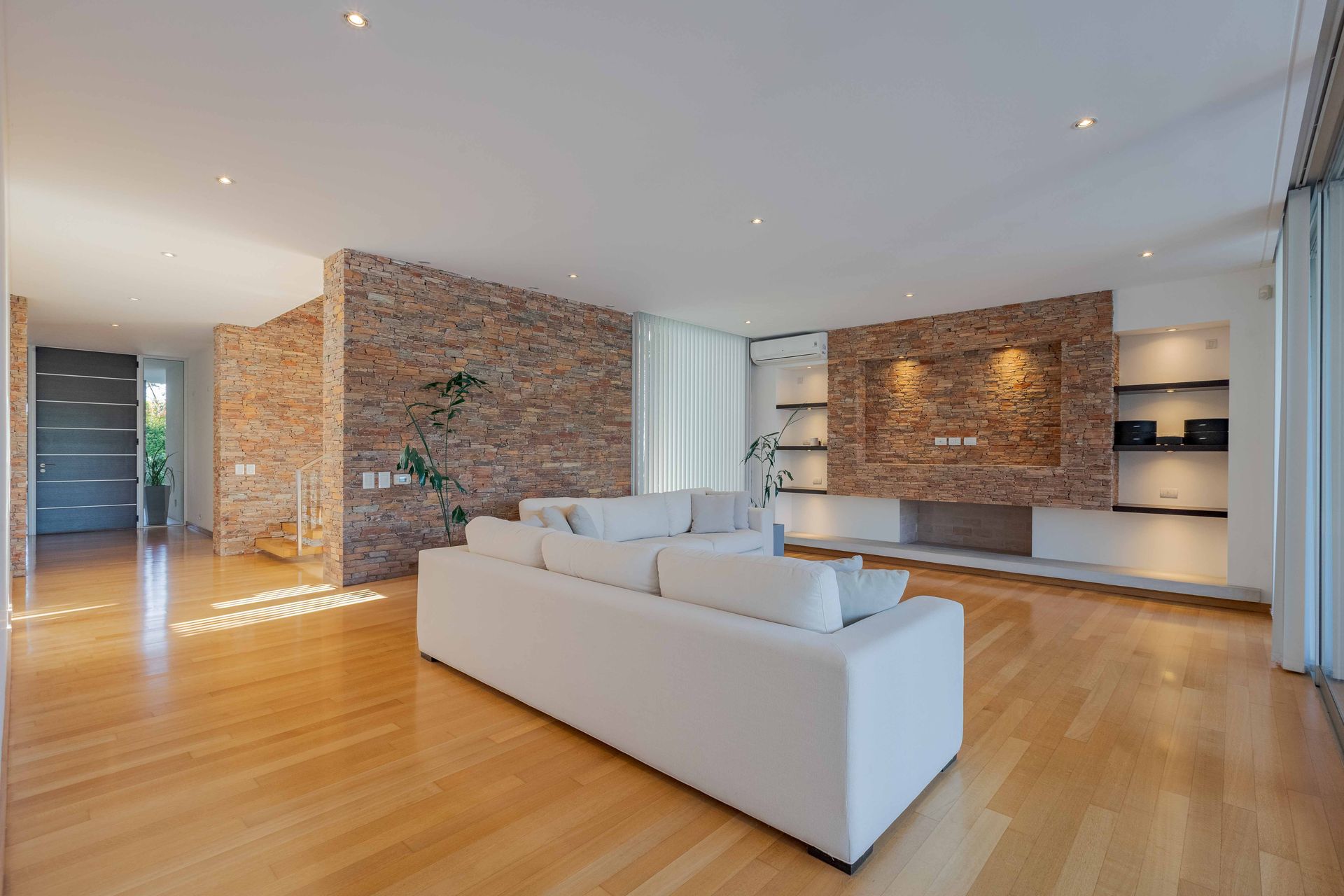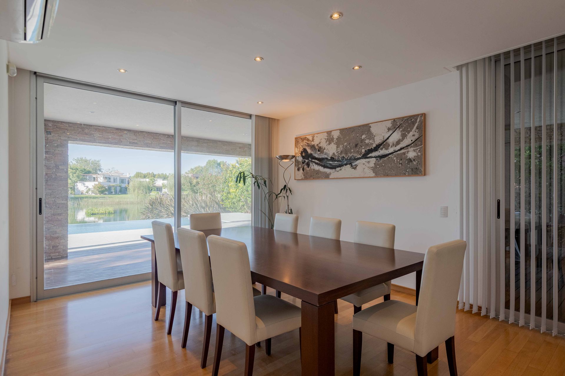 En la planta baja se despliega un amplio hall de ingreso, un escritorio o playroom, un toilette, un living con hogar, un comedor para invitados, una cocina-comedor con área de TV familiar, un lavadero, una dependencia de servicio y una despensa. La planta alta alberga seis habitaciones, incluida una suite principal con vestidor y baño sectorizado. Todas las habitaciones cuentan con balcones que ofrecen vistas al lago o a la terraza frontal, garantizando luz natural y aire fresco.