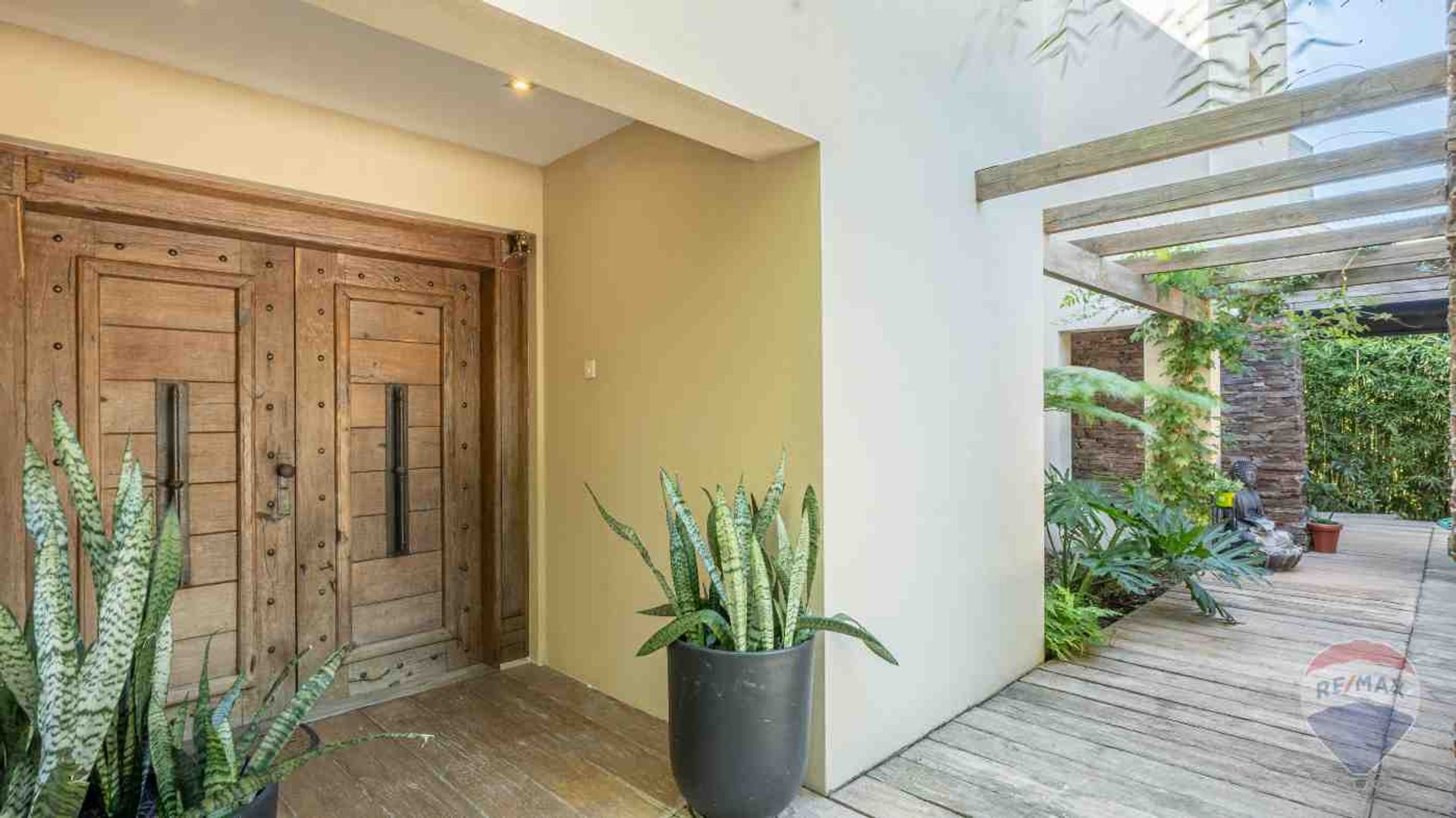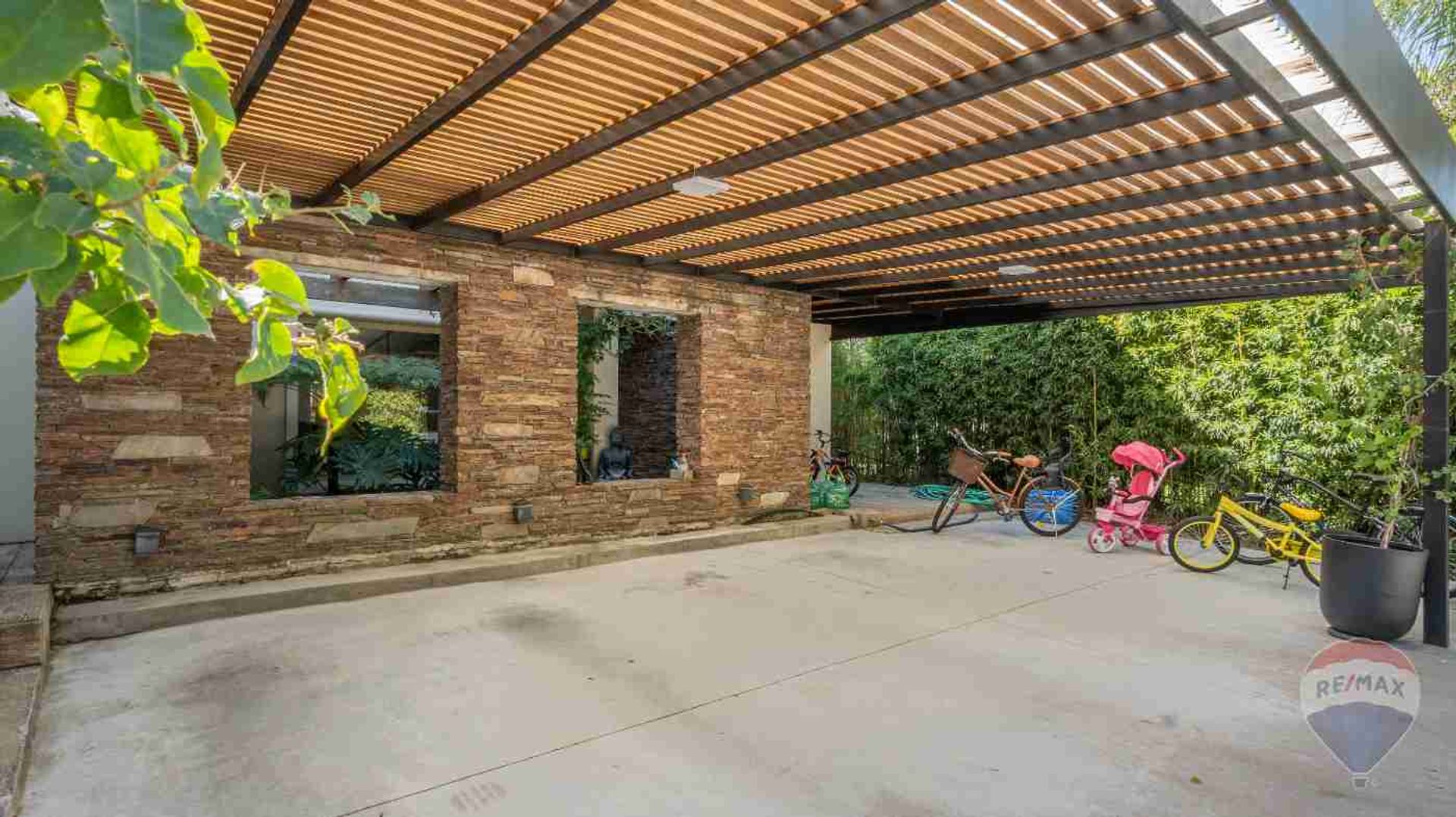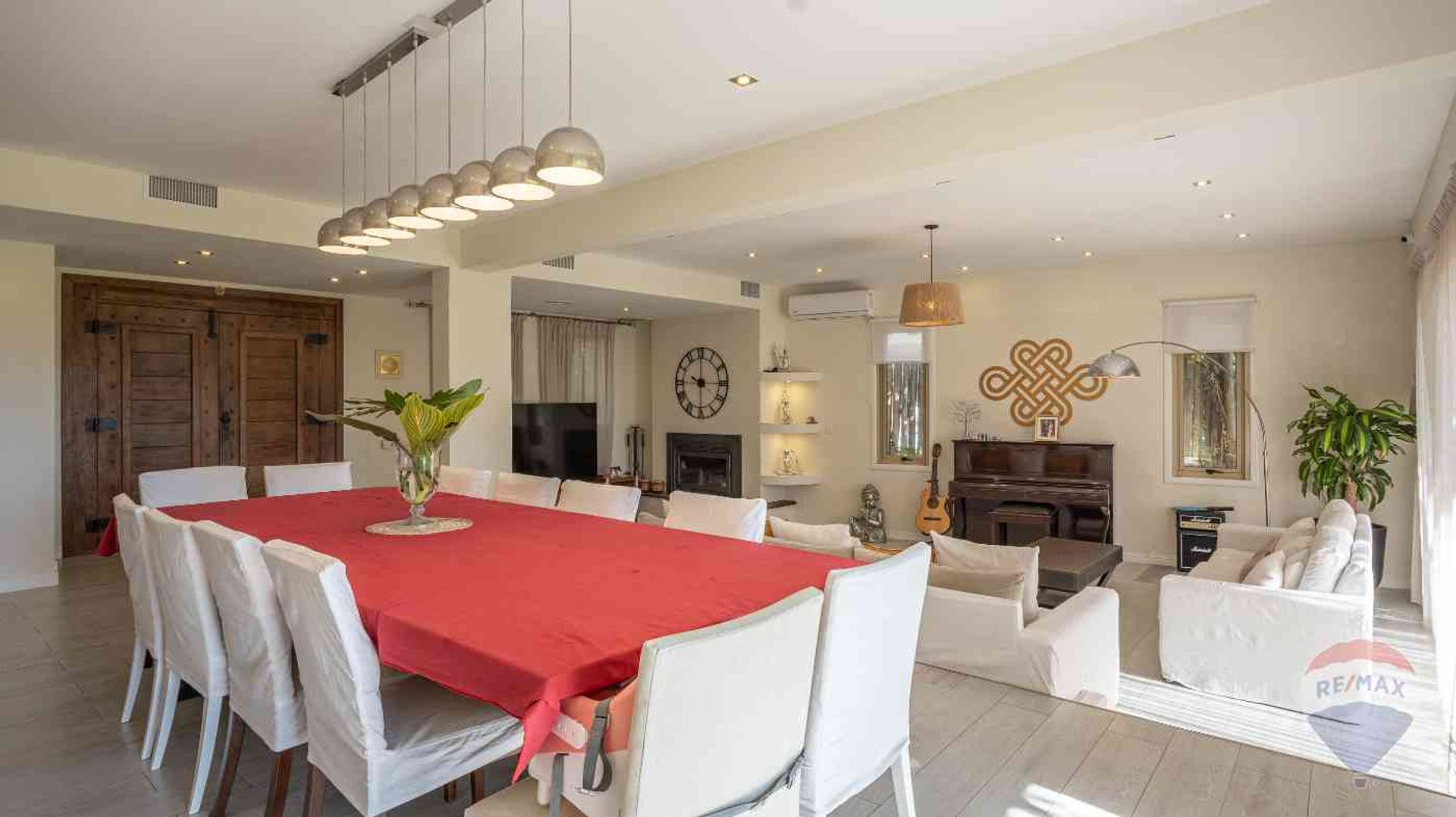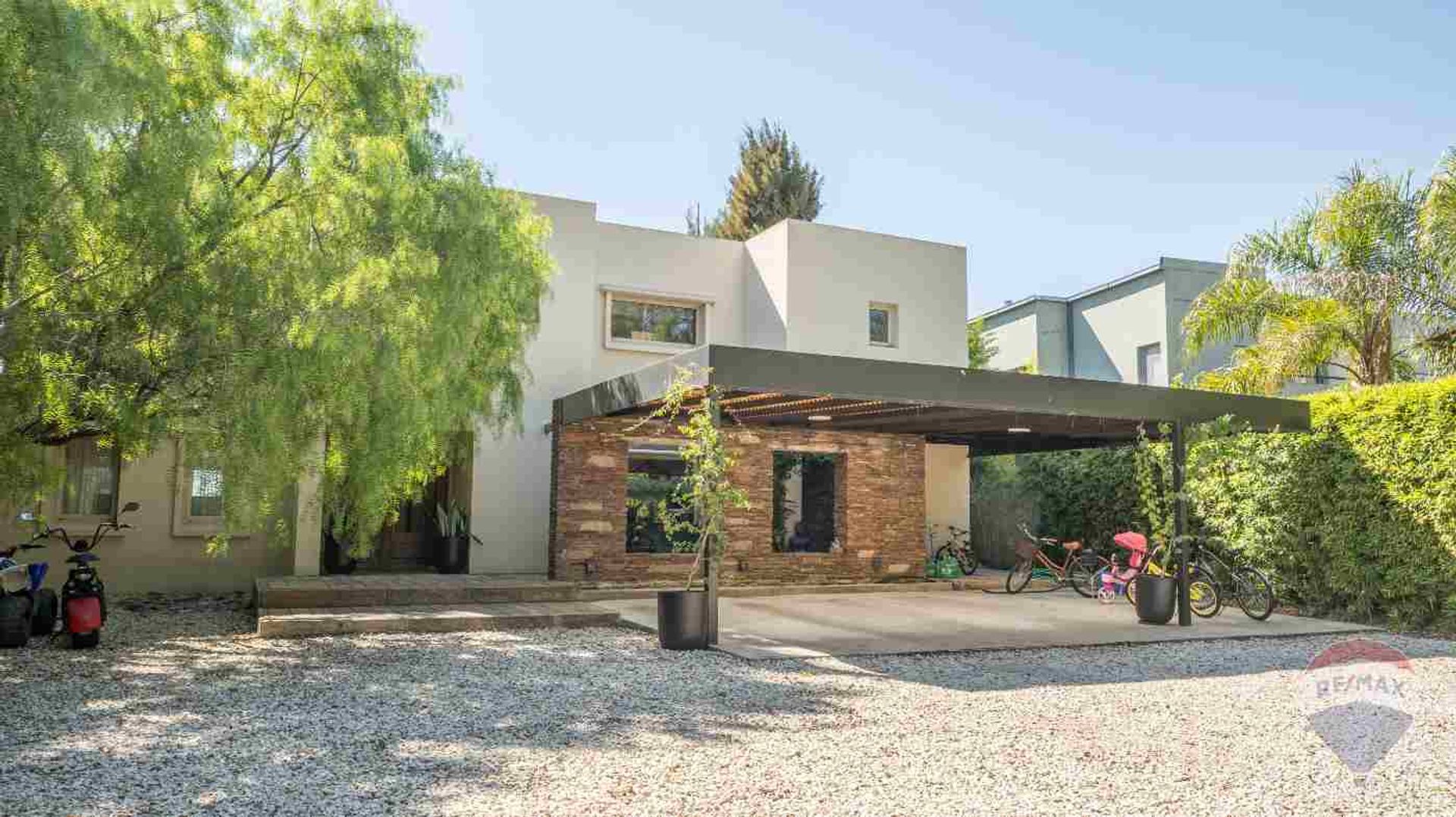 La planta baja dispone de un amplio living con ventanales que ofrecen vistas al jardín, comedor integrado con grandes ventanales, cocina amplia, toilette de recepción, área de servicio con lavadero y baño completo, y un playroom. En la planta alta se encuentra el dormitorio principal en suite con vestidor, dos dormitorios adicionales que comparten un baño completo, un ambiente tipo escritorio o habitación y un salón de cine adaptado para uso como cuarto.