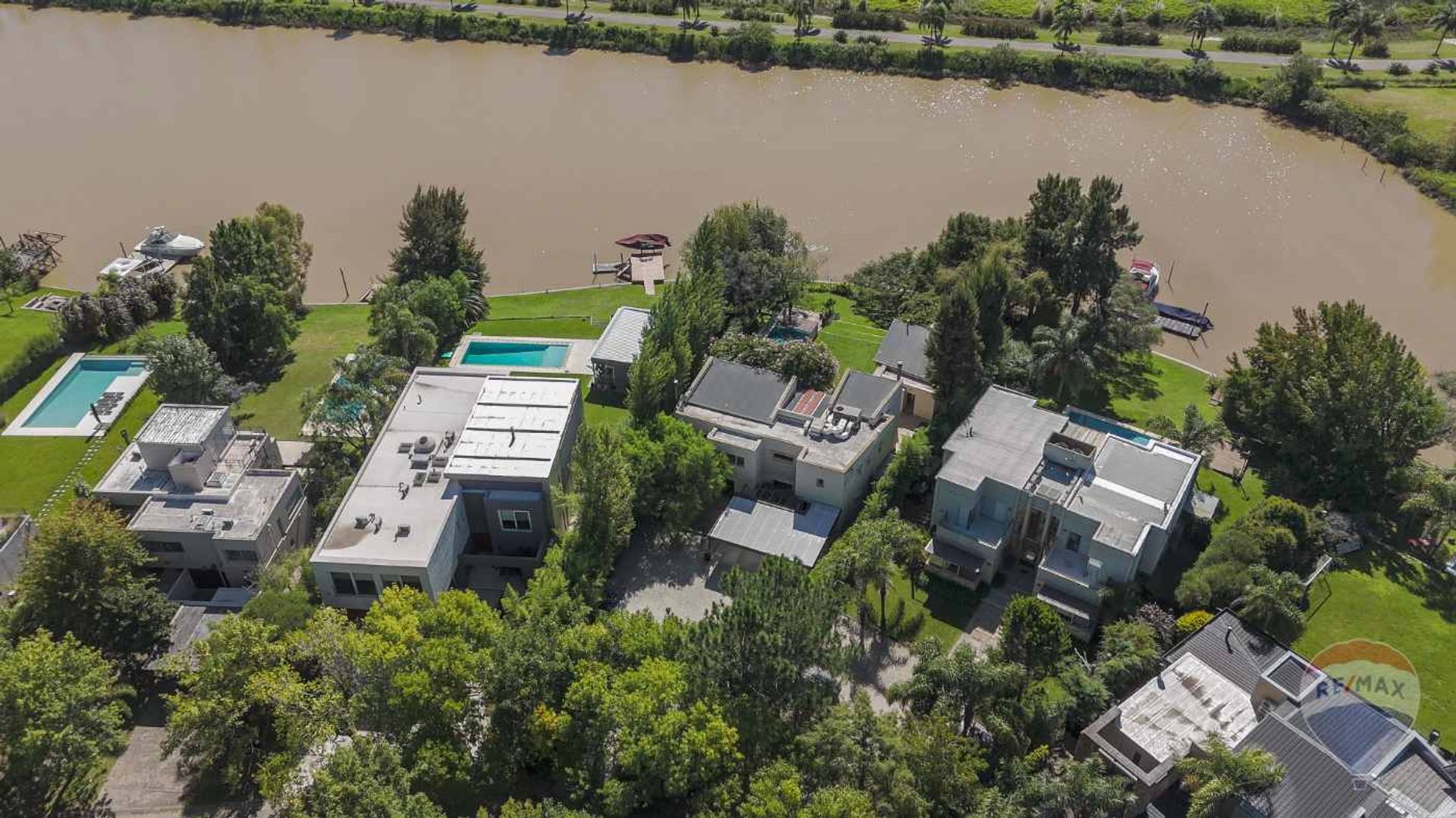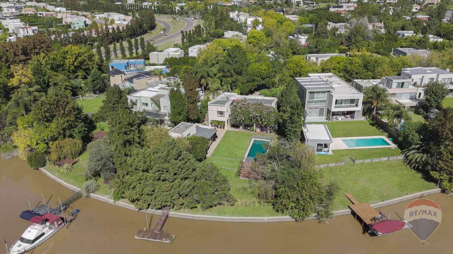 El exterior incluye un jardín parquizado con riego automático, muelle con amarra propia y 36 m de costa al espejo de agua, un quincho con parrilla, cocina, baño completo y una habitación, una pileta climatizada sin fin, generador eléctrico y dos cocheras bajo pérgola con espacio para aproximadamente 10 autos.