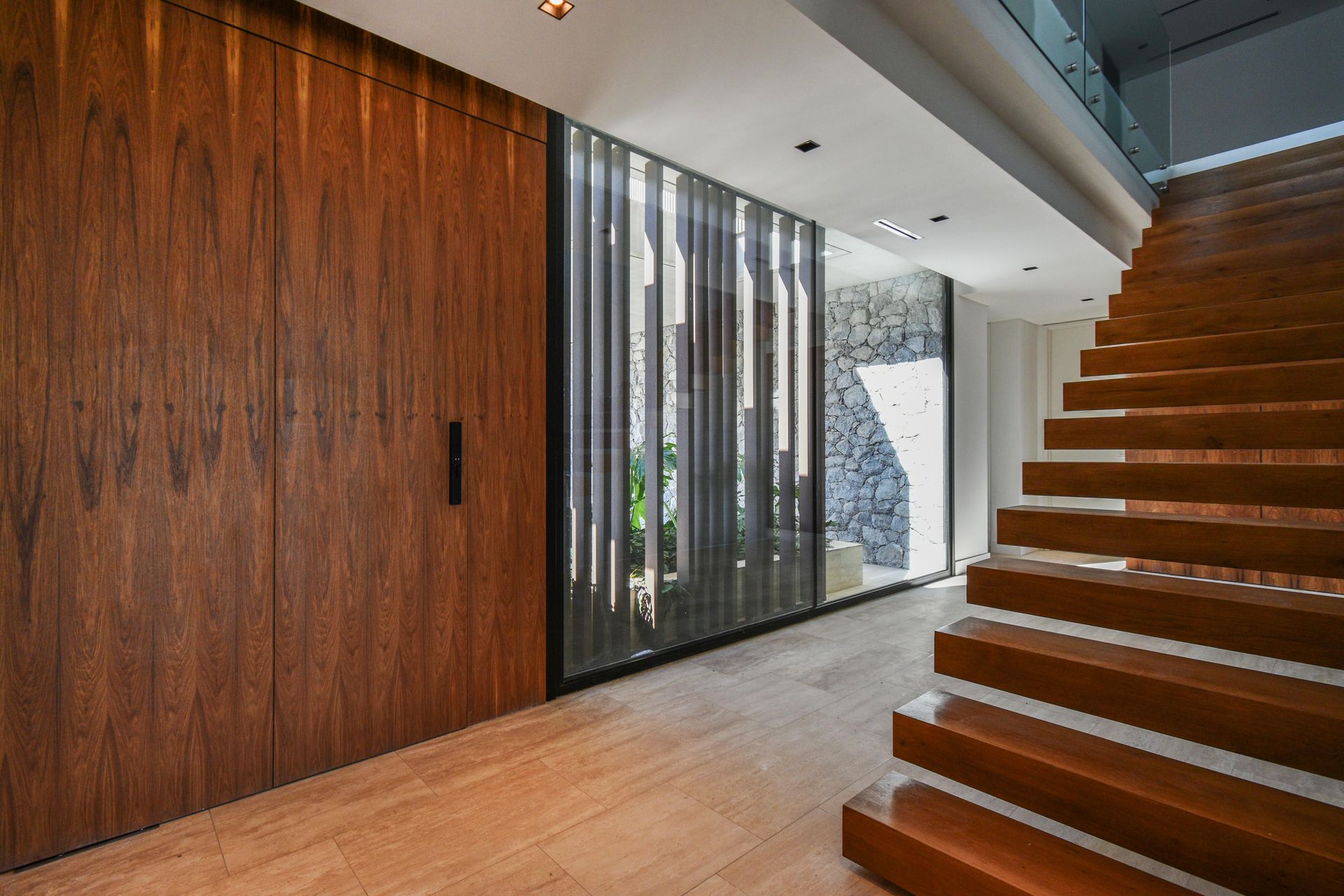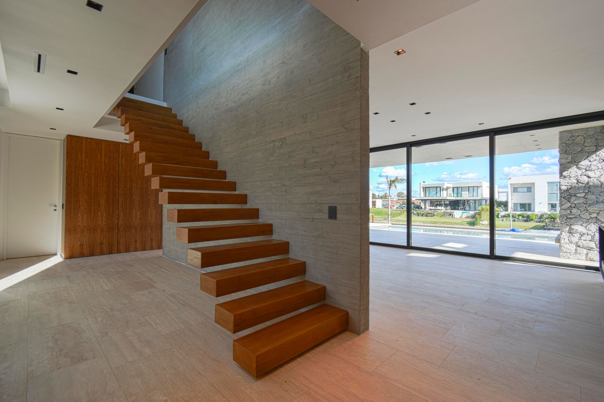 En la planta baja, la entrada se abre a un hall de recepción con placard, toilette y un amplio living‑comedor que se abre a grandes ventanales con vista al río. El piso de mármol travertino a la veta y el hogar de alta calidad ofrecen un ambiente de elegancia. La cocina integrada dispone de mesada Dekton (Kelya) y muebles enchapados en incienso natural, equipados con heladeras, freezers, hornos, anafe a gas de 5 hornallas, microondas y cava winefroz. Un lavadero y área de servicio con entrada independiente complementan la funcionalidad. Las aberturas Rehau Black Brown de PVC con DVH garantizan aislamiento térmico y acústico. El sistema de calefacción por loza radiante, caldera dual y termotanque aseguran confort en todo momento, mientras que cuatro equipos de aire acondicionado central de baja silueta distribuyen el aire de forma eficiente. Un cuarto en la planta baja, con baño completo y placards, ofrece versatilidad para usos múltiples. Todas las puertas interiores son de madera de piso a techo.