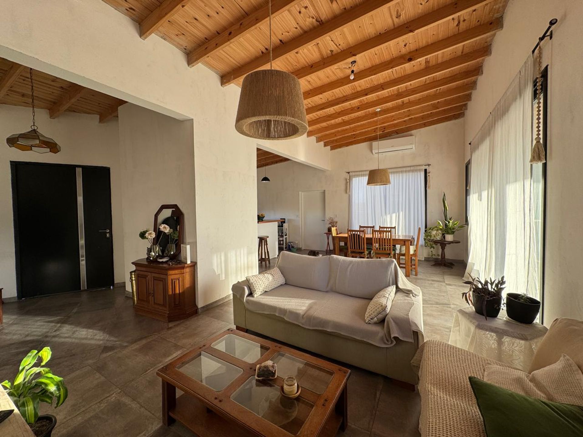 Casa de 4 ambientes desarrollada totalmente en una sola planta. Al ingresar se abre un hall de recepción que conduce a un amplio living comedor de 7,50 x 3,50 m, con ventanal de doble vidrio hermético que permite la entrada de luz natural y la apertura a una galería que conduce al jardín. El piso está revestido en porcelanato, la zona cuenta con una salamandra a leña y un sistema de aire acondicionado tipo split F/C. La disposición de las ventanas garantiza vistas al jardín y una iluminación excelente.