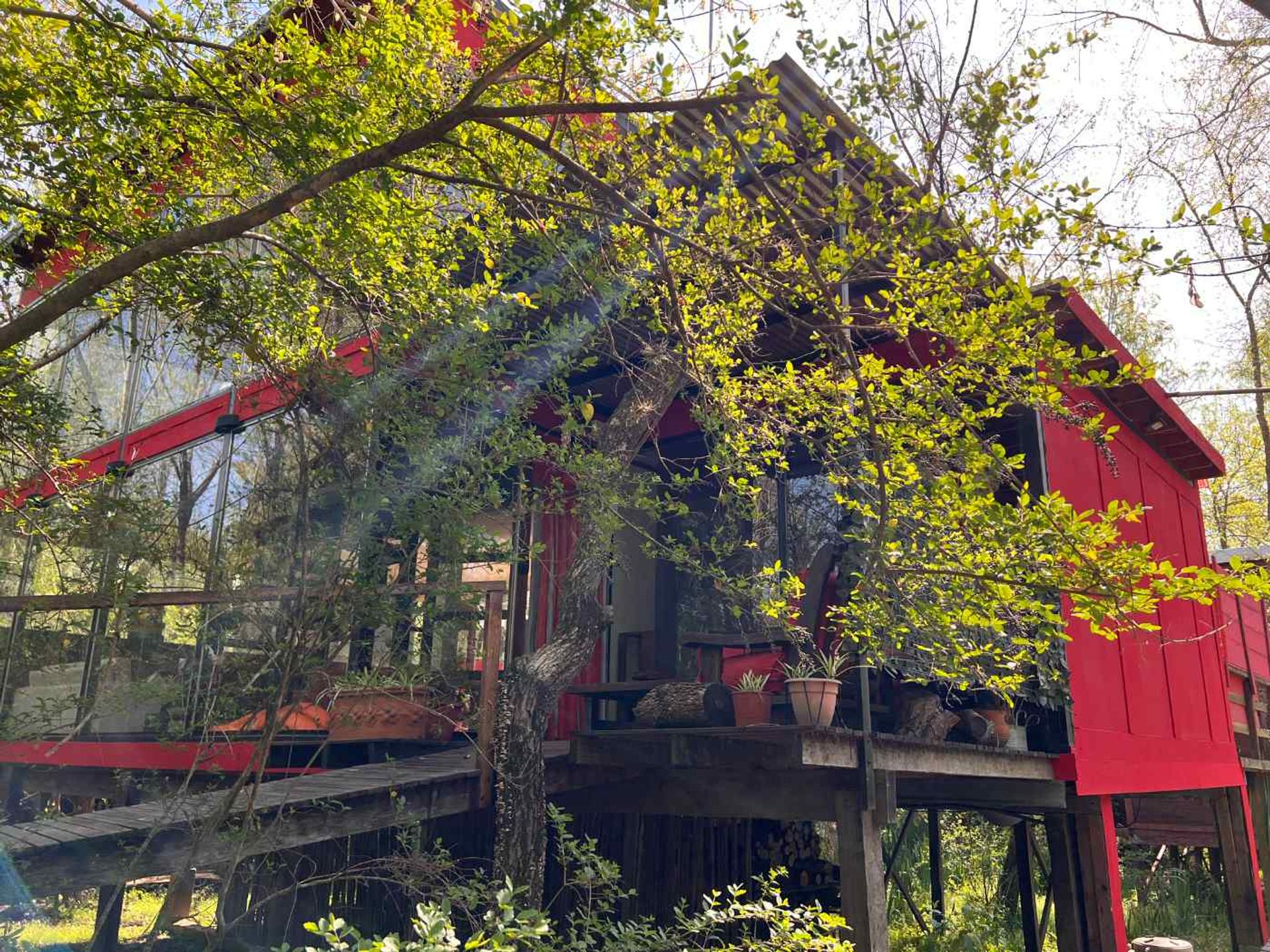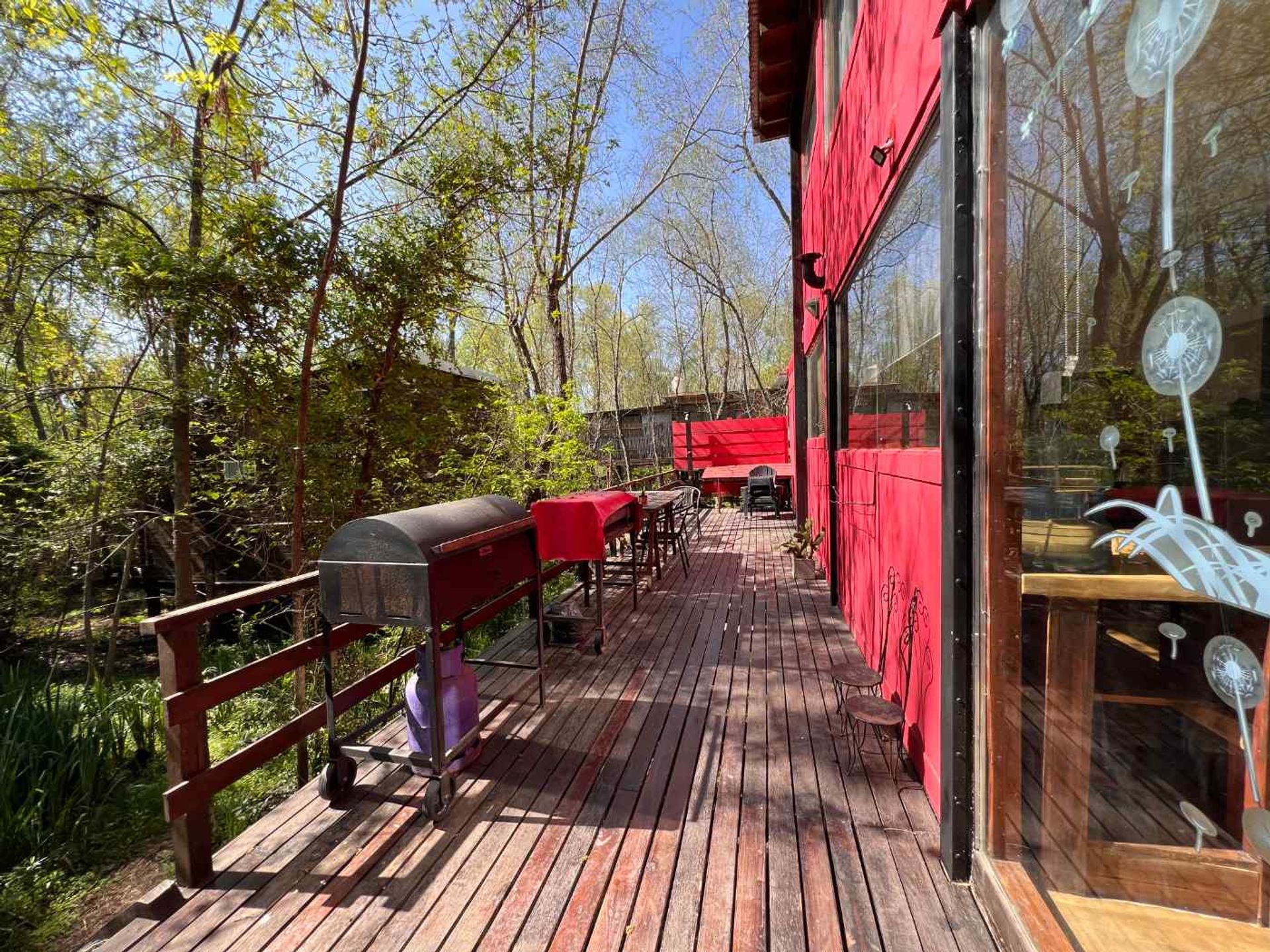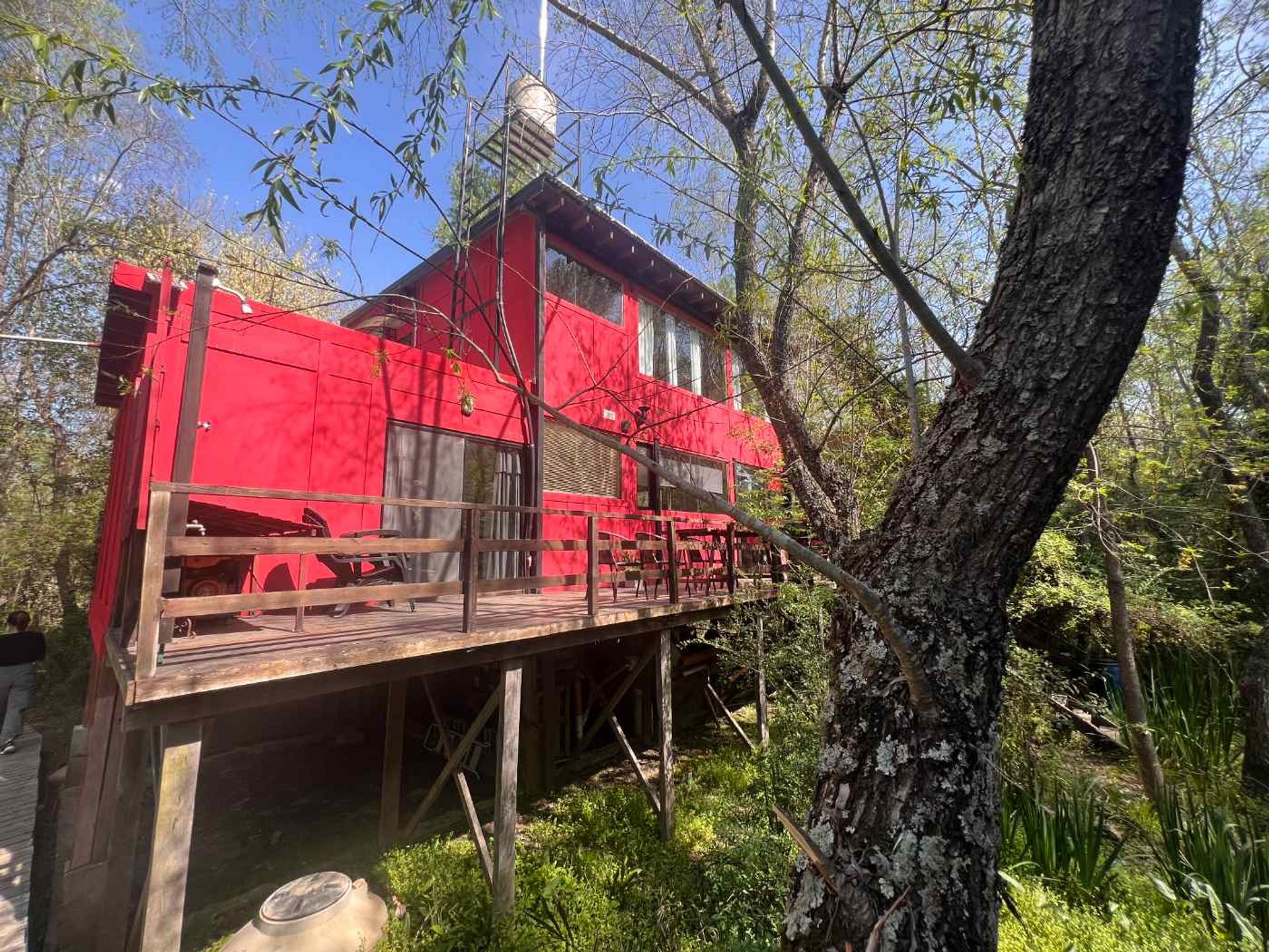La casa principal, actualmente destinada a alquiler temporal turístico, se desarrolla en dos plantas. Al entrar se aprecia una amplia planta de doble altura que alberga un luminoso living‑comedor con cocina integrada, horno eléctrico y anáforas de inducción. Desde la cocina se accede a una extensa galería con ducha. La superficie cubierta asciende a 140 m², complementada por 70 m² de decks y muelle.