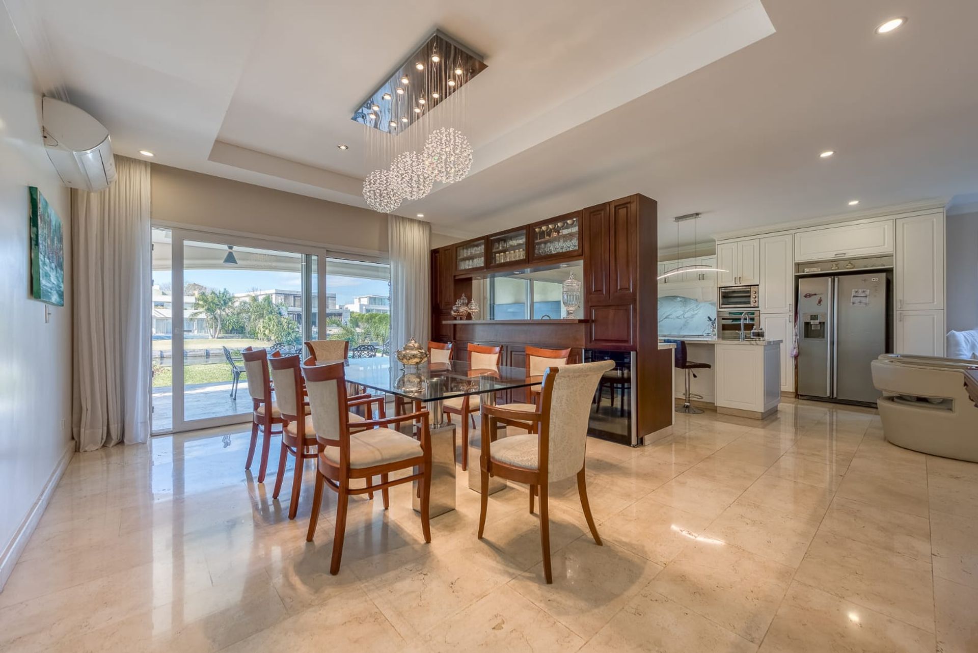 En la planta baja se encuentra un hall de acceso que conduce a un dormitorio en suite y a los espacios comunes: un living‑comedor con hogar a bioetanol, paredes con boiserie y grandes ventanales que miran hacia la galería. La galería, doble y sectorizada, incluye parrilla, anafe doble a gas y horno exterior, y se conecta al deck y a la piscina con borde infinito que abre al lago. La cocina dispone de mesadas de Neolith, muebles laqueados y amplio espacio de guardado. También en este nivel se ubican un toilette, una dependencia y un baño de servicio contiguo a un lavadero cómodo.