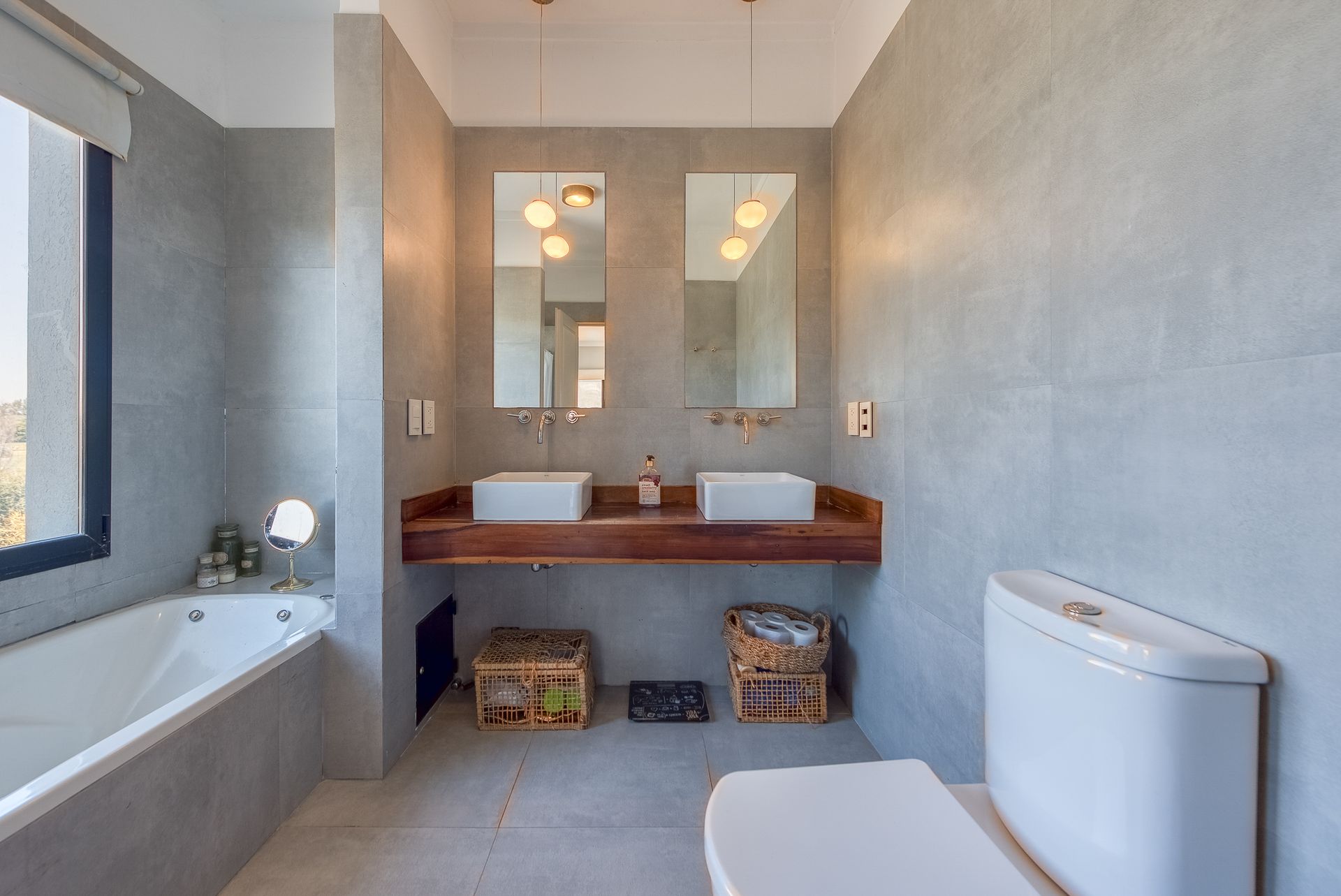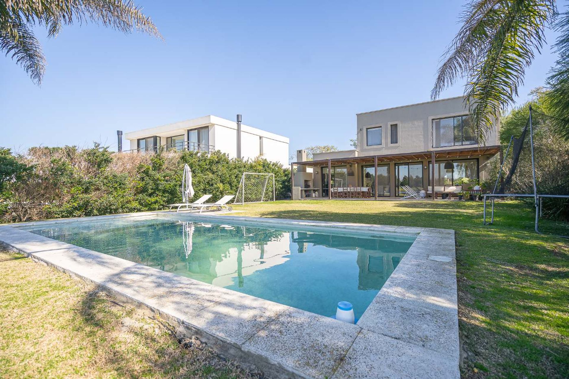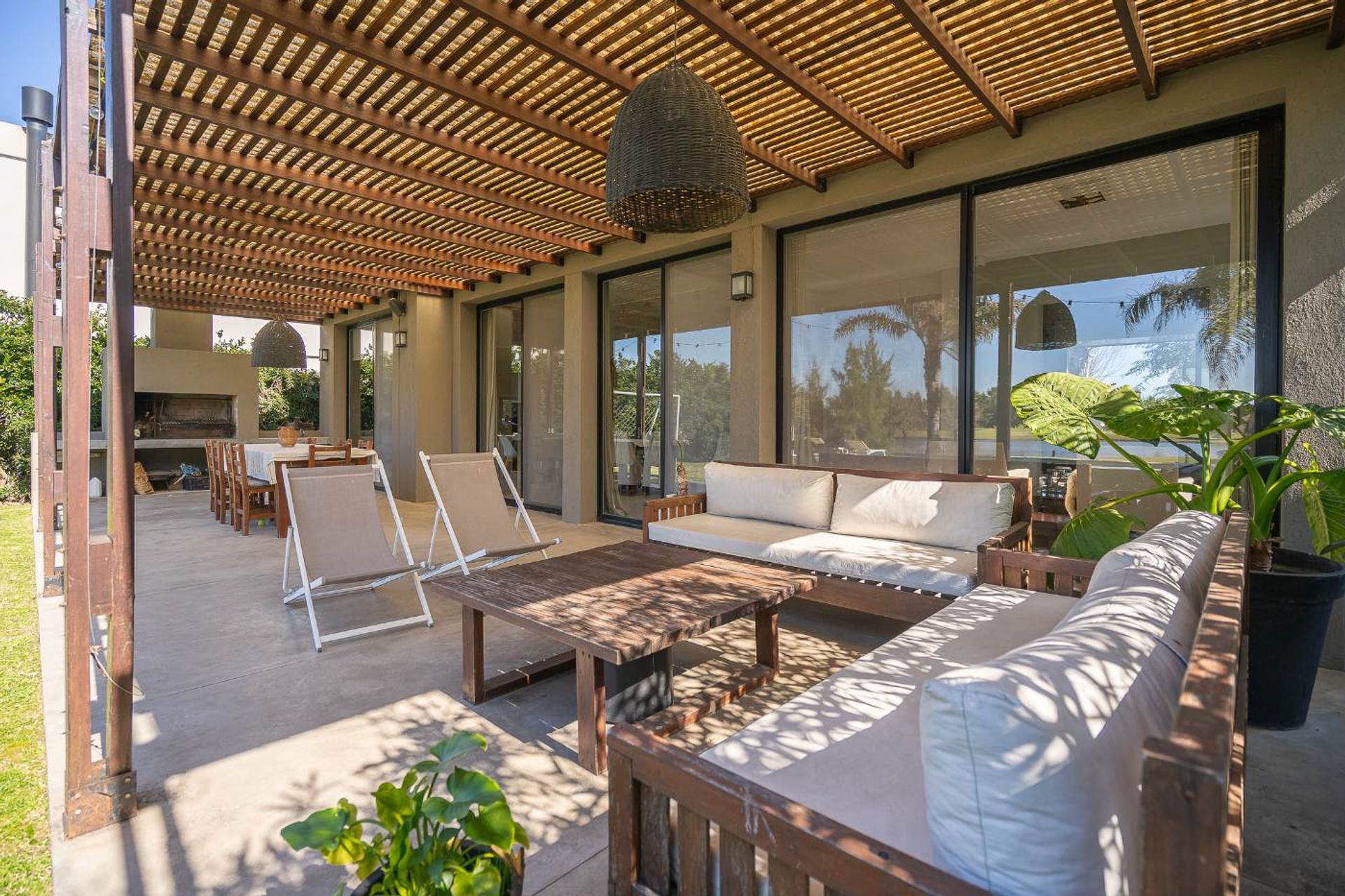 La vivienda, de dos plantas y estilo moderno, se distingue por su jardín con palmeras y una piscina con vista abierta al golf. En la planta baja se encuentran el hall de entrada, toilette de recepción, living, comedor, playroom, cocina con desayunador, lavadero, baño de servicio o de piscina y una galería con parrilla. La planta alta alberga la suite principal con vestidor, baño con hidromasaje y ducha separada, además de un segundo dormitorio que puede funcionar como oficina.