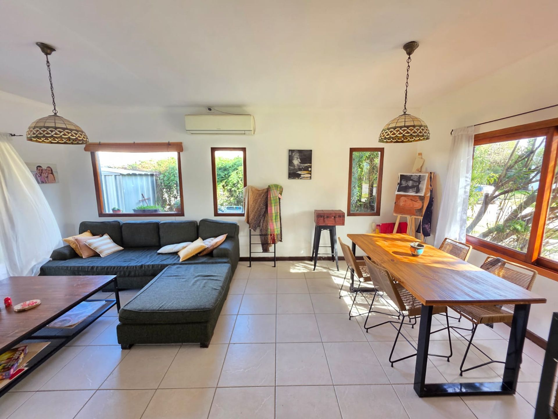 En la planta baja se encuentra un amplio espacio descubierto con capacidad para cinco autos, un hall de ingreso, un toilette de recepción y un living‑comedor con aire acondicionado. La cocina independiente se abre a un comedor amplio y luminoso, mientras que el quincho cerrado, equipado con parrilla y espacio de guardado, cuenta con ventanales que ofrecen una vista encantadora hacia el jardín. Una galería semicubierta con techos de madera complementa la zona de ocio, y el jardín, con grama bahiana, riego automático por aspersión y una piscina cercada con solarium, invita a relajarse al aire libre. Un baño exterior completa la planta baja.