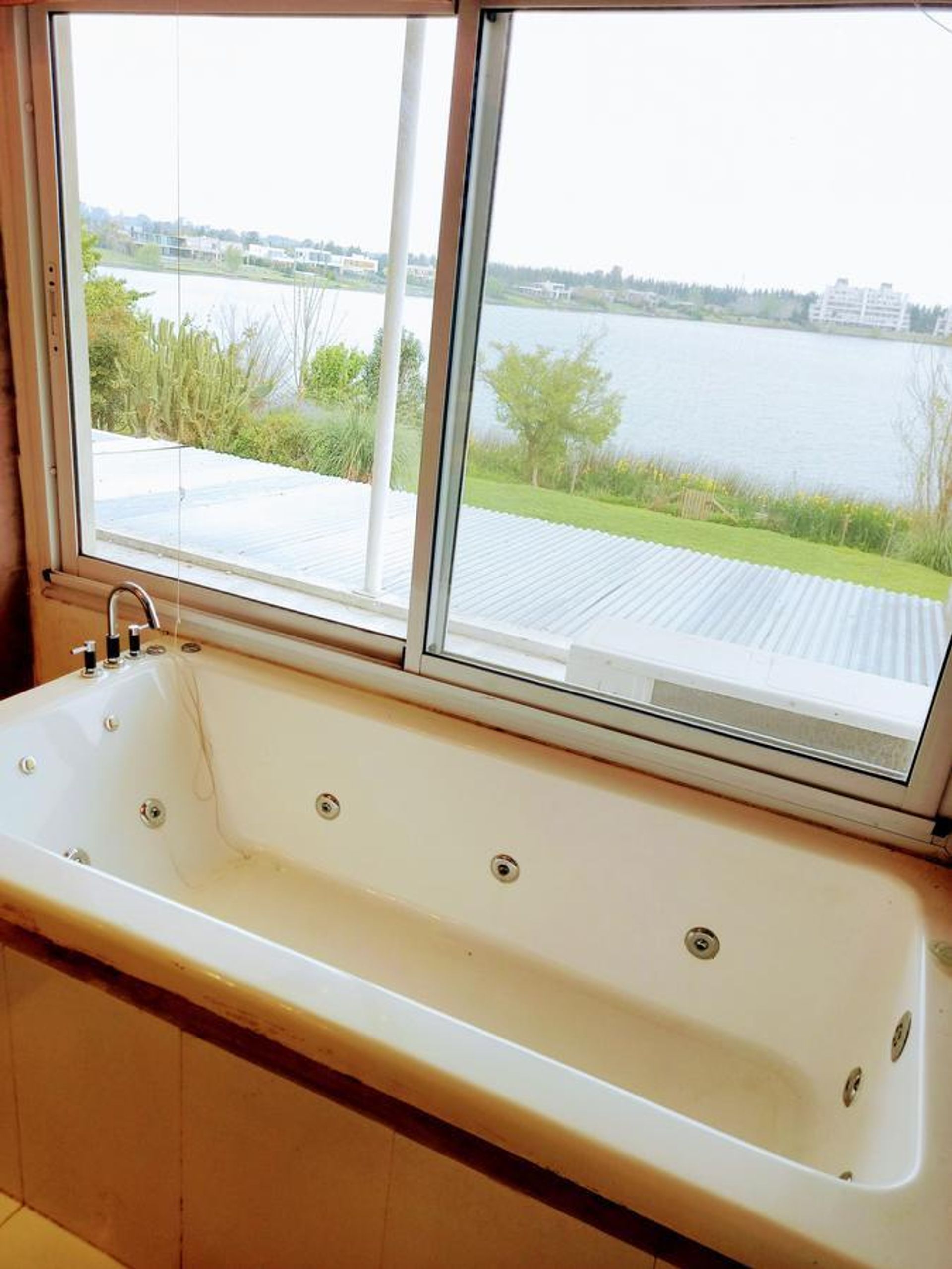 El lote, de 1000 m², ofrece 240 m² cubiertos, 30 m² de superficie semi cubierta (quincho) y un jardín espectacular que se integra con la laguna. La distribución interior está pensada para brindar confort y estilo: en la planta baja se encuentra un living comedor con cocina integrada y barra desayunadora de capacidad para diez personas, un toilette de recepción y dos habitaciones amplias, cada una con baño completo. La habitación de servicio también dispone de baño completo. En la planta alta se ubica una habitación en suite con vestidor, baño con ducha doble y hidromasaje, todo con vistas panorámicas a la laguna.