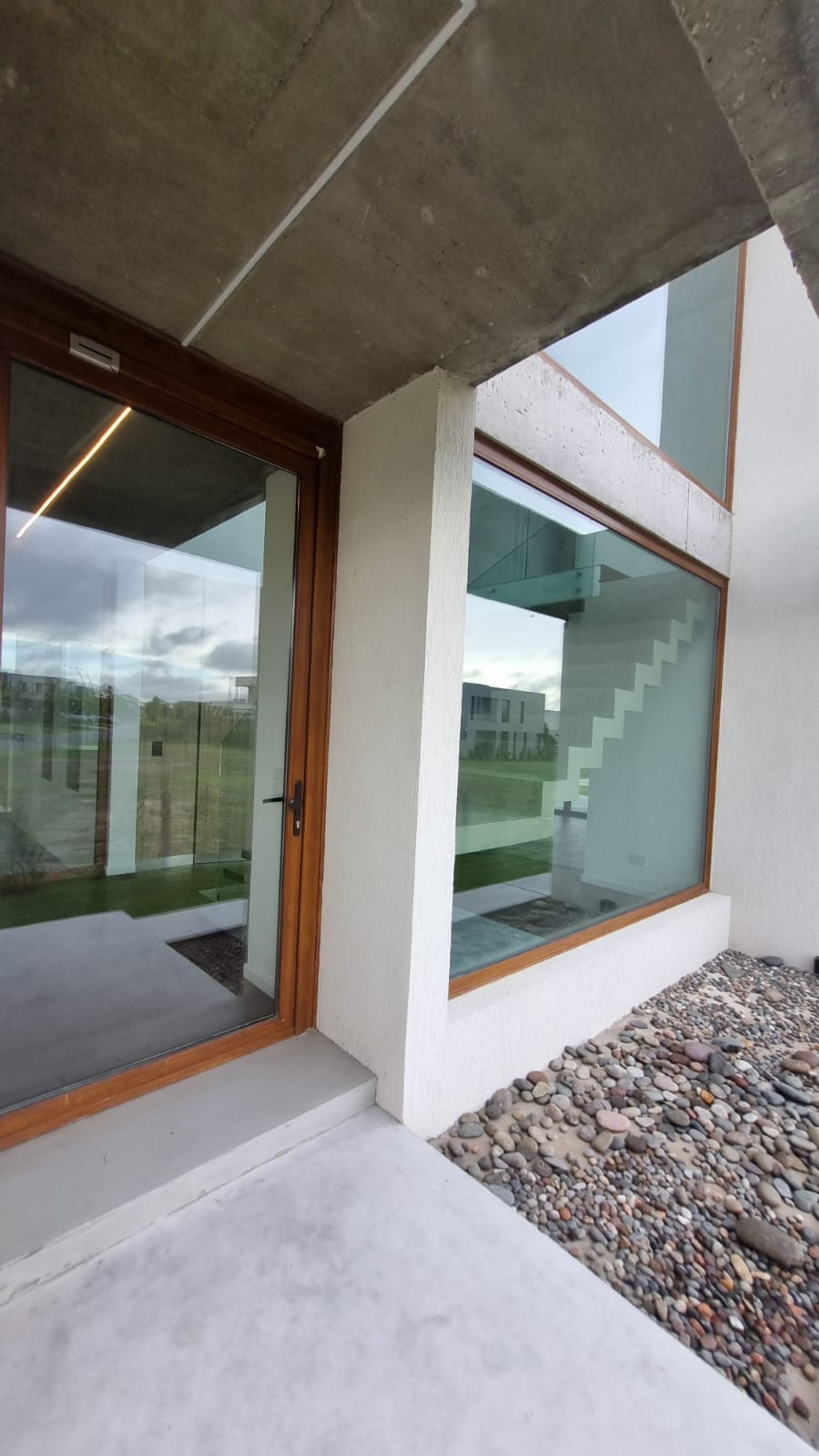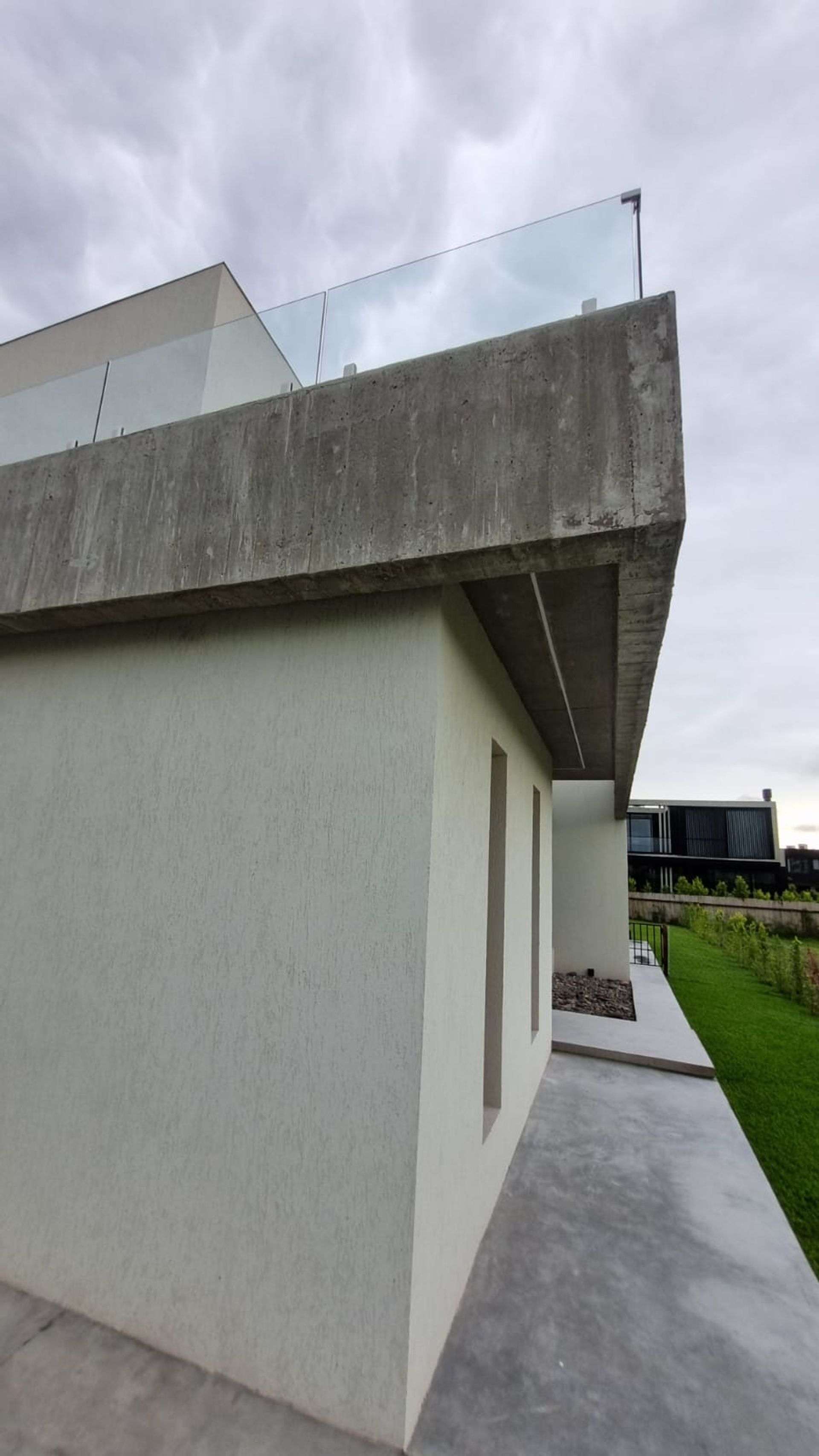 Casa de dos plantas con diseño contemporáneo y alta calidad constructiva. Construida sobre un lote de 580 m², con 270 m² cubiertos y 48 m² semi cubiertos. La fachada combina hormigón, hierro y madera, con líneas rectas y un gran voladizo que aporta solidez y elegancia.
