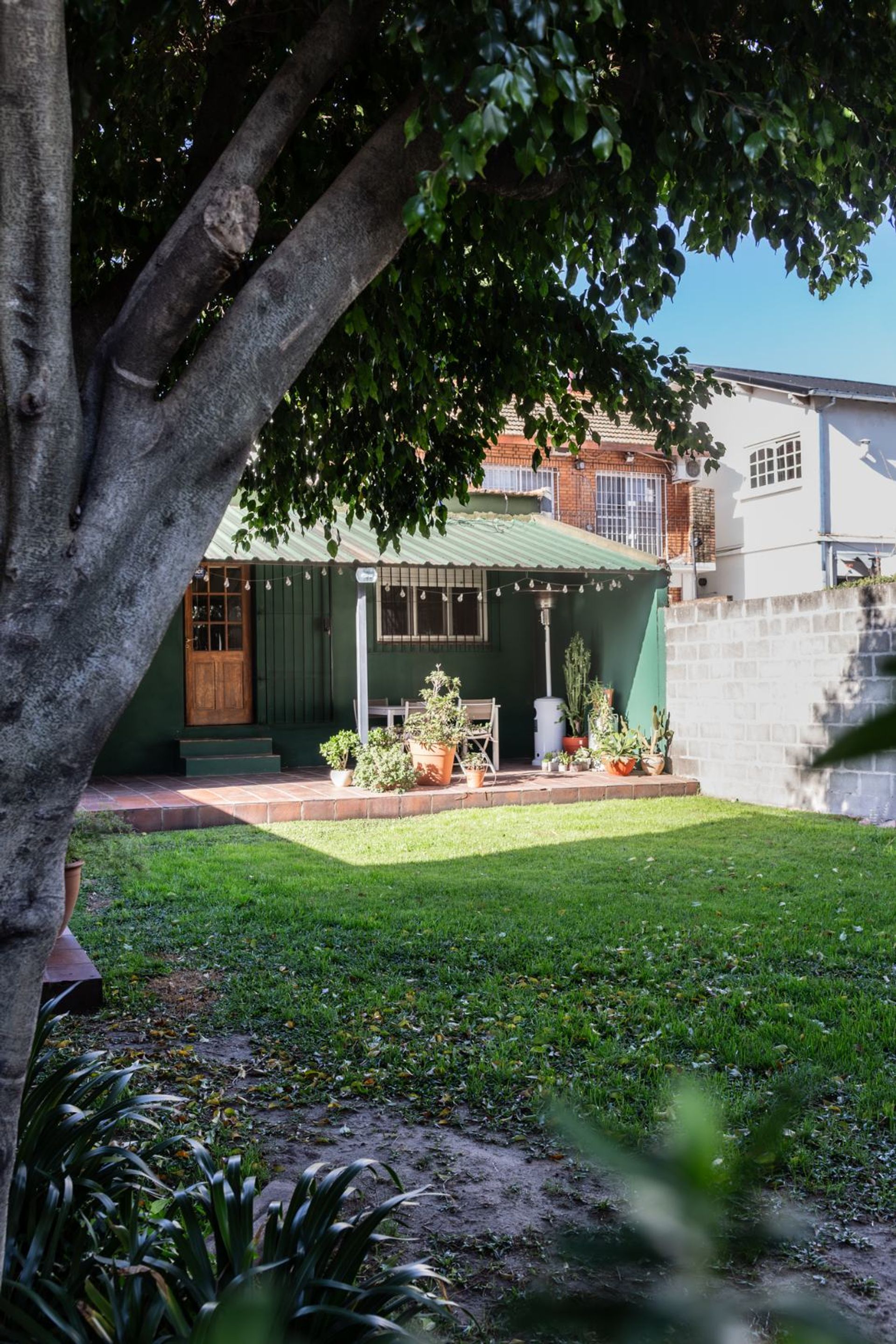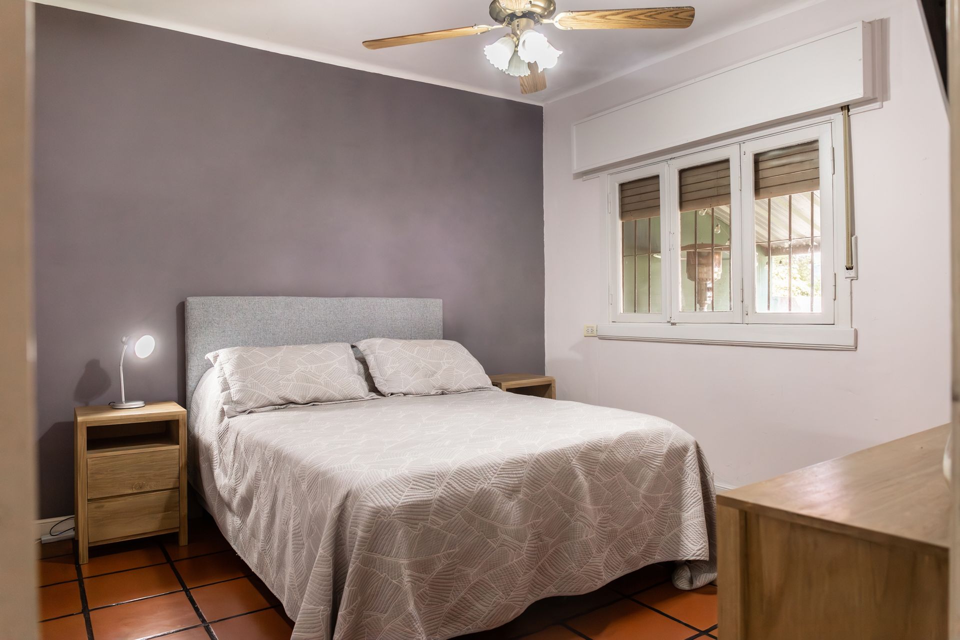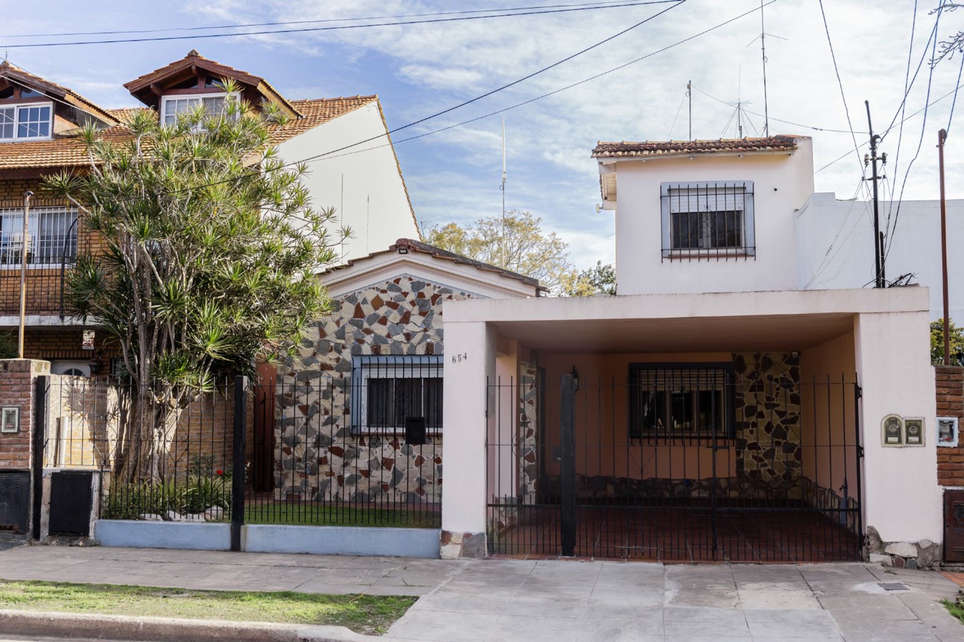 La casa principal, orientada al este, cuenta con jardín delantero y garaje cubierto para dos vehículos pequeños. En la planta baja se distribuyen cuatro ambientes: un amplio living‑comedor con pisos cerámicos, techos machimbrados y ventanal que ofrece vista al jardín; un family/estar‑escritorio; una cocina‑comedor con muebles altos y bajos de melamina y mesada de granito, aire acondicionado split y ventanales que dan al patio y al pasillo; y un baño completo con ducha. Los dos dormitorios de la planta baja disponen de ventanales, uno con placard y aire acondicionado de ventana. En la planta alta se ubica un tercer dormitorio con placard, aire acondicionado split y ventanal que da a la calle, accesible mediante una escalera ubicada en el family. También se incluye un lavadero independiente. Desde la cocina se accede al patio con parrilla y a un jardín de 8,66 × 14 m, donde se encuentra un cuartito de guardado o galpón.