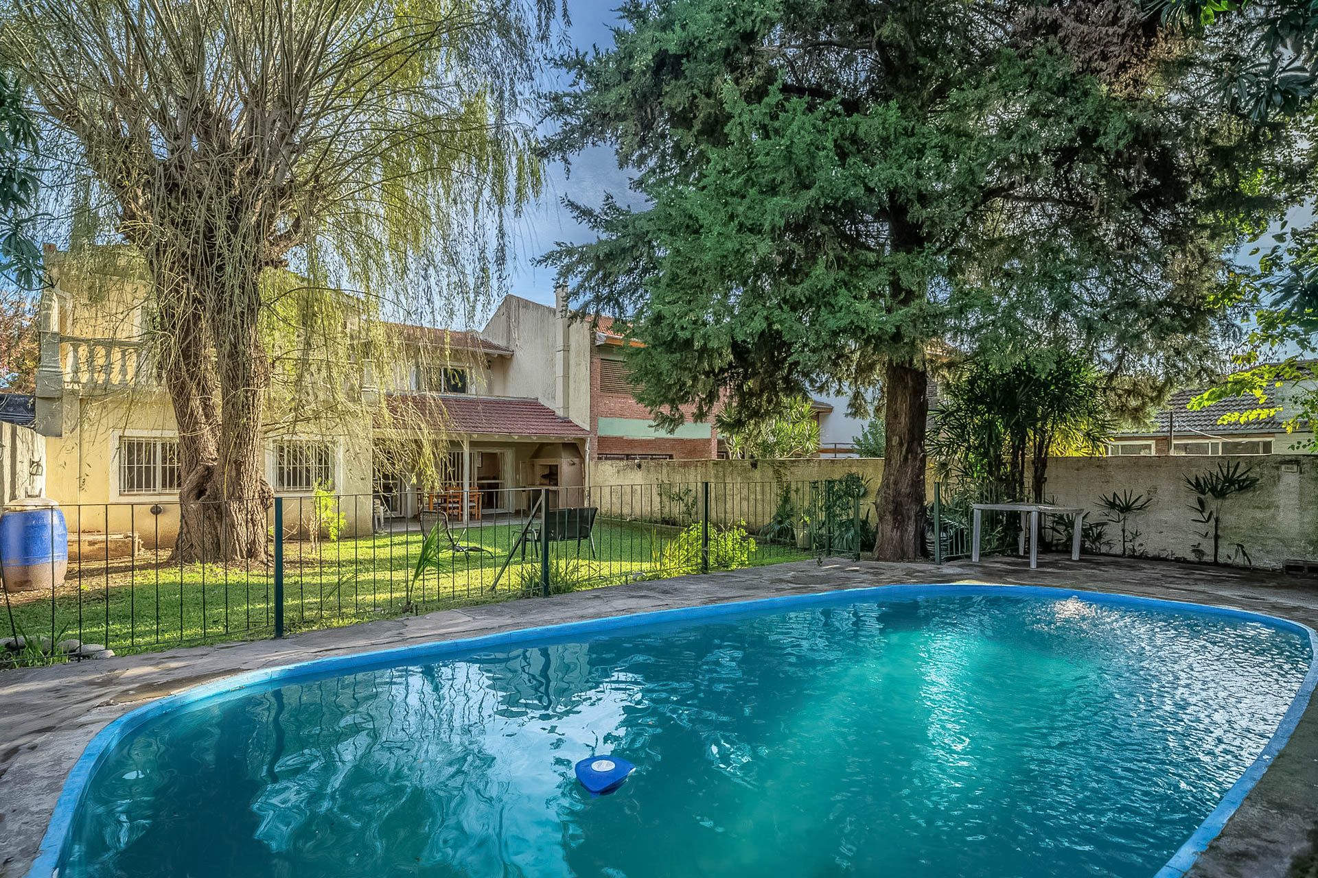 En la planta baja se encuentra un jardín frontal que retira la propiedad de la línea municipal, un living‑comedor de generosas dimensiones, una cocina totalmente equipada con muebles bajo y sobre mesada, comedor diario y barra desayunadora. Además dispone de baño completo, lavadero independiente, dependencia de servicio con baño y una galería semicubierta con parrilla, todo ello complementado por el gran jardín con piscina que invita a la relajación y al entretenimiento al aire libre.